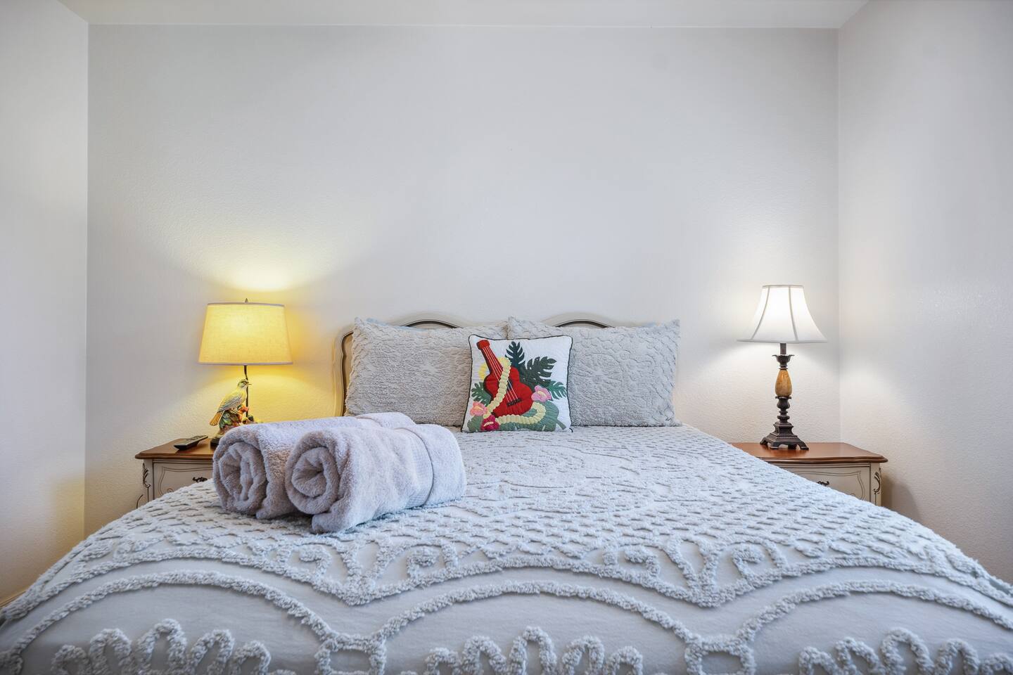 Master: King (sleeps 2) Bedroom 2: Queen (sleeps 2) Bedroom 3: Full (sleeps 2) Living room: Queen pull out sofa (sleeps 2) Total: Sleeps 8