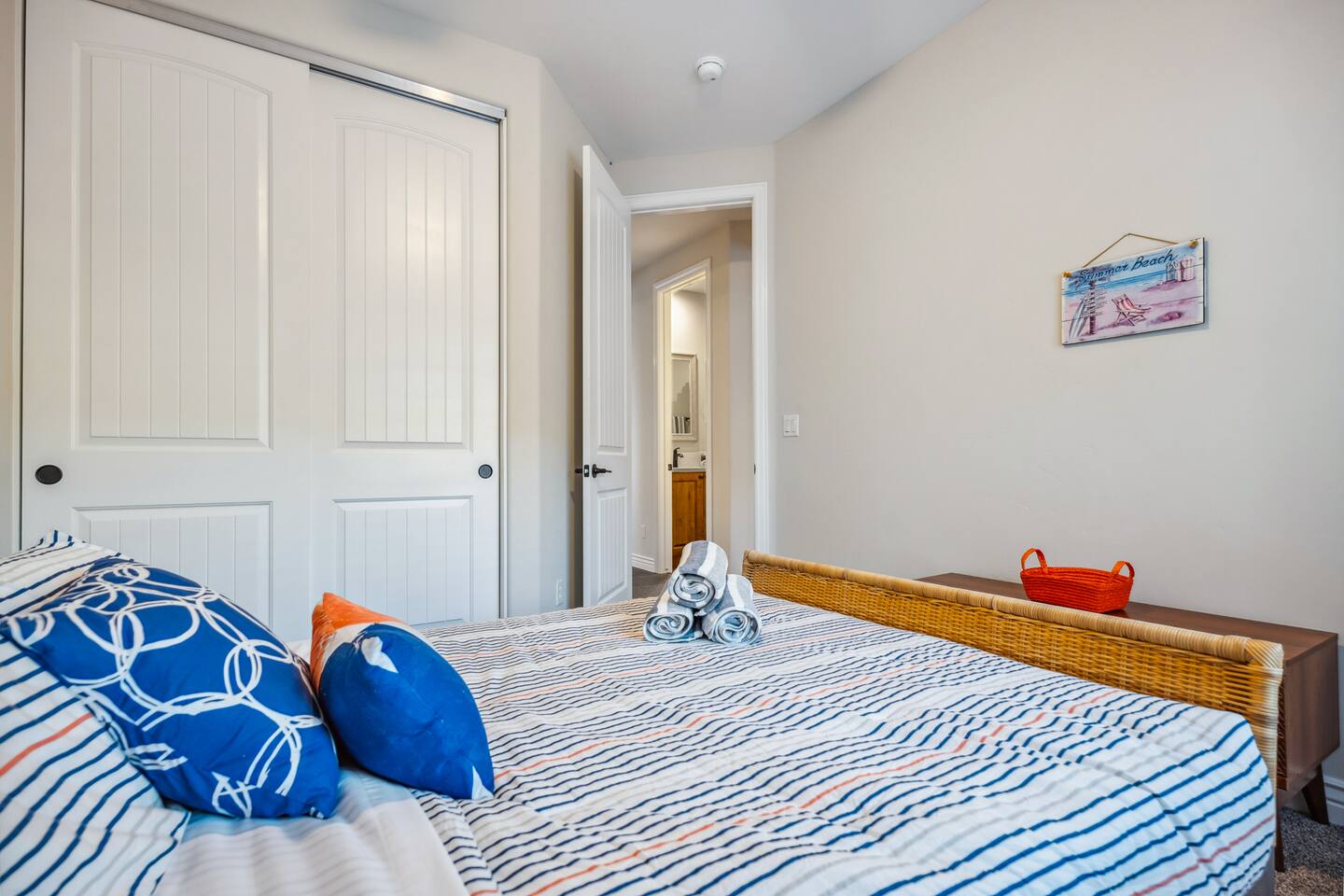 Our three bedroom home has the following bed layout: Master: California King (sleeps 2) Bedroom 2: Full (sleeps 2) Bedroom 3: (3) Twin beds (sleeps 3)