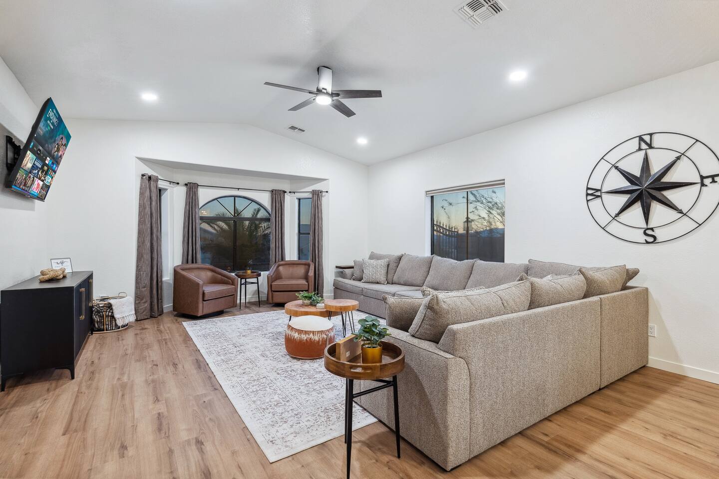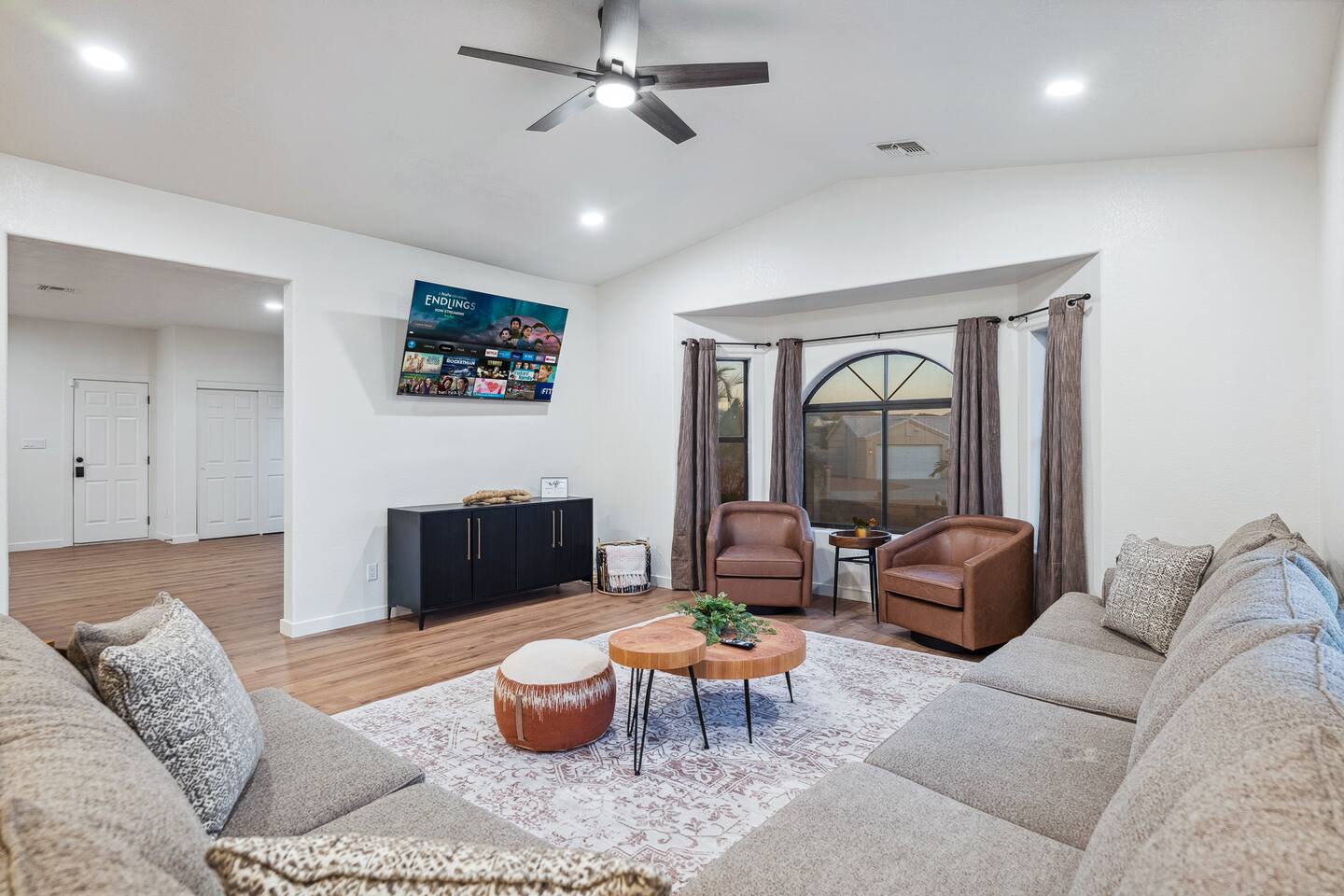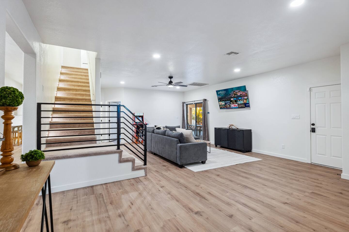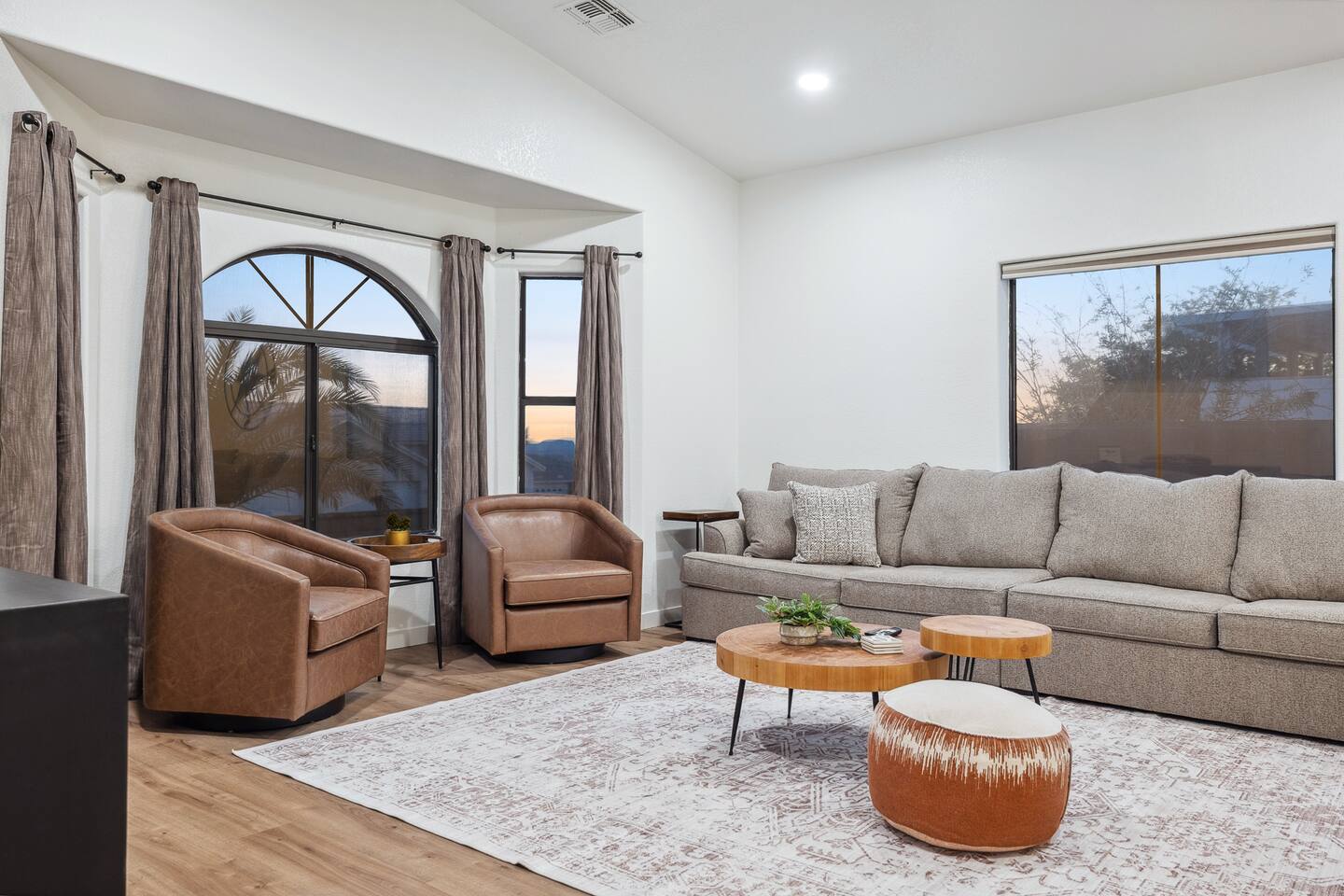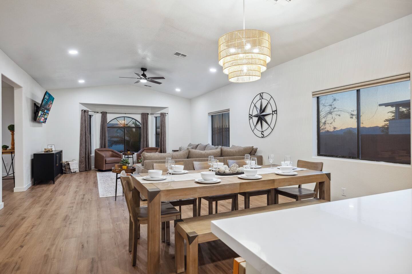 Bring the whole family to this great place with lots of room for fun in our modern-designed vacation home in Bullhead City, just minutes from Laughlin and Lake Mohave. Our spacious home has 5 bedrooms, comfortably sleeping up to 16 guests. Dual living areas features sleek furnishings, a gourmet kitchen, and large cozy sectional. Perfect for family gatherings or group getaways, our home combines style and convenience for an unforgettable stay.