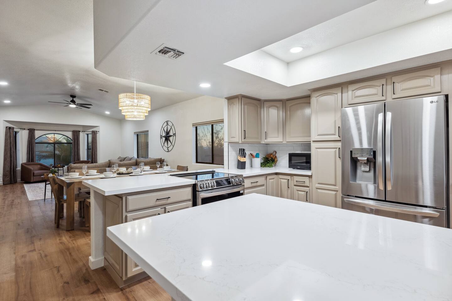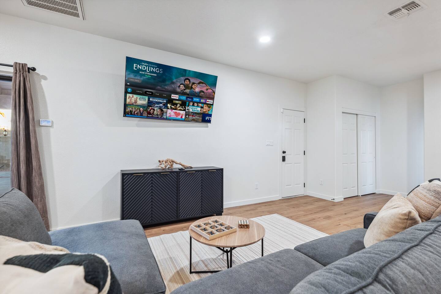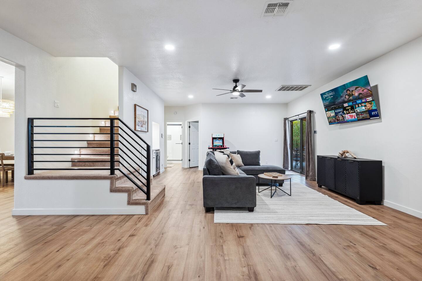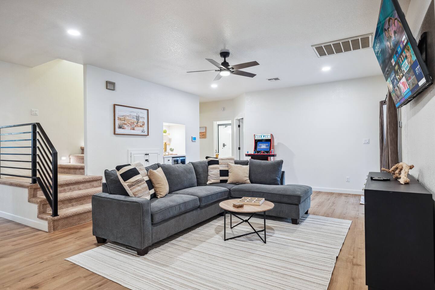 Bring the whole family to this great place with lots of room for fun in our modern-designed vacation home in Bullhead City, just minutes from Laughlin and Lake Mohave. Our spacious home has 5 bedrooms, comfortably sleeping up to 16 guests. Dual living areas features sleek furnishings, a gourmet kitchen, and large cozy sectional. Perfect for family gatherings or group getaways, our home combines style and convenience for an unforgettable stay.