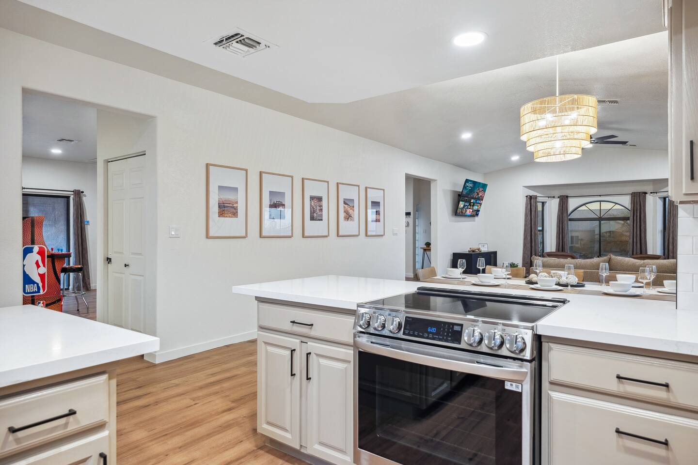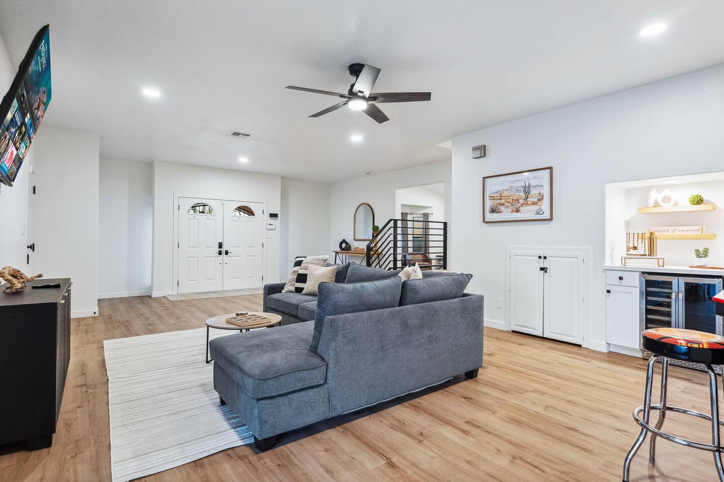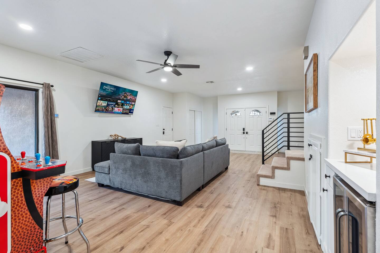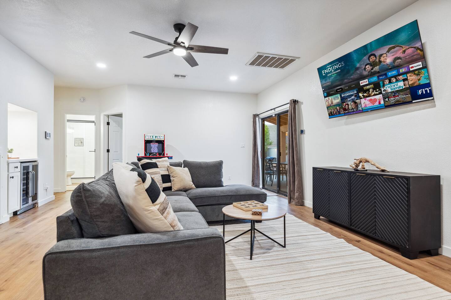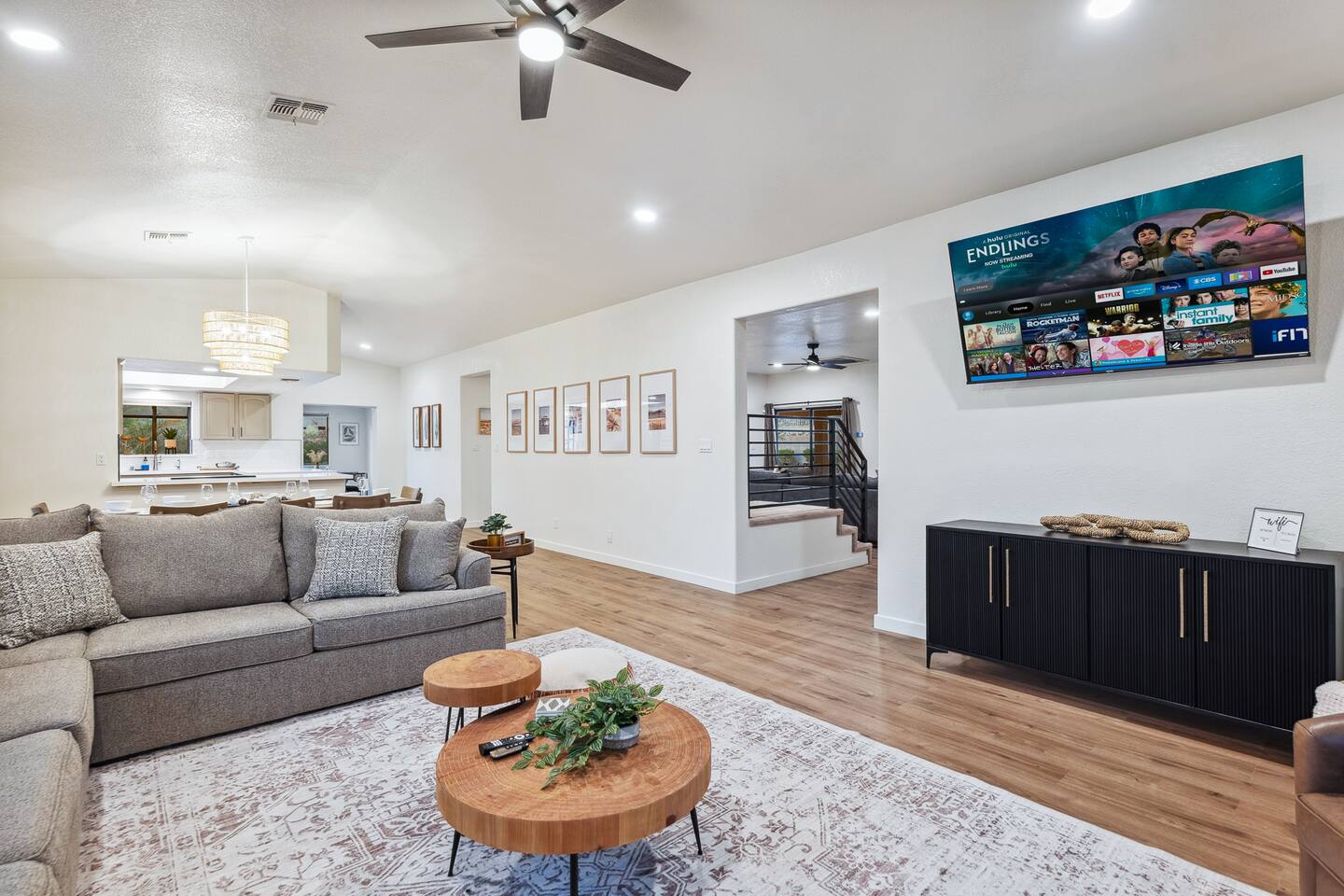 Bring the whole family to this great place with lots of room for fun in our modern-designed vacation home in Bullhead City, just minutes from Laughlin and Lake Mohave. Our spacious home has 5 bedrooms, comfortably sleeping up to 16 guests. Dual living areas features sleek furnishings, a gourmet kitchen, and large cozy sectional. Perfect for family gatherings or group getaways, our home combines style and convenience for an unforgettable stay.