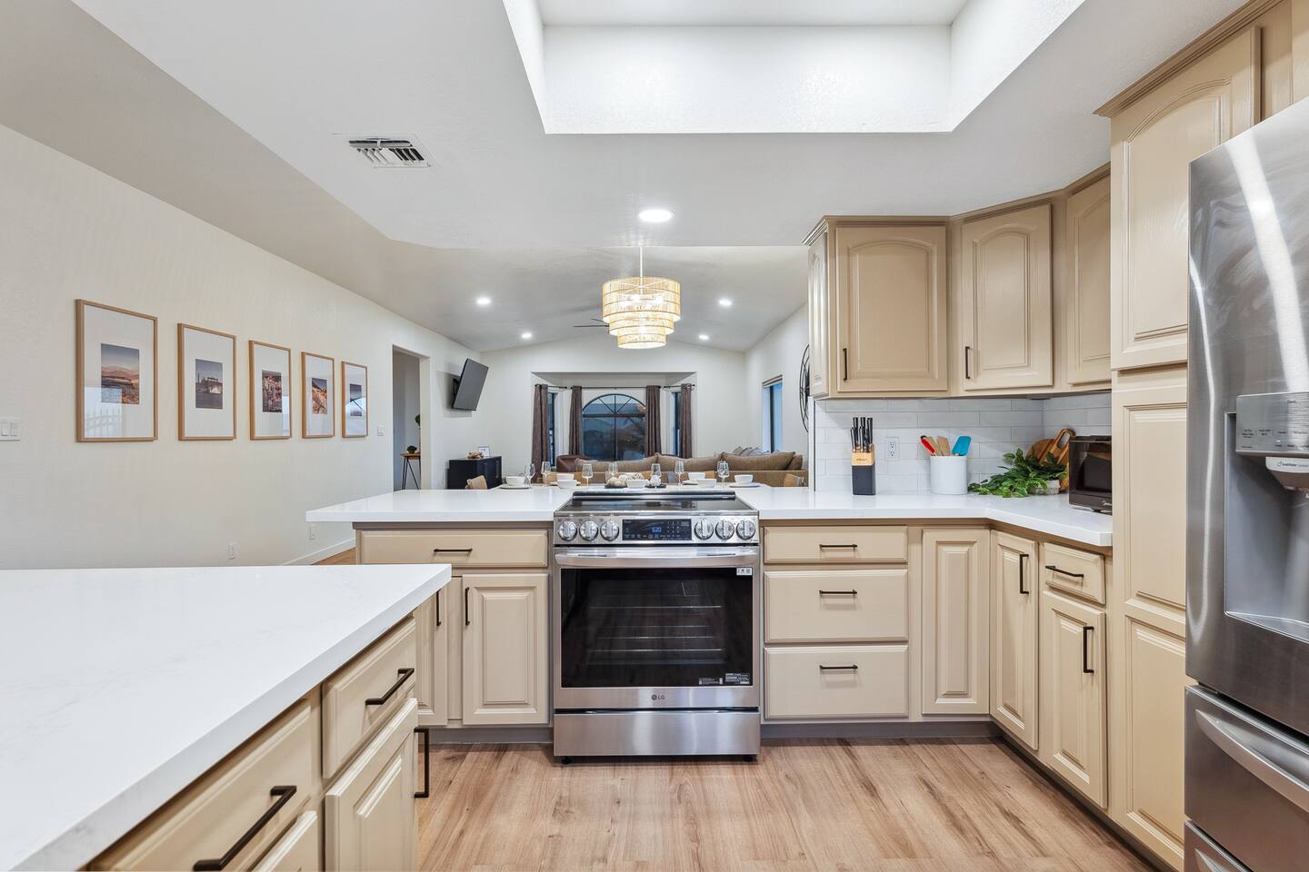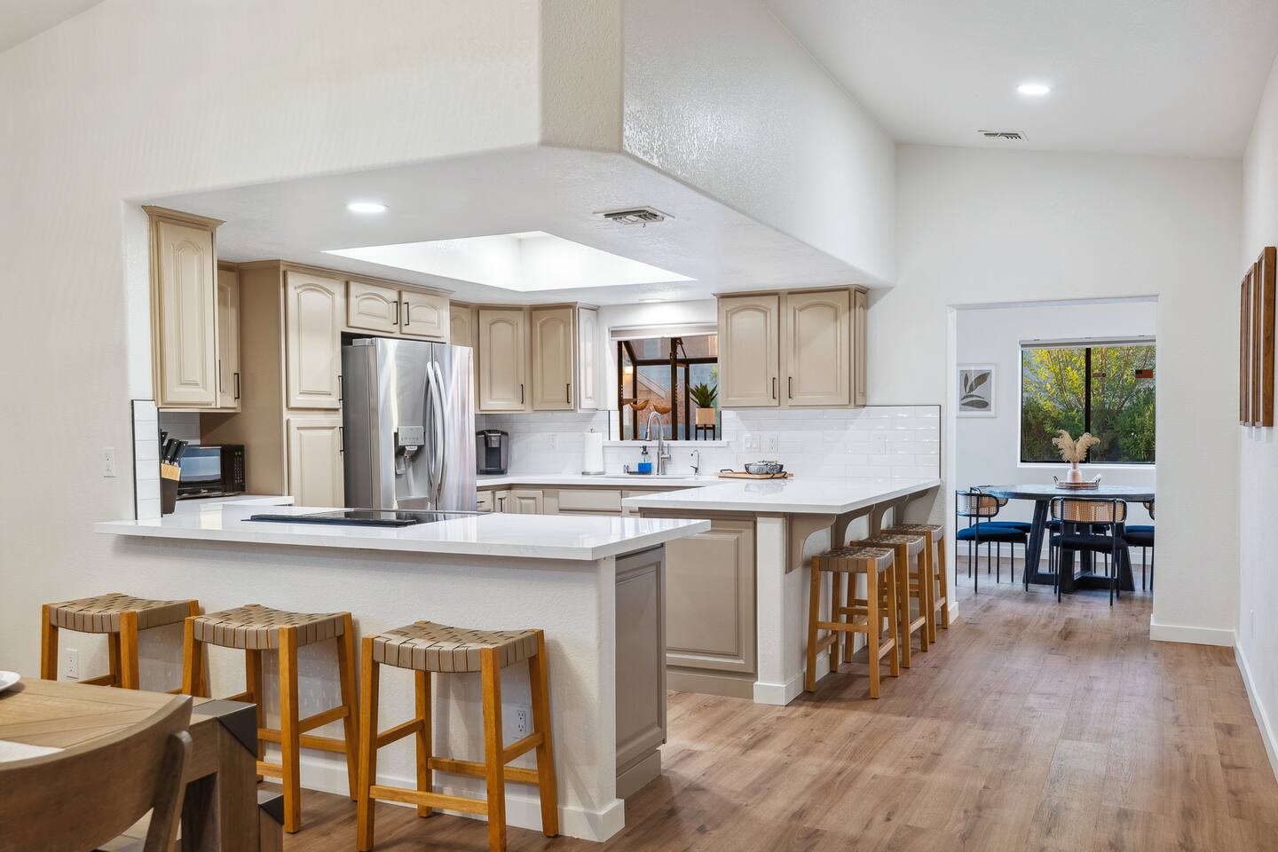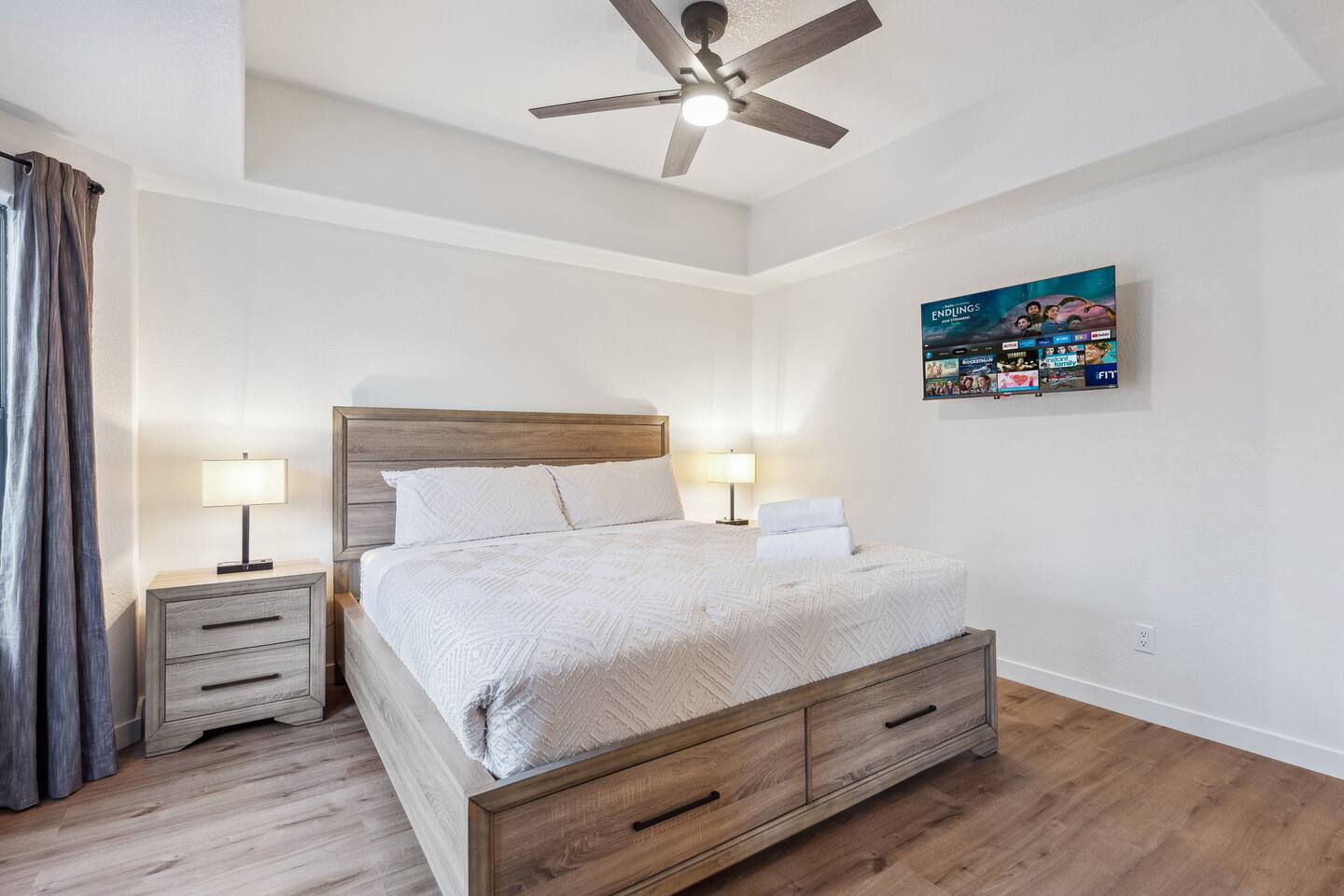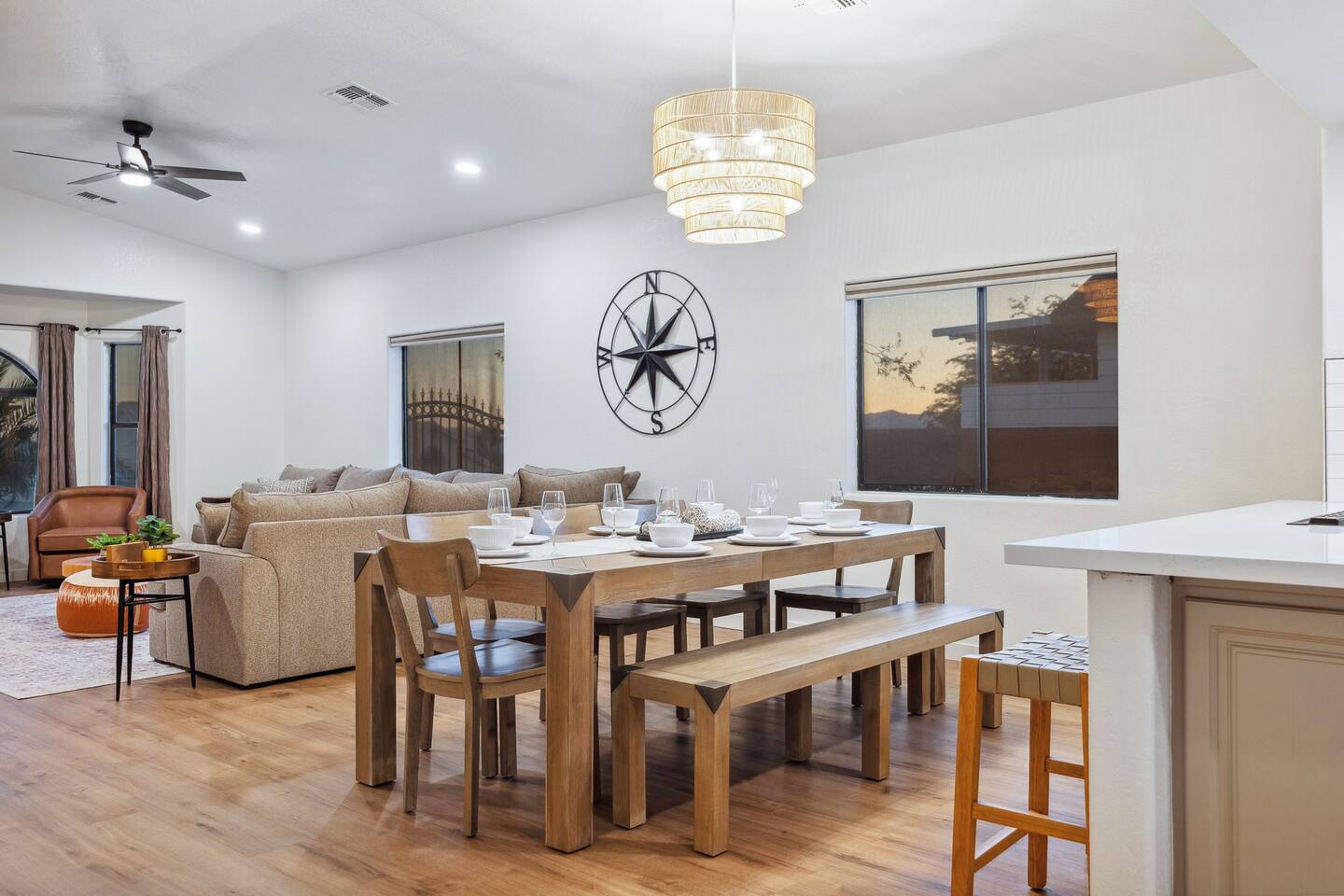 Bring the whole family to this great place with lots of room for fun in our modern-designed vacation home in Bullhead City, just minutes from Laughlin and Lake Mohave. Our spacious home has 5 bedrooms, comfortably sleeping up to 16 guests. Dual living areas features sleek furnishings, a gourmet kitchen, and large cozy sectional. Perfect for family gatherings or group getaways, our home combines style and convenience for an unforgettable stay.