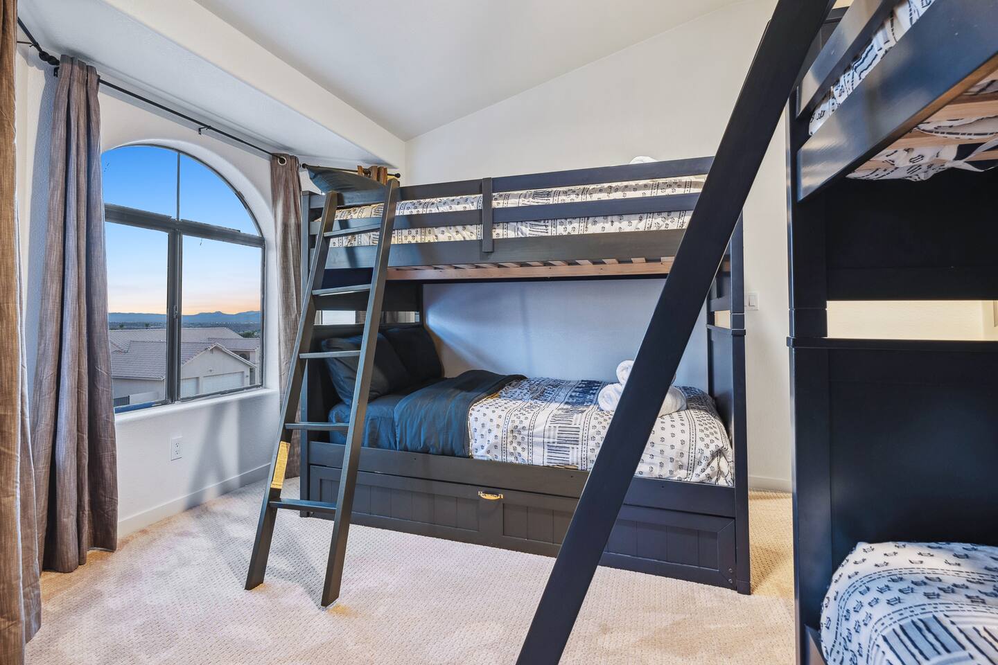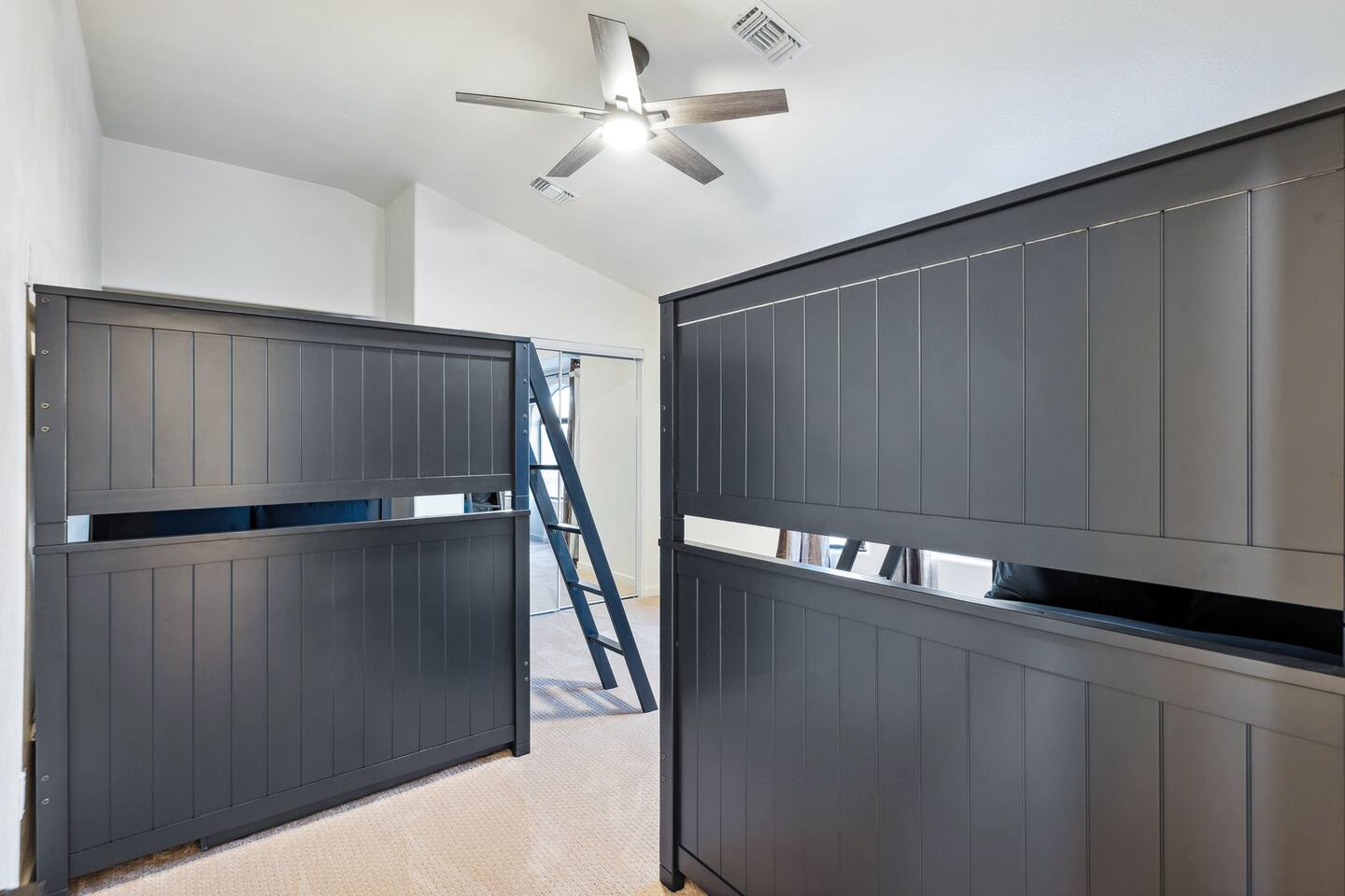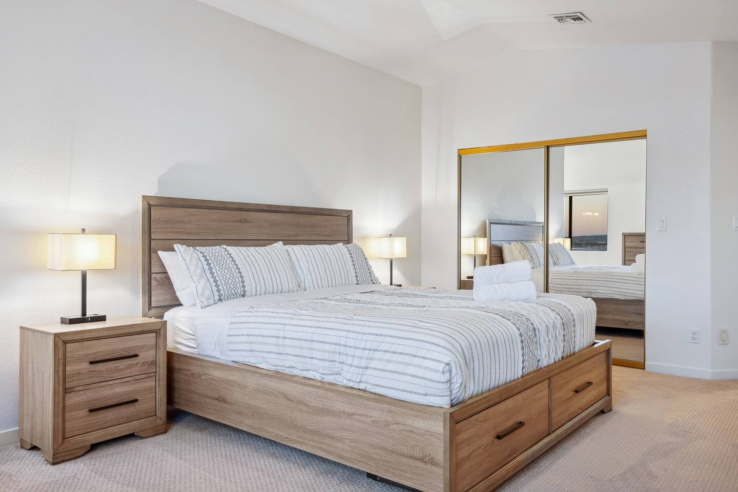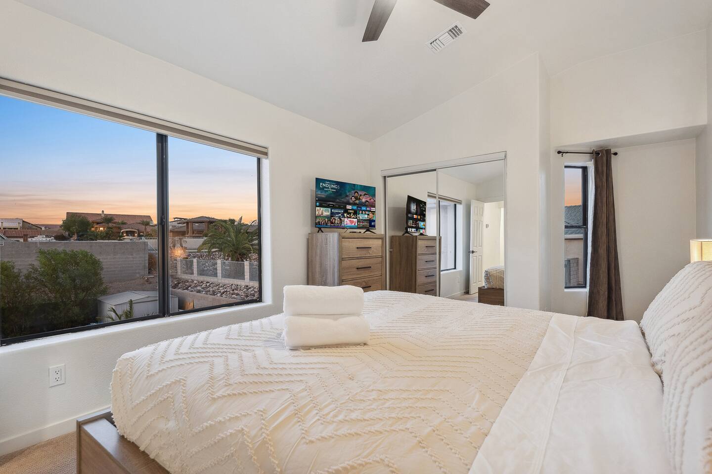 Located just minutes from both Laughlin and Kathrine's Landing in a quiet neighborhood, you'll enter our home and immediately be in the sprawling living room, which is one of two living rooms on the lower level. Both living rooms have cozy sectionals with large smart TV's so you have plenty of space to entertain the adults and kids. The lower level has one bedroom with the remaining bedrooms upstairs. There's two dining areas as well in addition to barstool seating around the kitchen. Lower level: Bedroom 1: King bed + smart TV (Sleeps 2) Upper level: Master bedroom: King bed + smart TV (Sleeps 2) Bedroom 3: King bed + smart TV (Sleeps 2) Bedroom 4: King bed + smart TV (Sleeps 2) Bedroom 5: Two full-over-full bunk beds (Sleeps 8) Total: 16 guests.