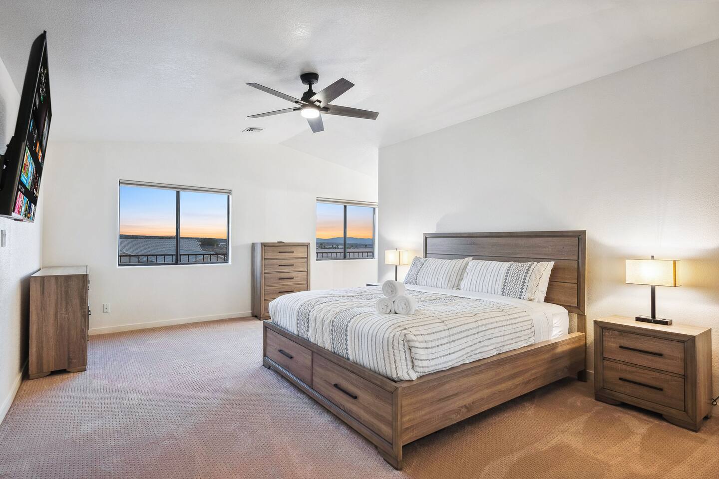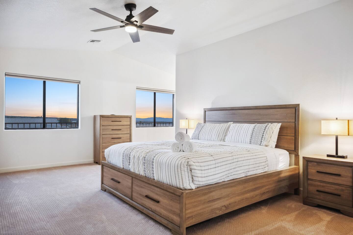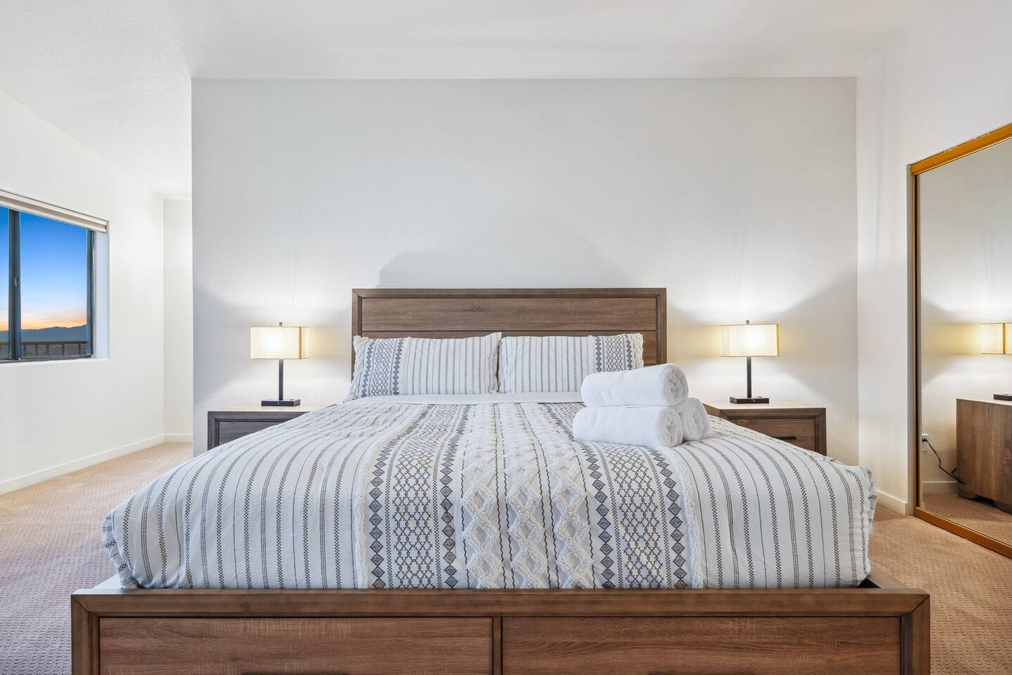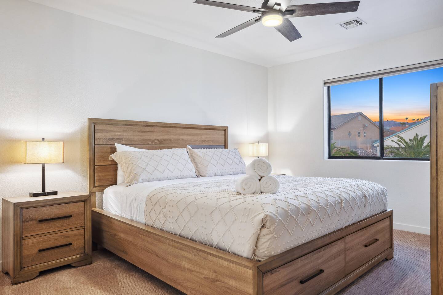 Located just minutes from both Laughlin and Kathrine's Landing in a quiet neighborhood, you'll enter our home and immediately be in the sprawling living room, which is one of two living rooms on the lower level. Both living rooms have cozy sectionals with large smart TV's so you have plenty of space to entertain the adults and kids. The lower level has one bedroom with the remaining bedrooms upstairs. There's two dining areas as well in addition to barstool seating around the kitchen. Lower level: Bedroom 1: King bed + smart TV (Sleeps 2) Upper level: Master bedroom: King bed + smart TV (Sleeps 2) Bedroom 3: King bed + smart TV (Sleeps 2) Bedroom 4: King bed + smart TV (Sleeps 2) Bedroom 5: Two full-over-full bunk beds (Sleeps 8) Total: 16 guests.