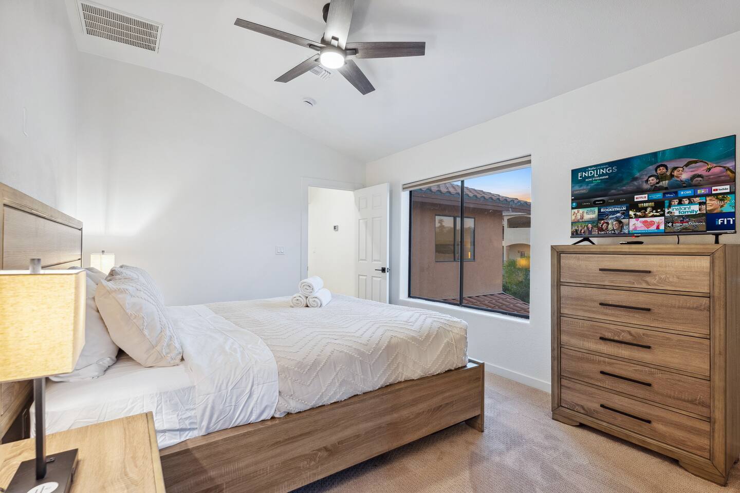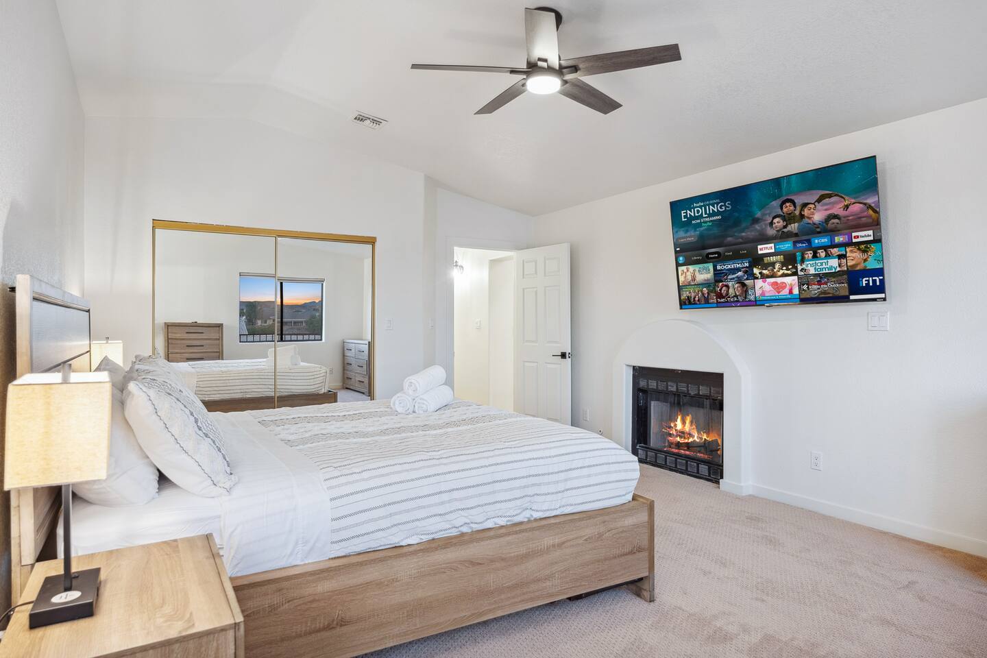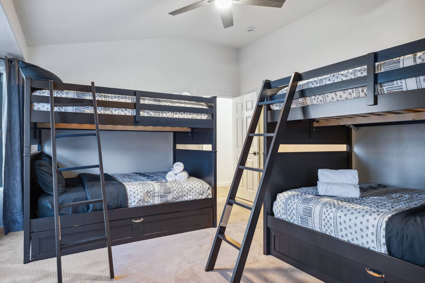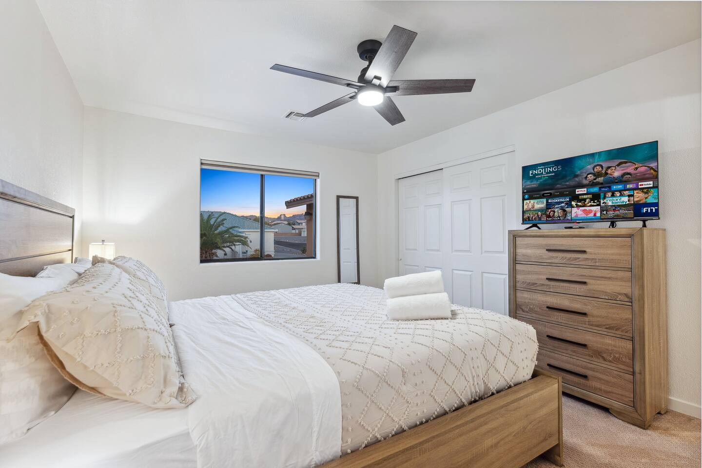 Located just minutes from both Laughlin and Kathrine's Landing in a quiet neighborhood, you'll enter our home and immediately be in the sprawling living room, which is one of two living rooms on the lower level. Both living rooms have cozy sectionals with large smart TV's so you have plenty of space to entertain the adults and kids. The lower level has one bedroom with the remaining bedrooms upstairs. There's two dining areas as well in addition to barstool seating around the kitchen. Lower level: Bedroom 1: King bed + smart TV (Sleeps 2) Upper level: Master bedroom: King bed + smart TV (Sleeps 2) Bedroom 3: King bed + smart TV (Sleeps 2) Bedroom 4: King bed + smart TV (Sleeps 2) Bedroom 5: Two full-over-full bunk beds (Sleeps 8) Total: 16 guests.