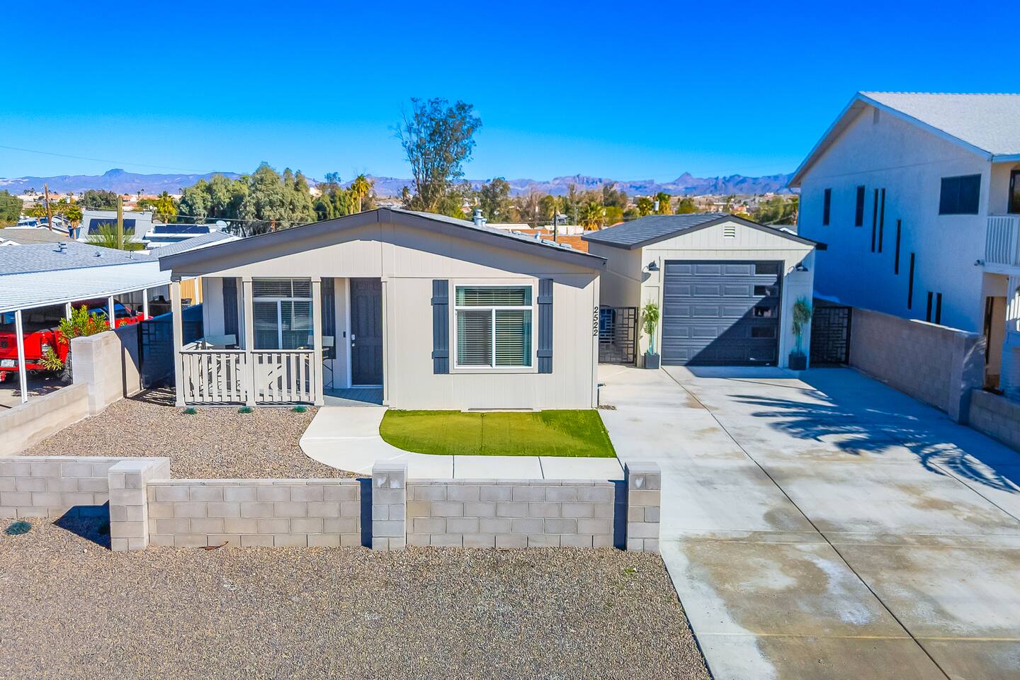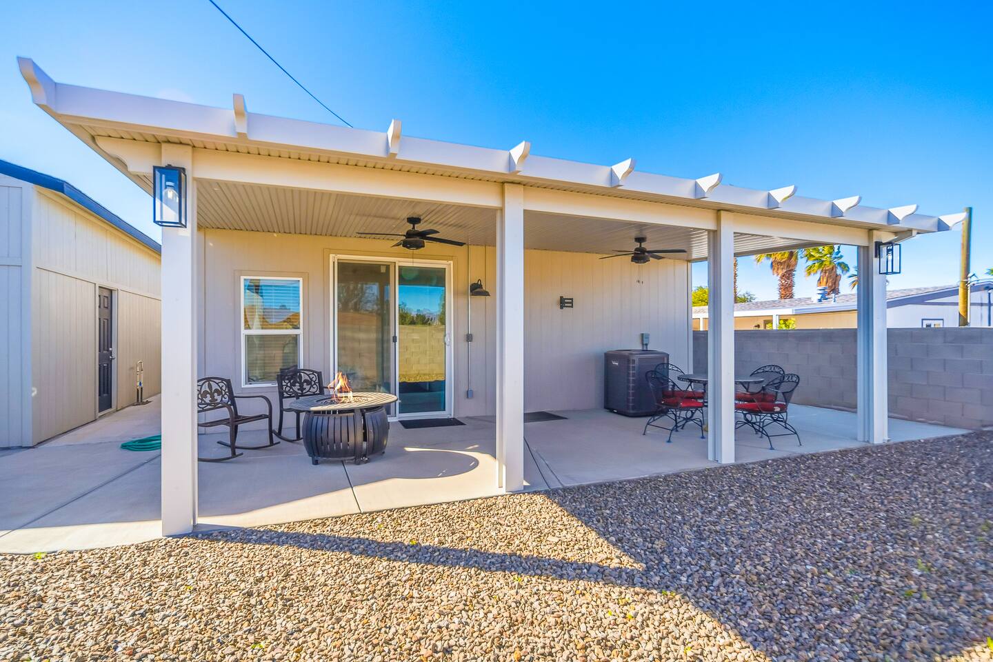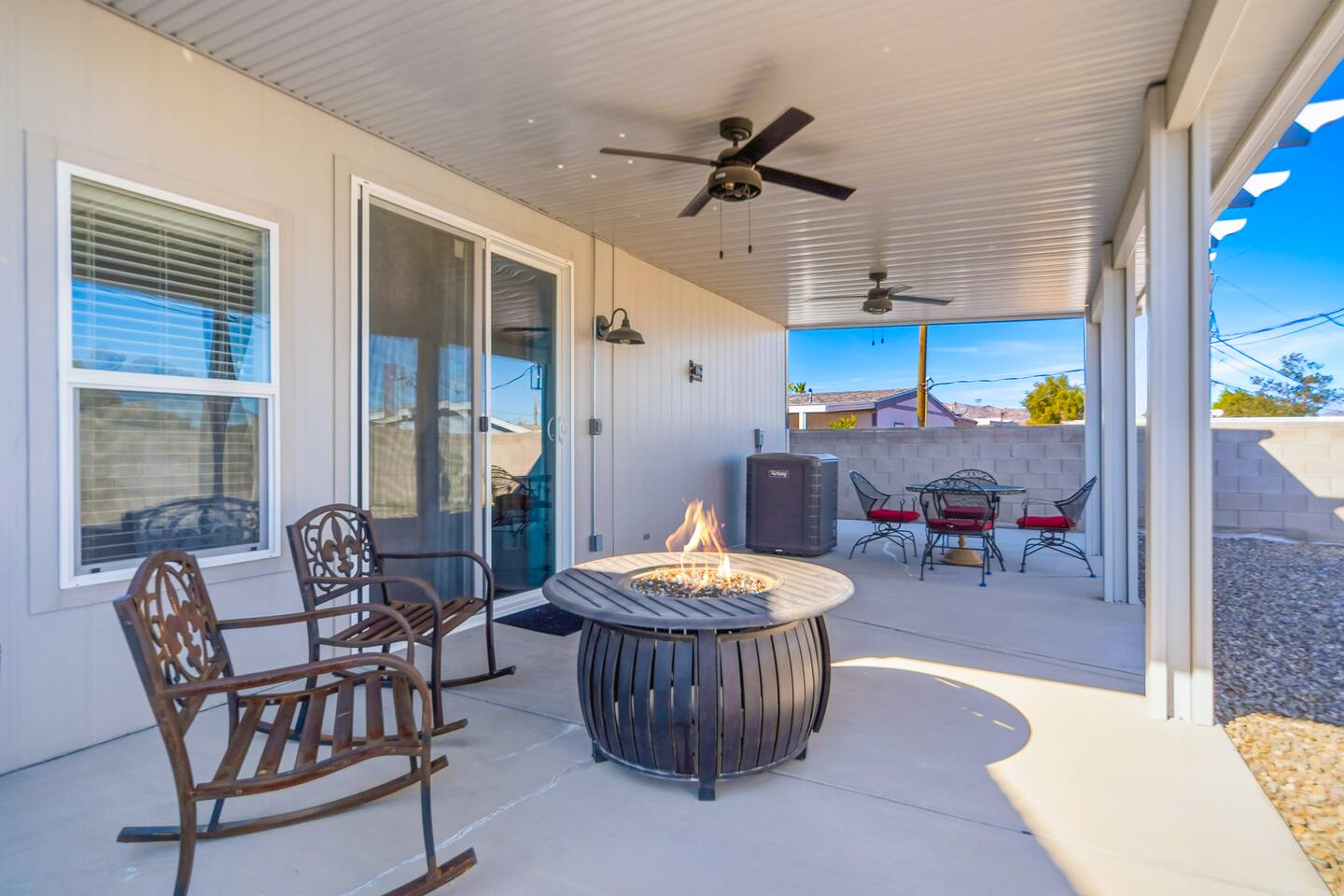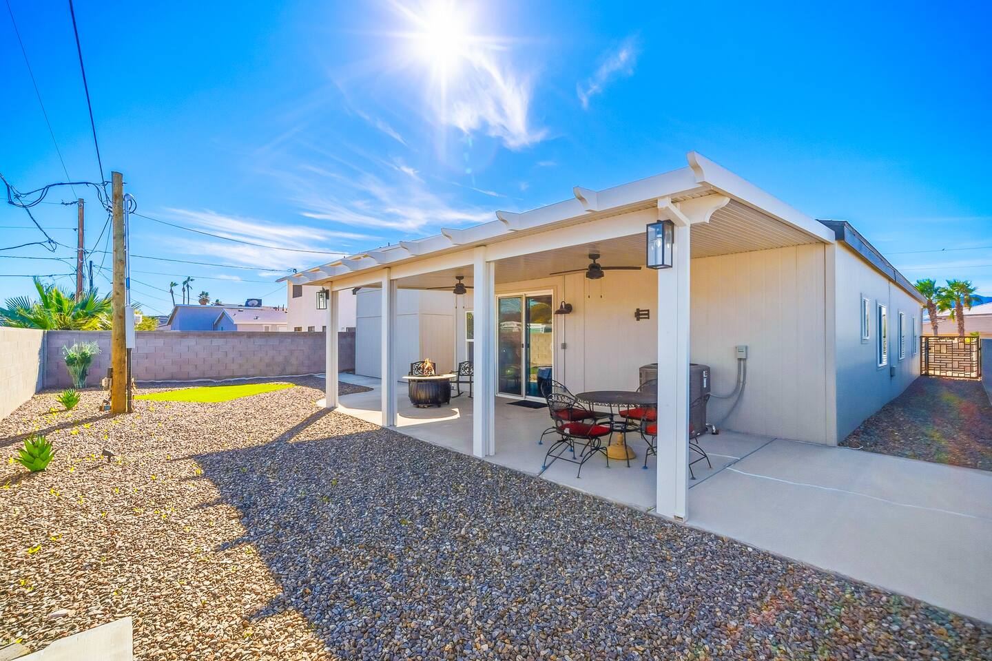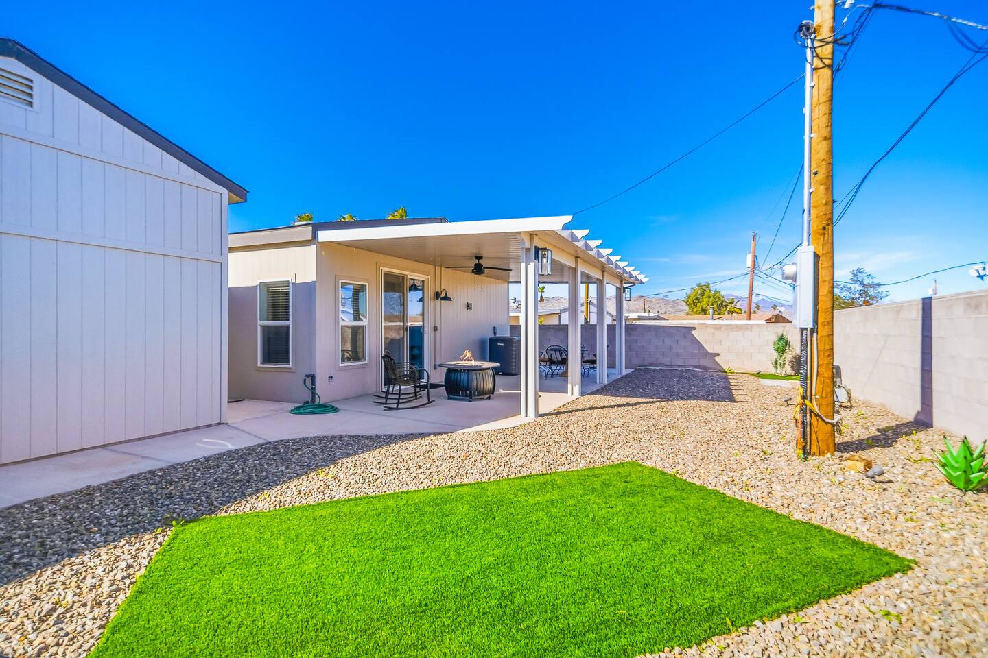 The Space This modern single-story home offers a comfortable and functional layout designed for relaxing after a day on the river. The open-concept living area features plenty of natural light and flows seamlessly into the fully equipped kitchen with ample counter space and seating for casual meals. The home includes three well-appointed bedrooms and two full bathrooms, providing space and privacy for families or groups. The primary bedroom features an en-suite bathroom, while the additional bedrooms are conveniently located near the second bath. Step outside to a private fenced backyard with a covered patio, perfect for morning coffee or evening downtime. Driveway parking is available for guests (garage is not accessible). Clean, modern, and thoughtfully laid out—this space is ideal for short getaways or extended stays near the Colorado River.