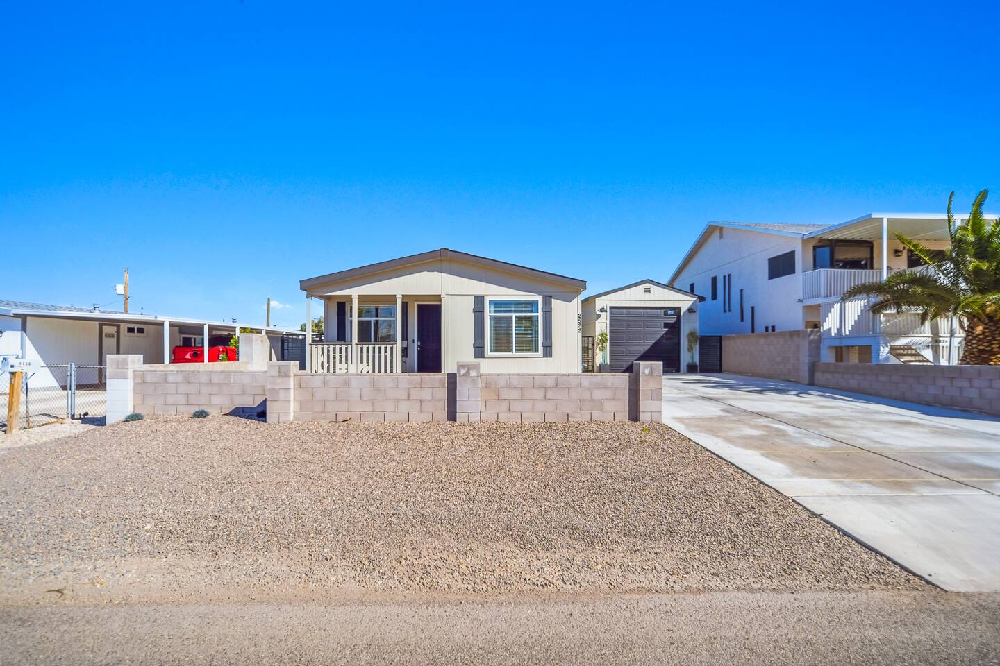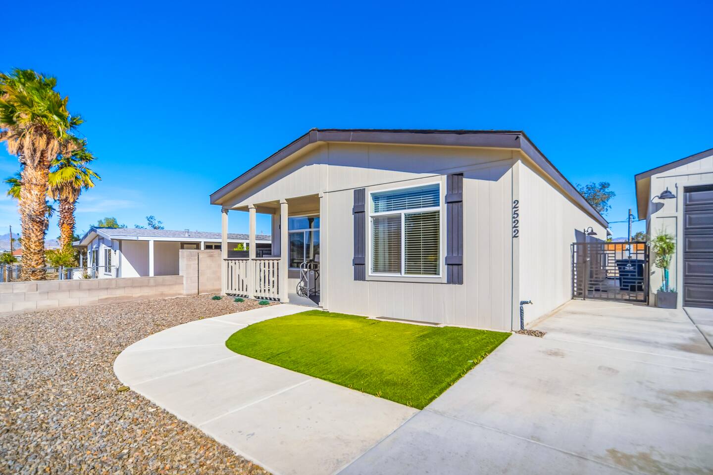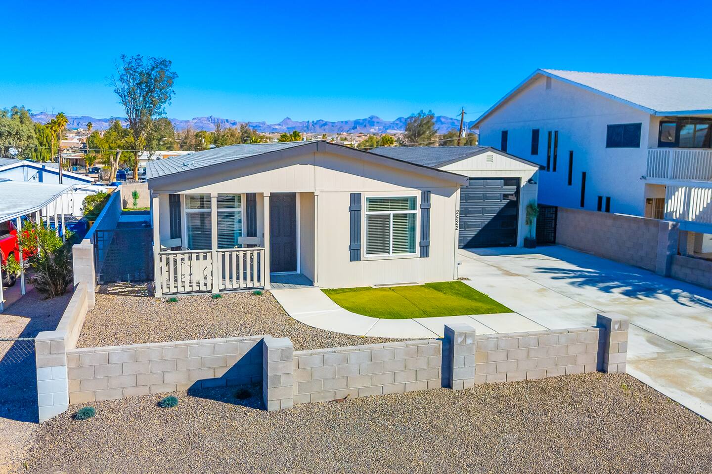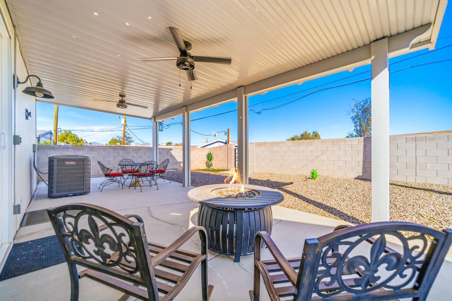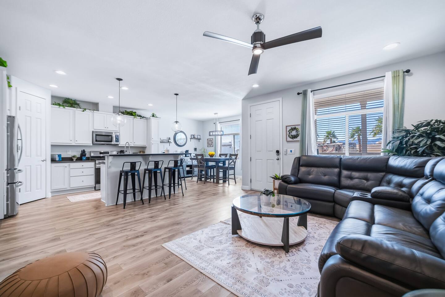 The Space This modern single-story home offers a comfortable and functional layout designed for relaxing after a day on the river. The open-concept living area features plenty of natural light and flows seamlessly into the fully equipped kitchen with ample counter space and seating for casual meals. The home includes three well-appointed bedrooms and two full bathrooms, providing space and privacy for families or groups. The primary bedroom features an en-suite bathroom, while the additional bedrooms are conveniently located near the second bath. Step outside to a private fenced backyard with a covered patio, perfect for morning coffee or evening downtime. Driveway parking is available for guests (garage is not accessible). Clean, modern, and thoughtfully laid out—this space is ideal for short getaways or extended stays near the Colorado River.