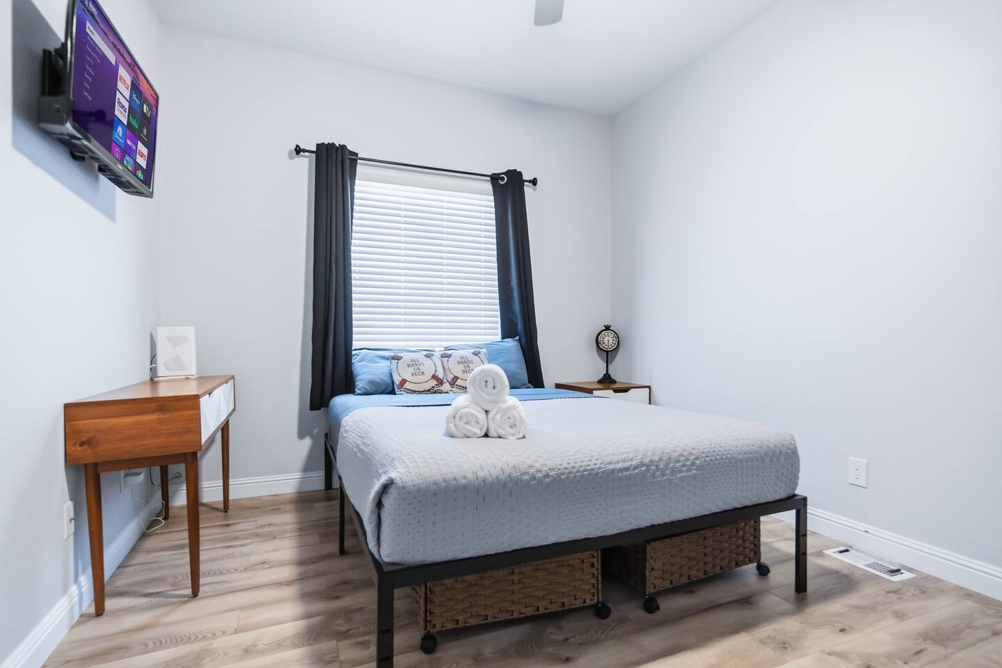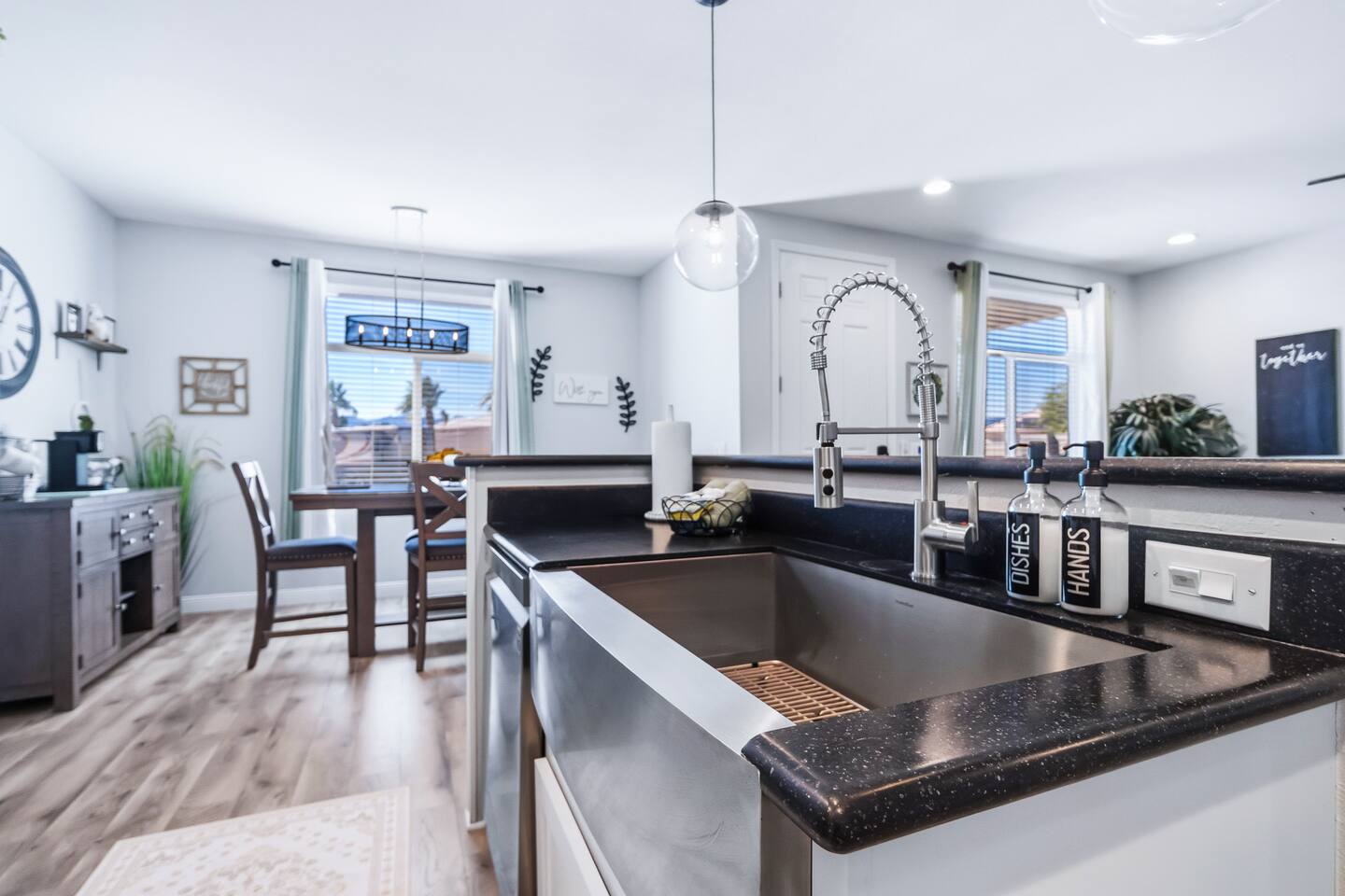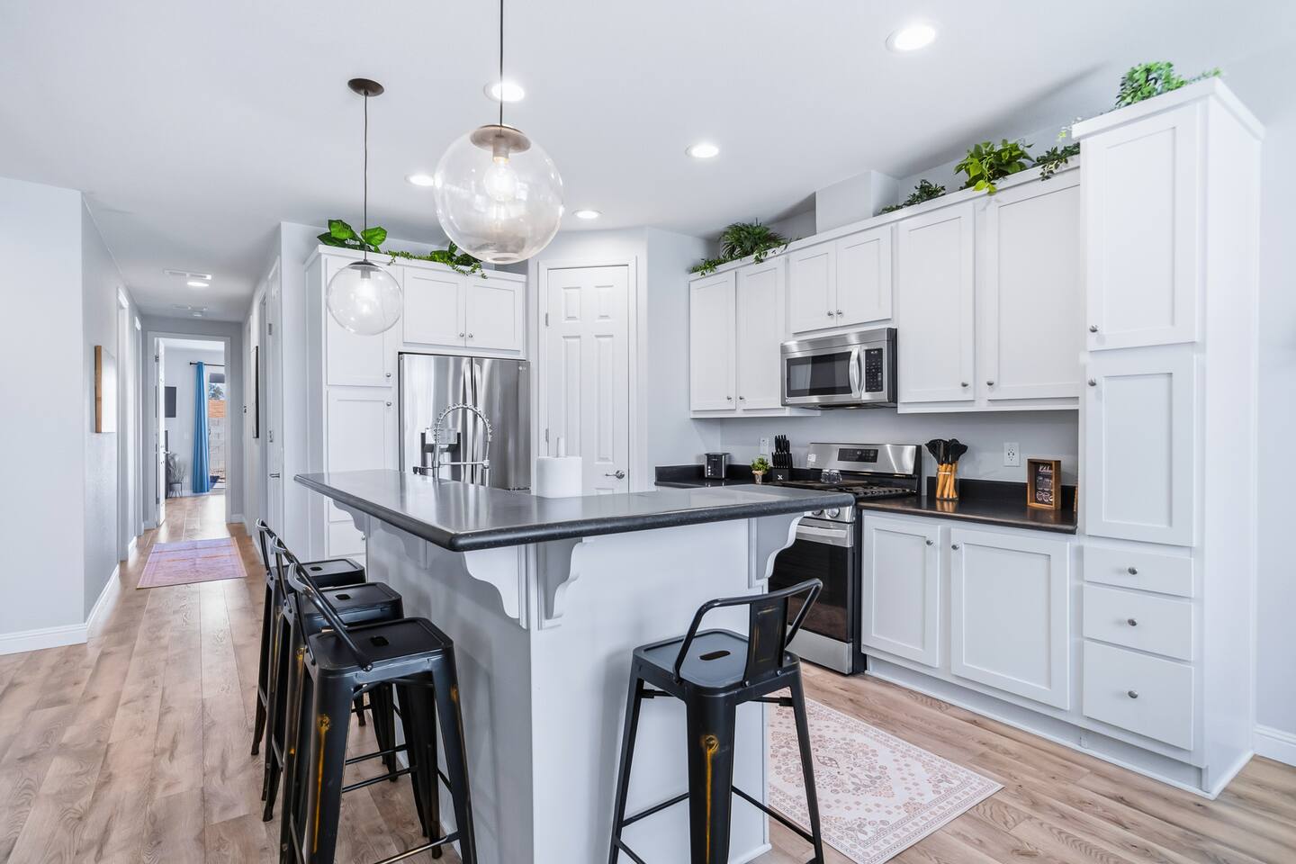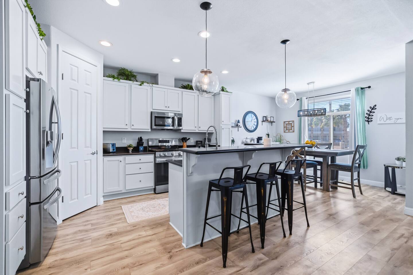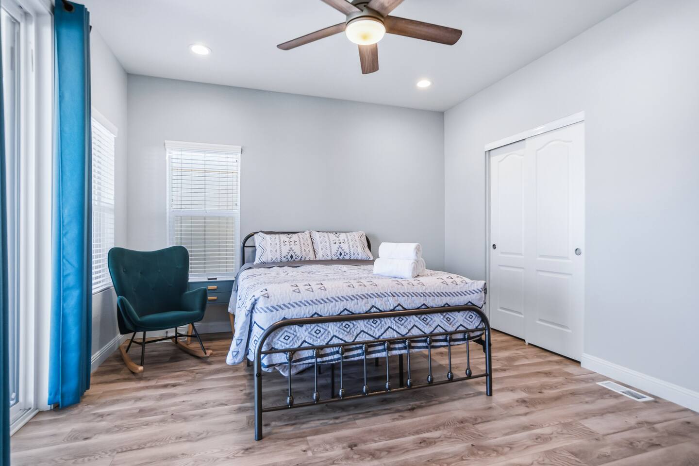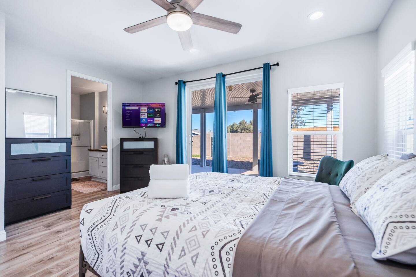 The Space This modern single-story home offers a comfortable and functional layout designed for relaxing after a day on the river. The open-concept living area features plenty of natural light and flows seamlessly into the fully equipped kitchen with ample counter space and seating for casual meals. The home includes three well-appointed bedrooms and two full bathrooms, providing space and privacy for families or groups. The primary bedroom features an en-suite bathroom, while the additional bedrooms are conveniently located near the second bath. Step outside to a private fenced backyard with a covered patio, perfect for morning coffee or evening downtime. Driveway parking is available for guests (garage is not accessible). Clean, modern, and thoughtfully laid out—this space is ideal for short getaways or extended stays near the Colorado River.