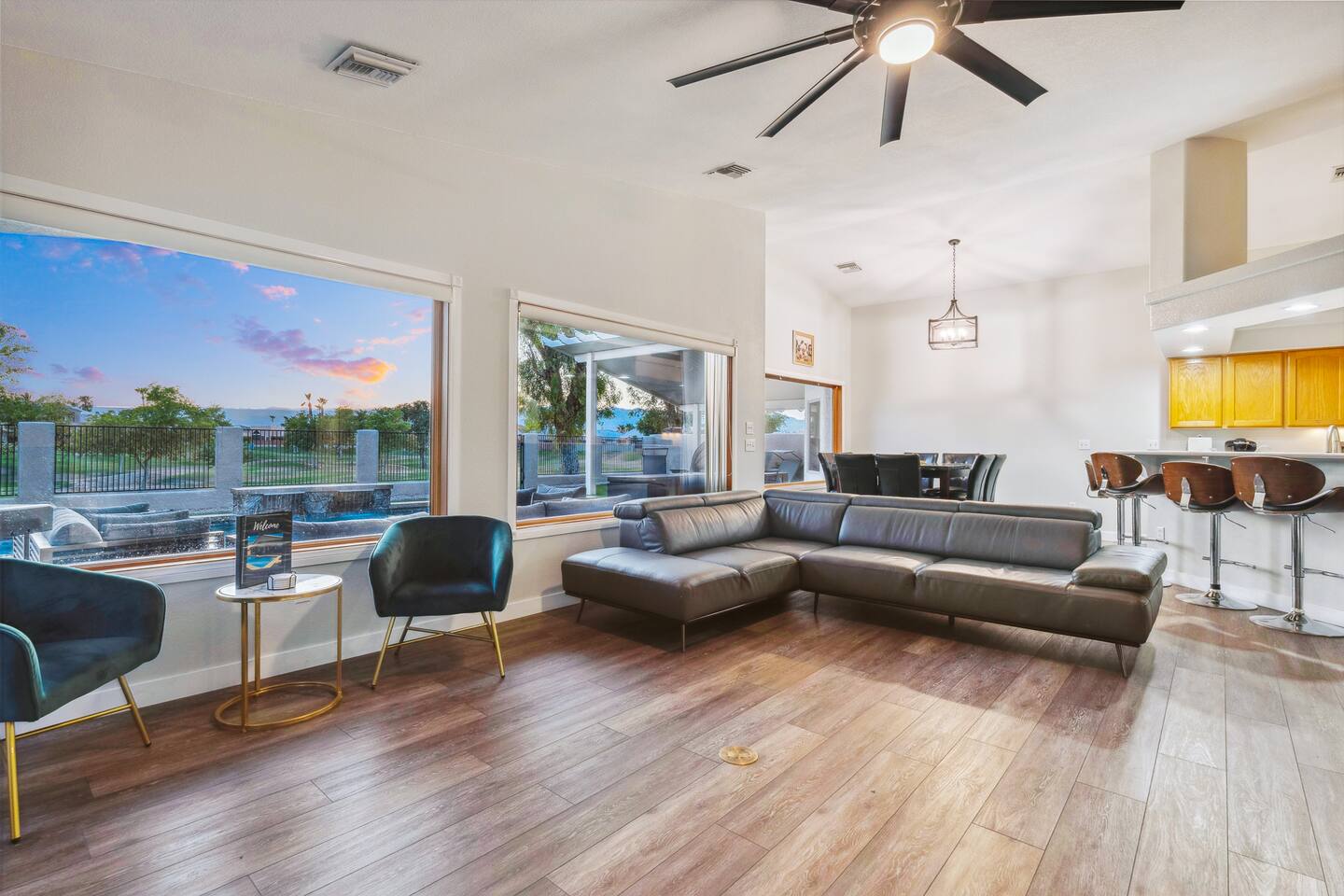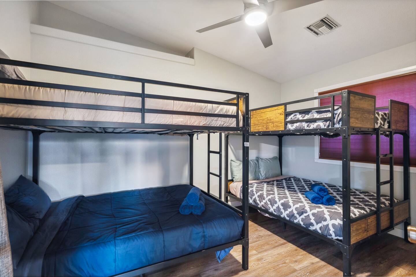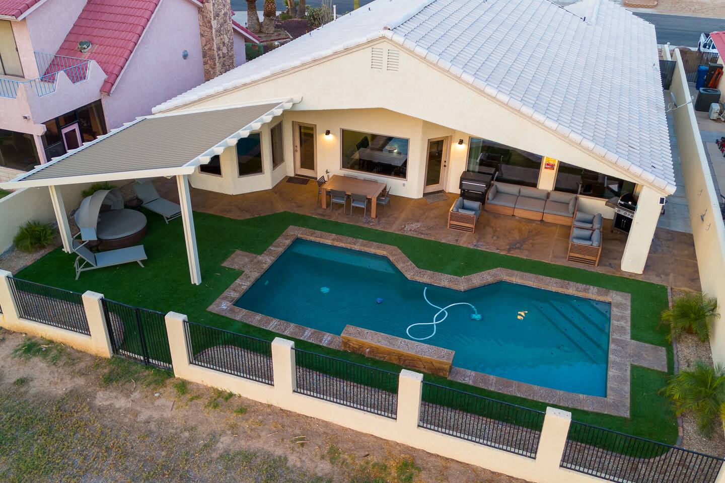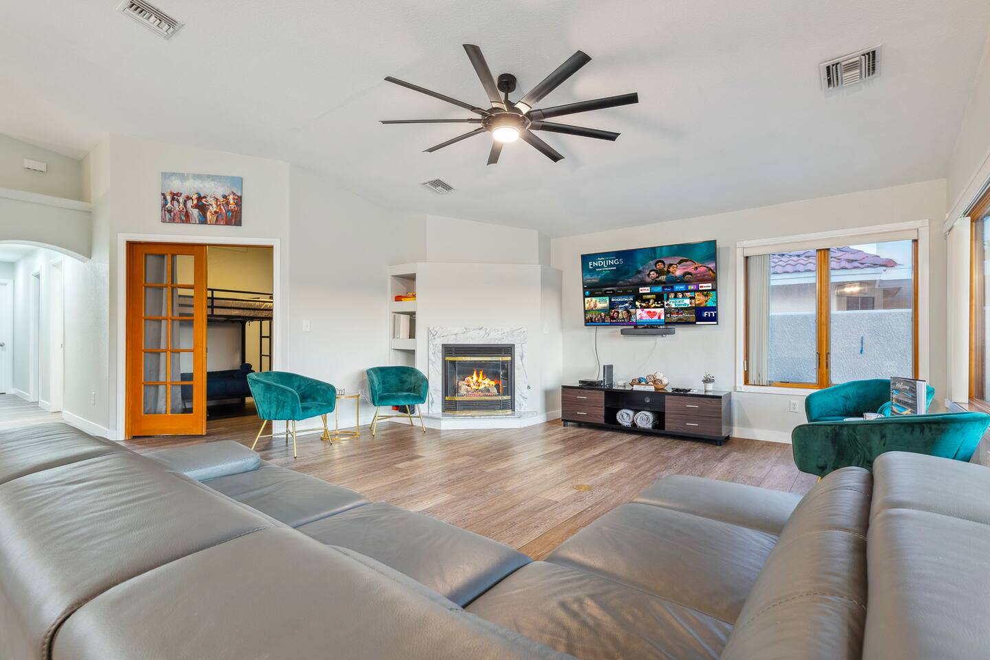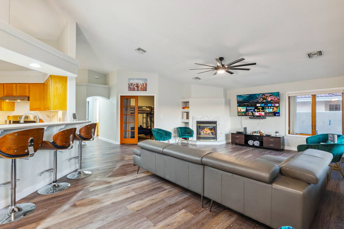 2,355 Sq Ft | 4 bedrooms | 2 bathrooms Find all the general home comforts you’d expect at home, ideal for families looking to explore the Colorado River! Bedroom 1: Two full-over-full bunk beds Bedroom 2: King Bed Bedroom 3: Full-over-full bunk bed and queen bed Bedroom 4: King bed OUTDOOR LIVING: BBQ, Pool, Greenbelt views and access. INDOOR LIVING: Modern living space, 4 Smart TVs, dining table KITCHEN: Fully equipped, breakfast bar, updated appliances, Keurig (coffee, creamer & sugar provided), dishware/flatware, pots/pans, cooking essentials, spices GENERAL: Free WiFi, linens/towels, washer/dryer, central A/C & heating, step-free access, contactless check-in FAQ: 2 exterior security cameras PARKING: Driveway (2 vehicles). The garage is NOT available for use at this time.