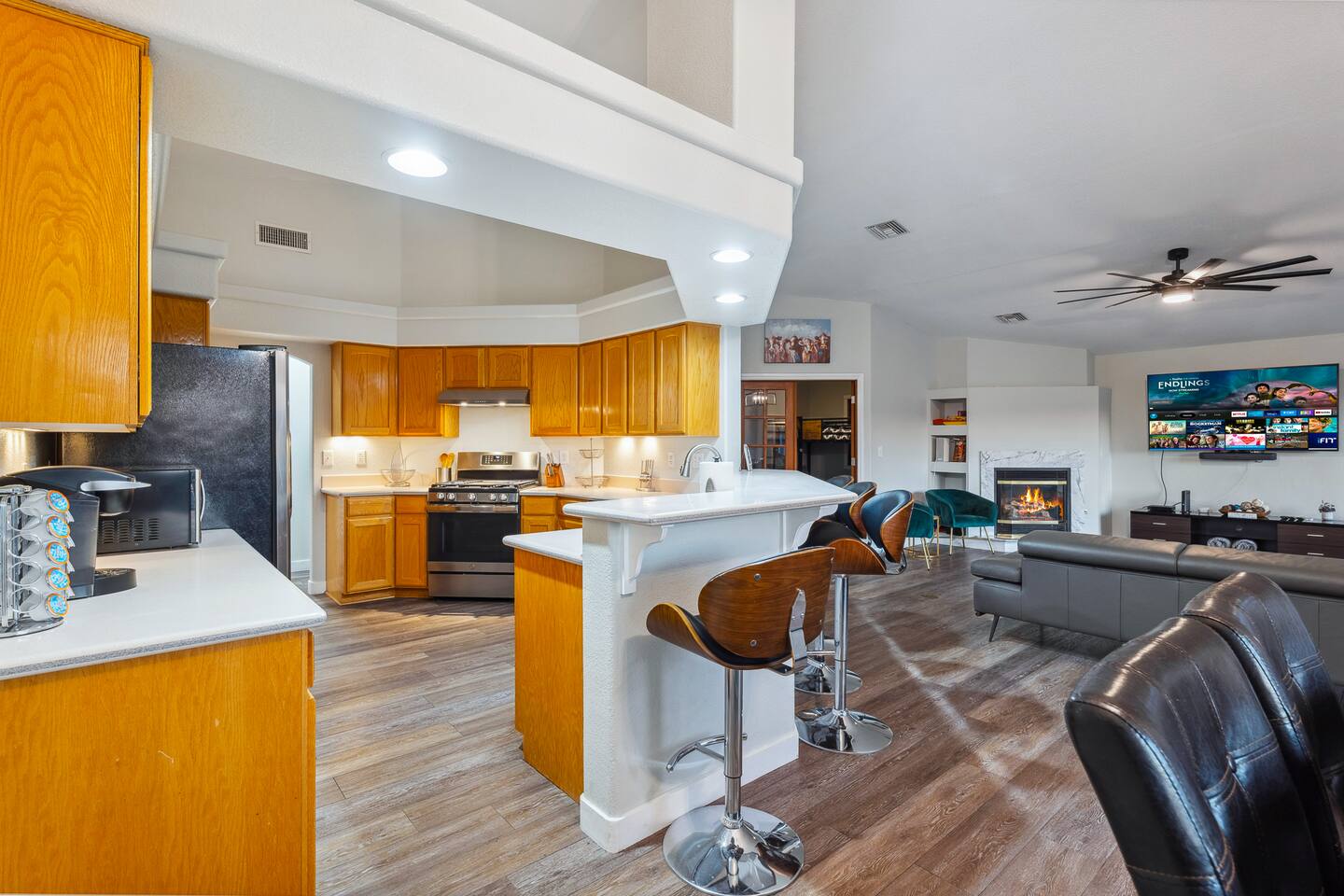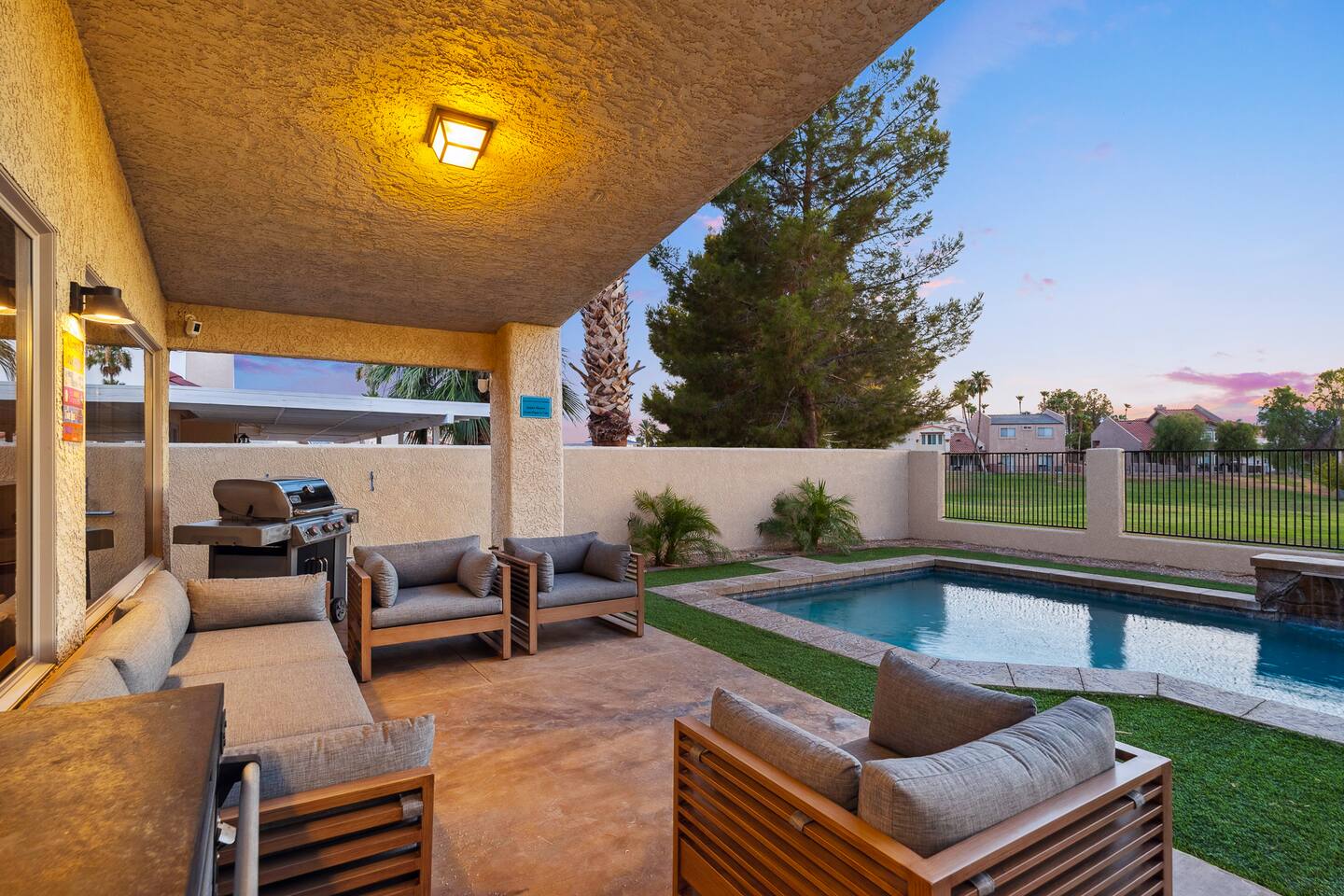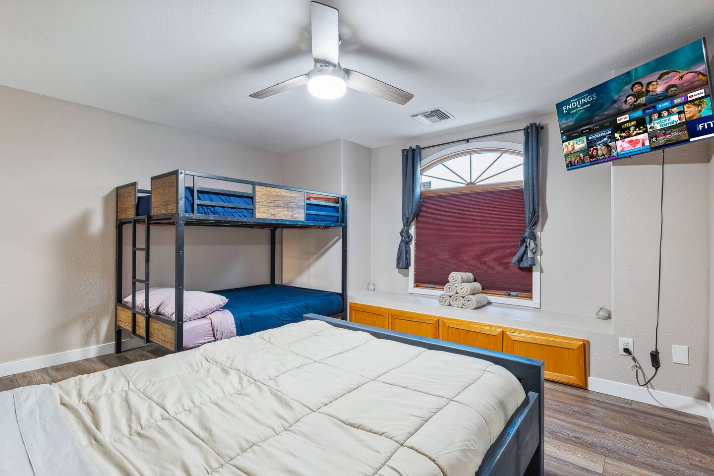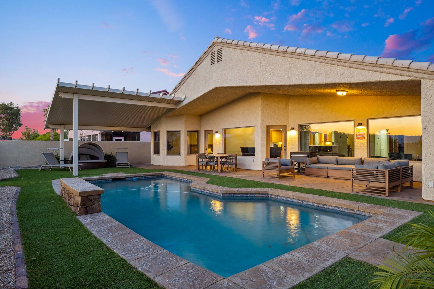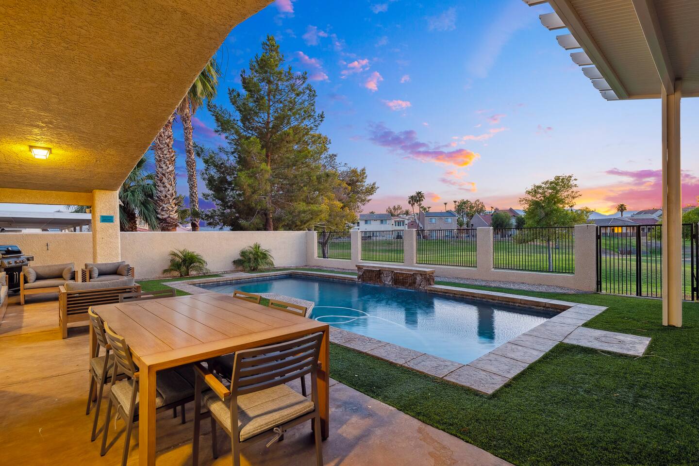 2,355 Sq Ft | 4 bedrooms | 2 bathrooms Find all the general home comforts you’d expect at home, ideal for families looking to explore the Colorado River! Bedroom 1: Two full-over-full bunk beds Bedroom 2: King Bed Bedroom 3: Full-over-full bunk bed and queen bed Bedroom 4: King bed OUTDOOR LIVING: BBQ, Pool, Greenbelt views and access. INDOOR LIVING: Modern living space, 4 Smart TVs, dining table KITCHEN: Fully equipped, breakfast bar, updated appliances, Keurig (coffee, creamer & sugar provided), dishware/flatware, pots/pans, cooking essentials, spices GENERAL: Free WiFi, linens/towels, washer/dryer, central A/C & heating, step-free access, contactless check-in FAQ: 2 exterior security cameras PARKING: Driveway (2 vehicles). The garage is NOT available for use at this time.