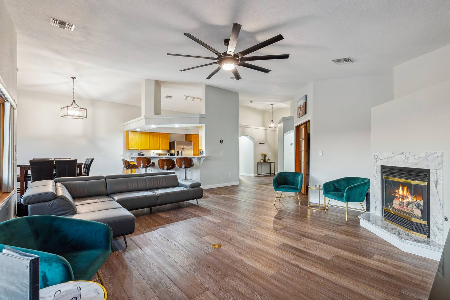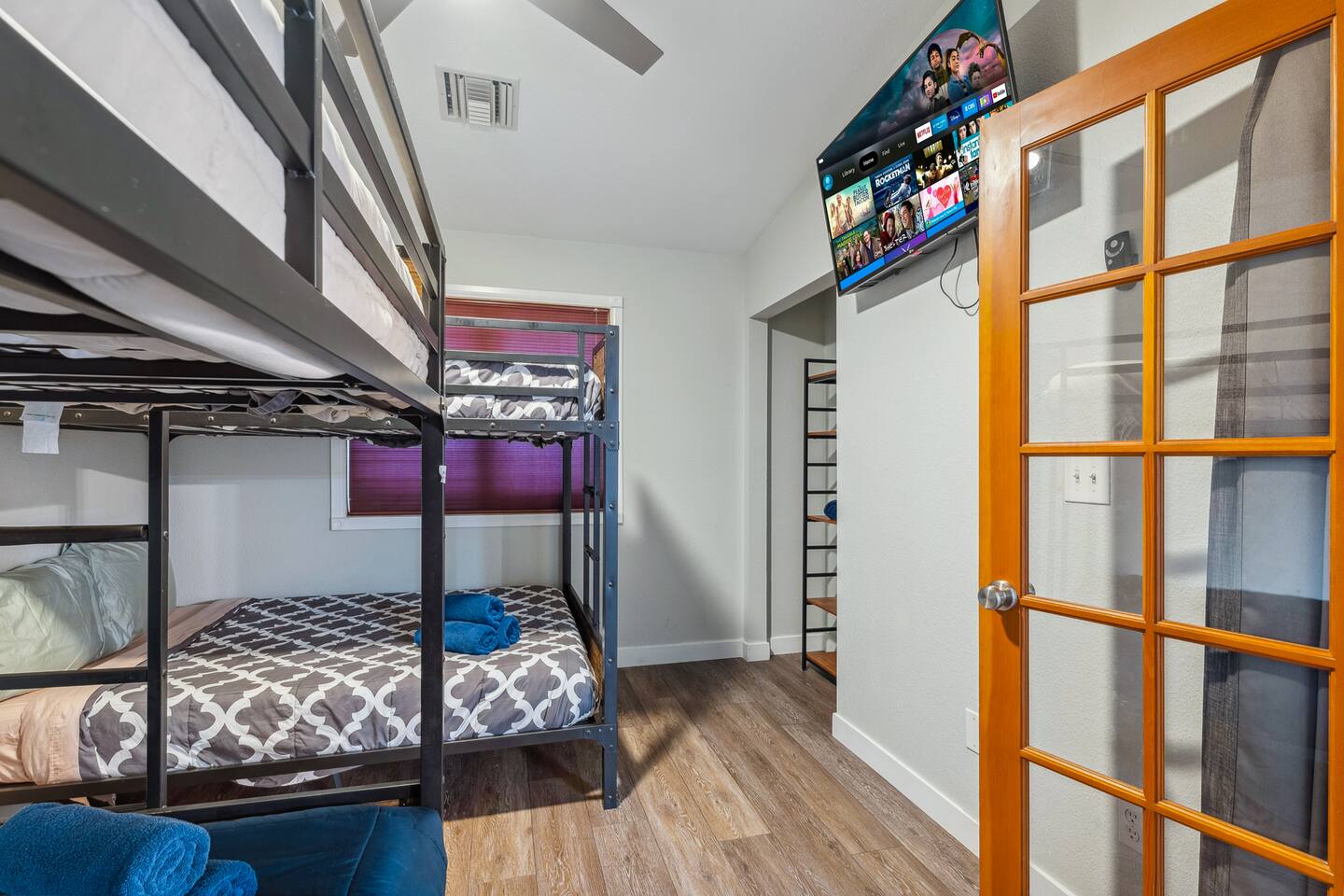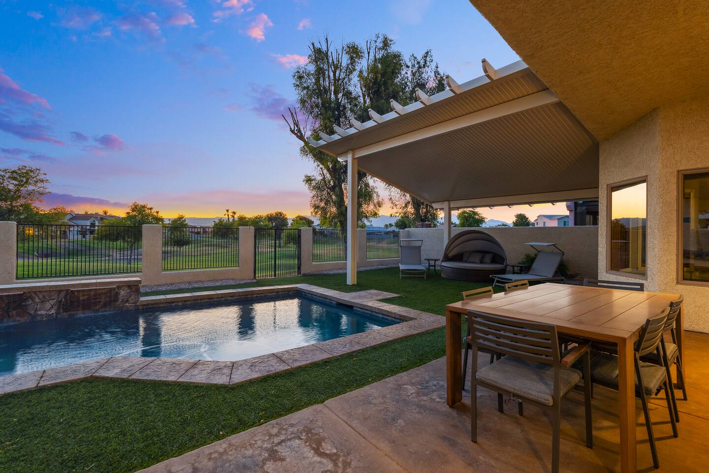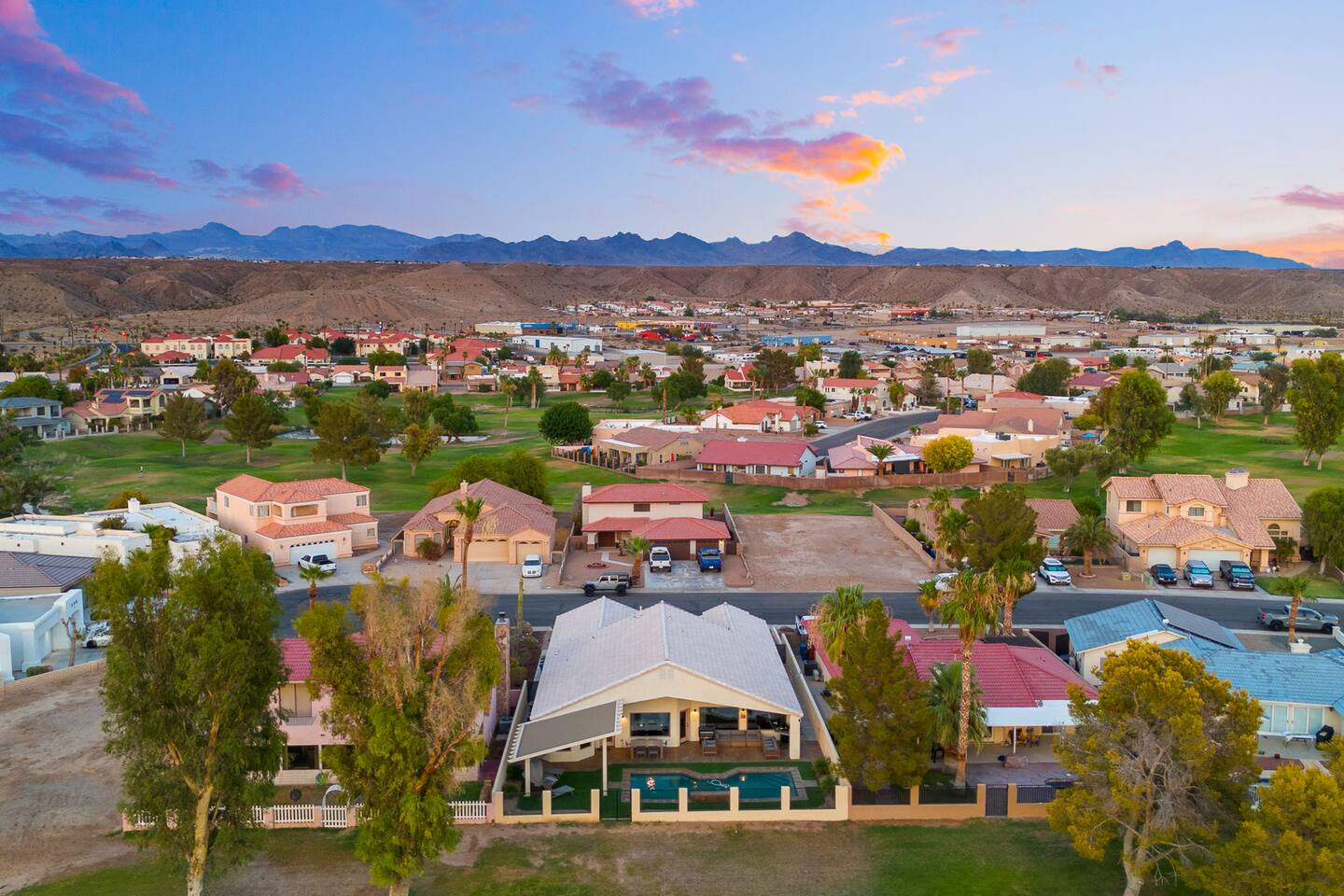 2,355 Sq Ft | 4 bedrooms | 2 bathrooms Find all the general home comforts you’d expect at home, ideal for families looking to explore the Colorado River! Bedroom 1: Two full-over-full bunk beds Bedroom 2: King Bed Bedroom 3: Full-over-full bunk bed and queen bed Bedroom 4: King bed OUTDOOR LIVING: BBQ, Pool, Greenbelt views and access. INDOOR LIVING: Modern living space, 4 Smart TVs, dining table KITCHEN: Fully equipped, breakfast bar, updated appliances, Keurig (coffee, creamer & sugar provided), dishware/flatware, pots/pans, cooking essentials, spices GENERAL: Free WiFi, linens/towels, washer/dryer, central A/C & heating, step-free access, contactless check-in FAQ: 2 exterior security cameras PARKING: Driveway (2 vehicles). The garage is NOT available for use at this time.