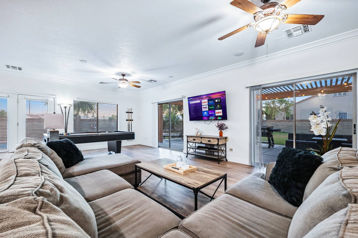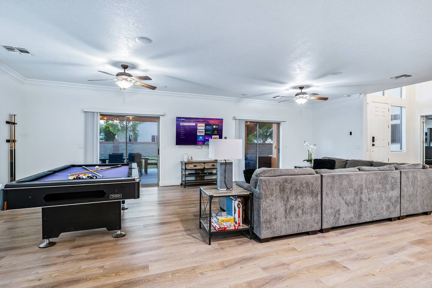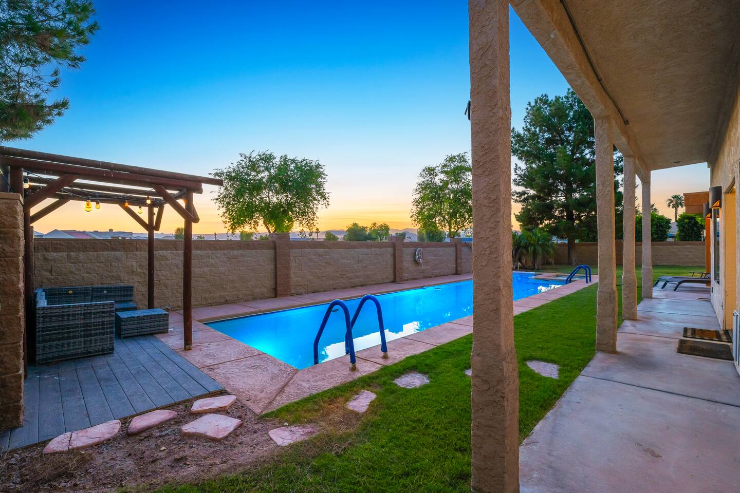 Welcome to "Sun of the Green"—our stunning Bullhead City retreat near the Colorado River! Our spacious escape sleeps 10 and offers relaxing greenbelt views, a sparkling pool, soothing spa, and fun-filled pool table. Whether you're lounging by the water, soaking in the spa, or enjoying friendly competition indoors, our home is perfect for families or groups seeking both adventure and tranquility in the Arizona sun. With access to a private boat launch and beach less than a quarter mile away!