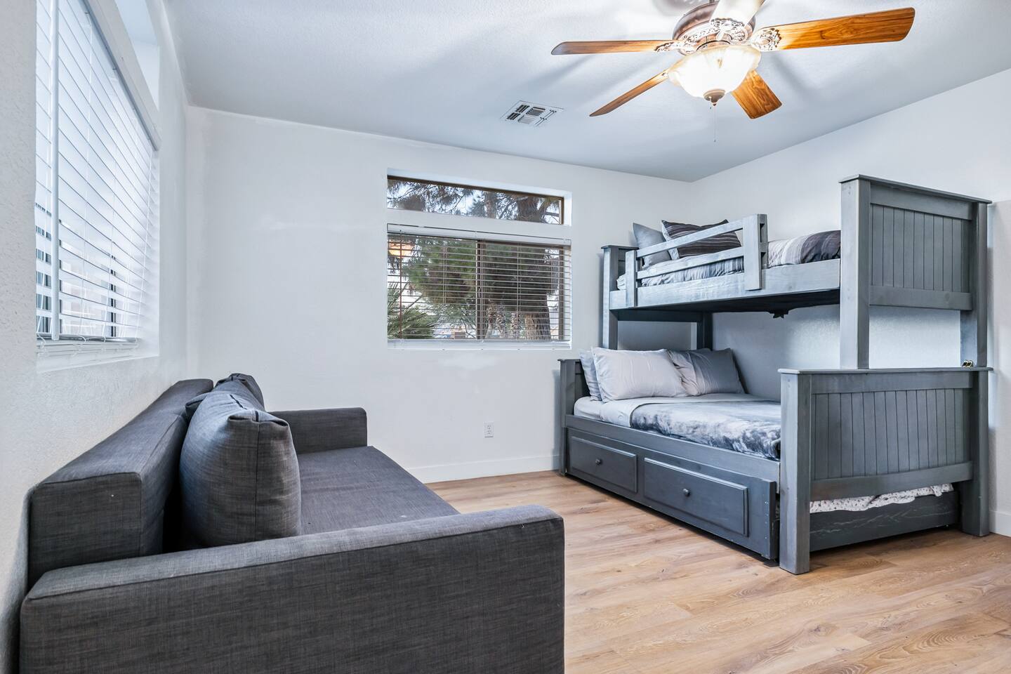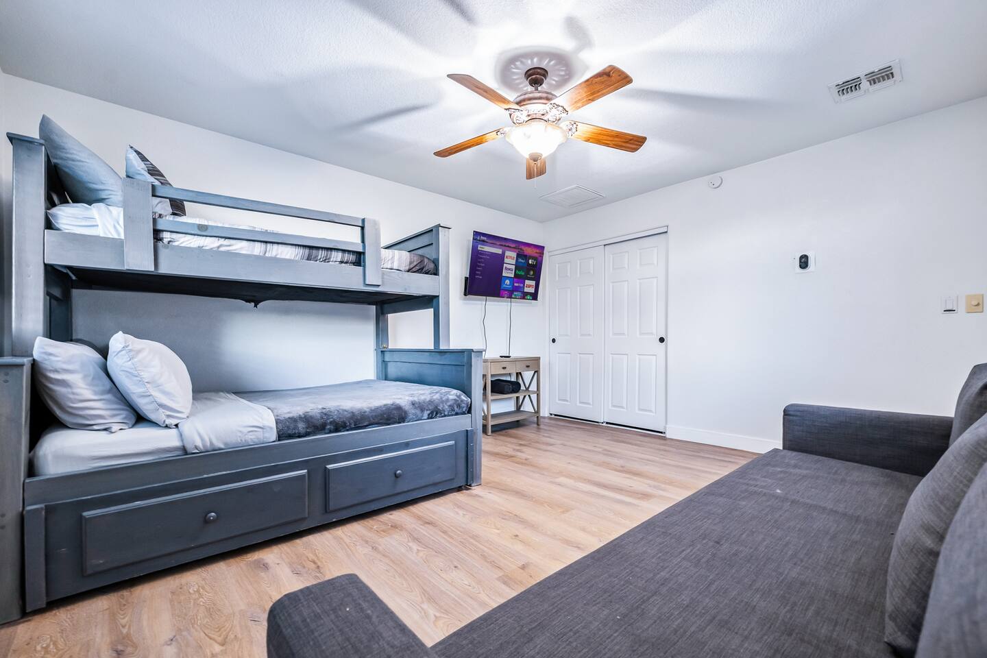 Bedroom 1: Queen bed + twin bed + Full (sleeps 5) +attached bathroom Bedroom 2: Full bed (sleeps 2) Bedroom 3: Twin-over-full bunk bed + Sofa bed (sleeps 3) Total: 8 beds (sleeps 10)