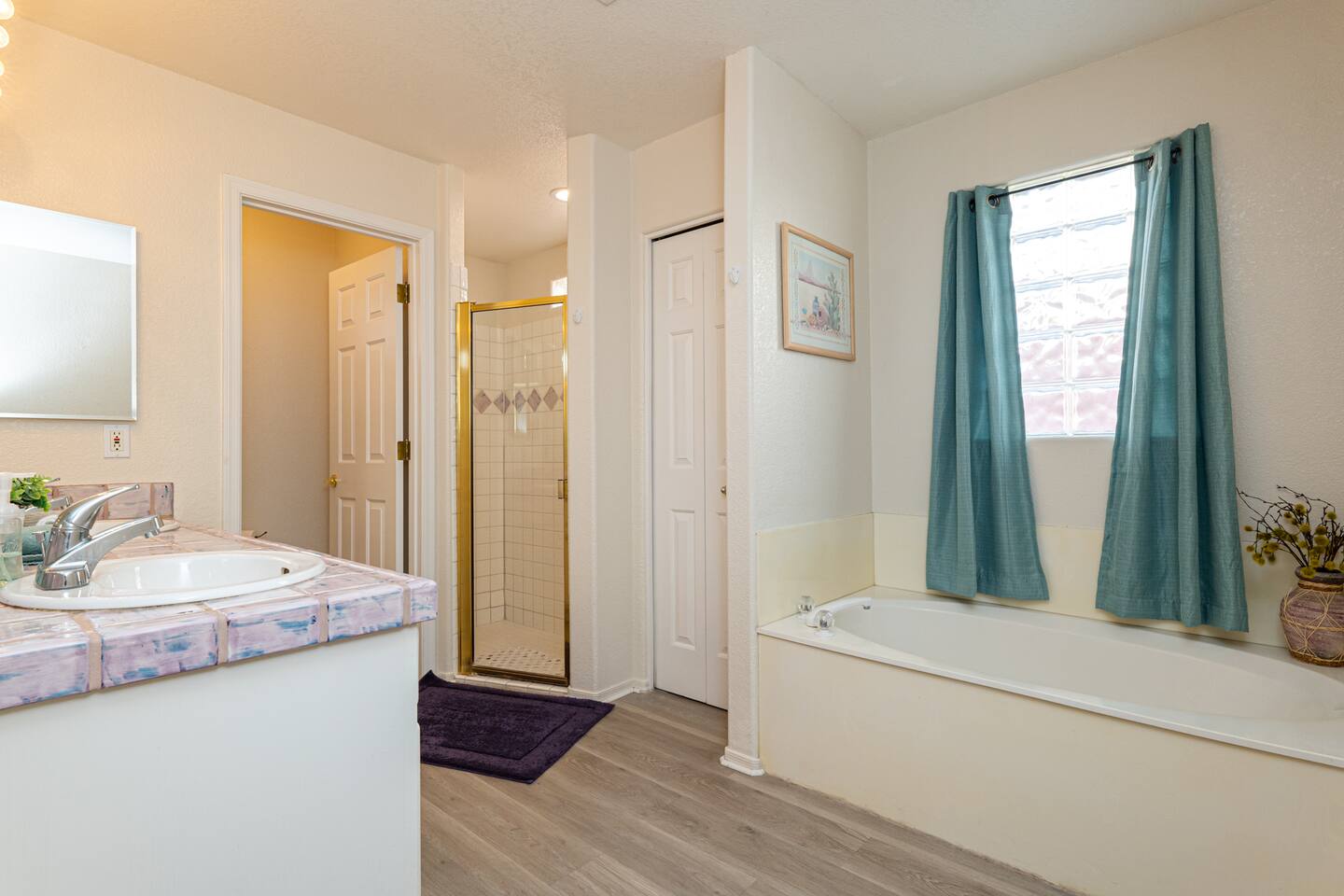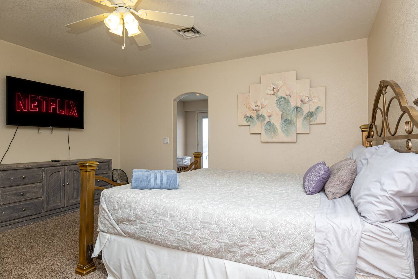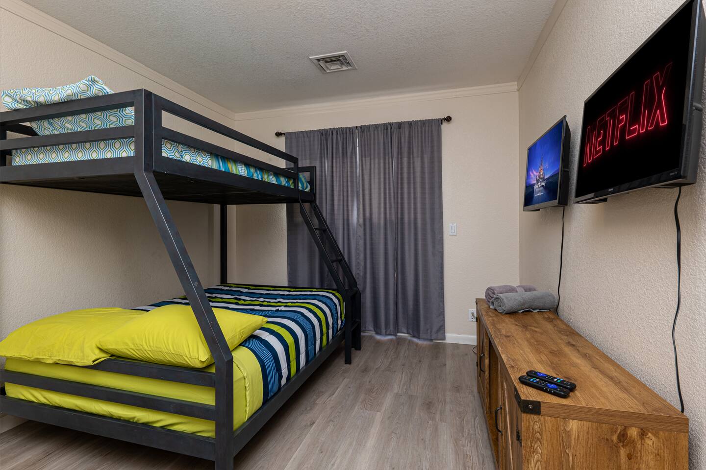 Our space offers sleeping for up to 10 Master: King with Queen futon in master suite area/cabana room Bedroom 2: Queen Den/Kids Room: Bunk with full on bottom, twin on top Plus one roll away bed