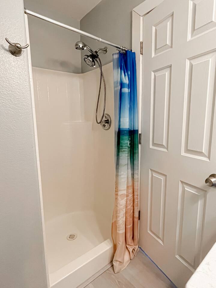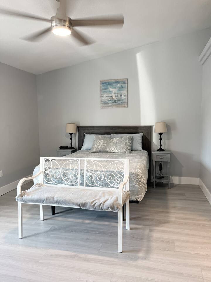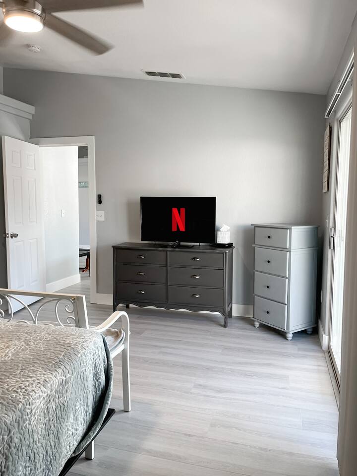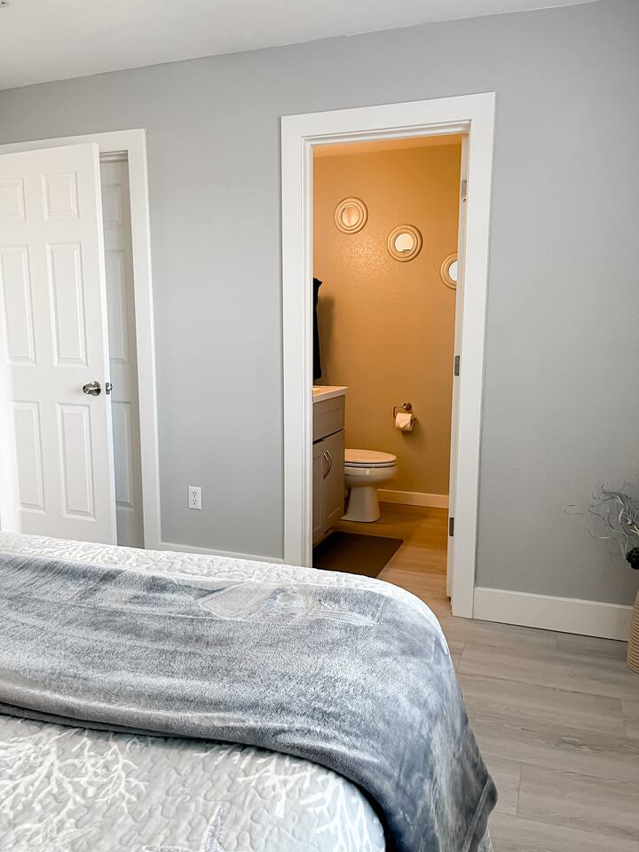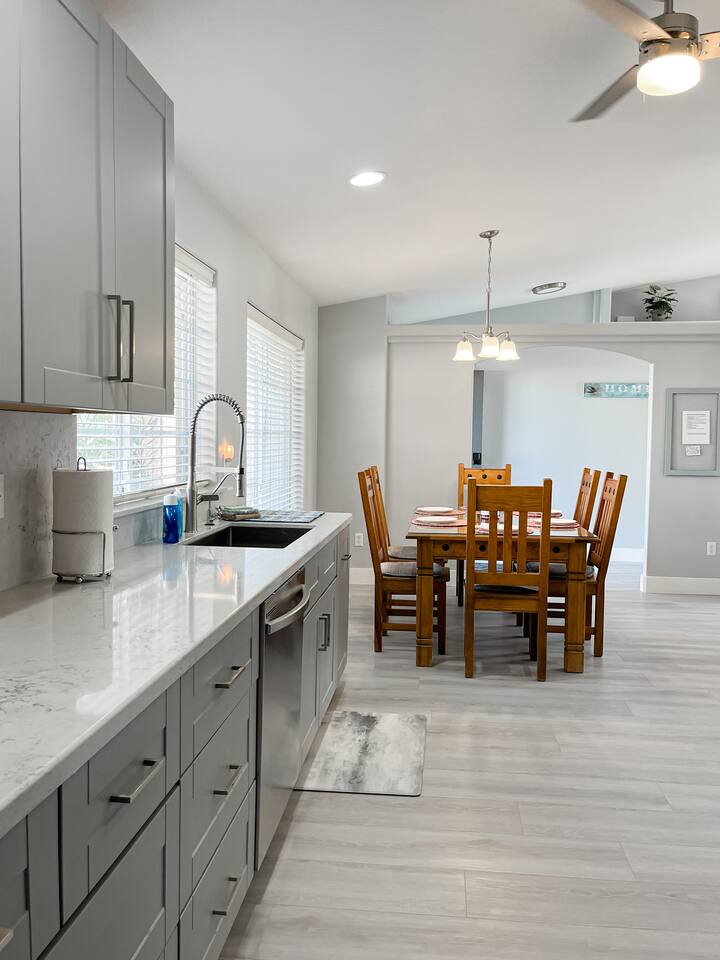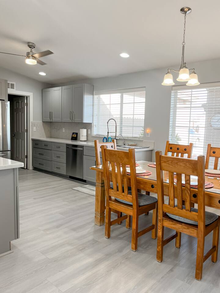 You'll enter into the home and immediately notice the large living room, dining room and kitchen with brand new floors. The living room sofa pulls out to sleep two. The large dining table in the eat-in kitchen is an amazing place to cook and reconnect with the family or play your favorite board game around the table. The split-layout of the house has the master suite on the right side of the living room and the additional bedroom and second ensuite bedroom on the left. The open, and unfenced backyard with dining table is a nice quiet spot to enjoy a meal al fresca or BBQ on the grill.