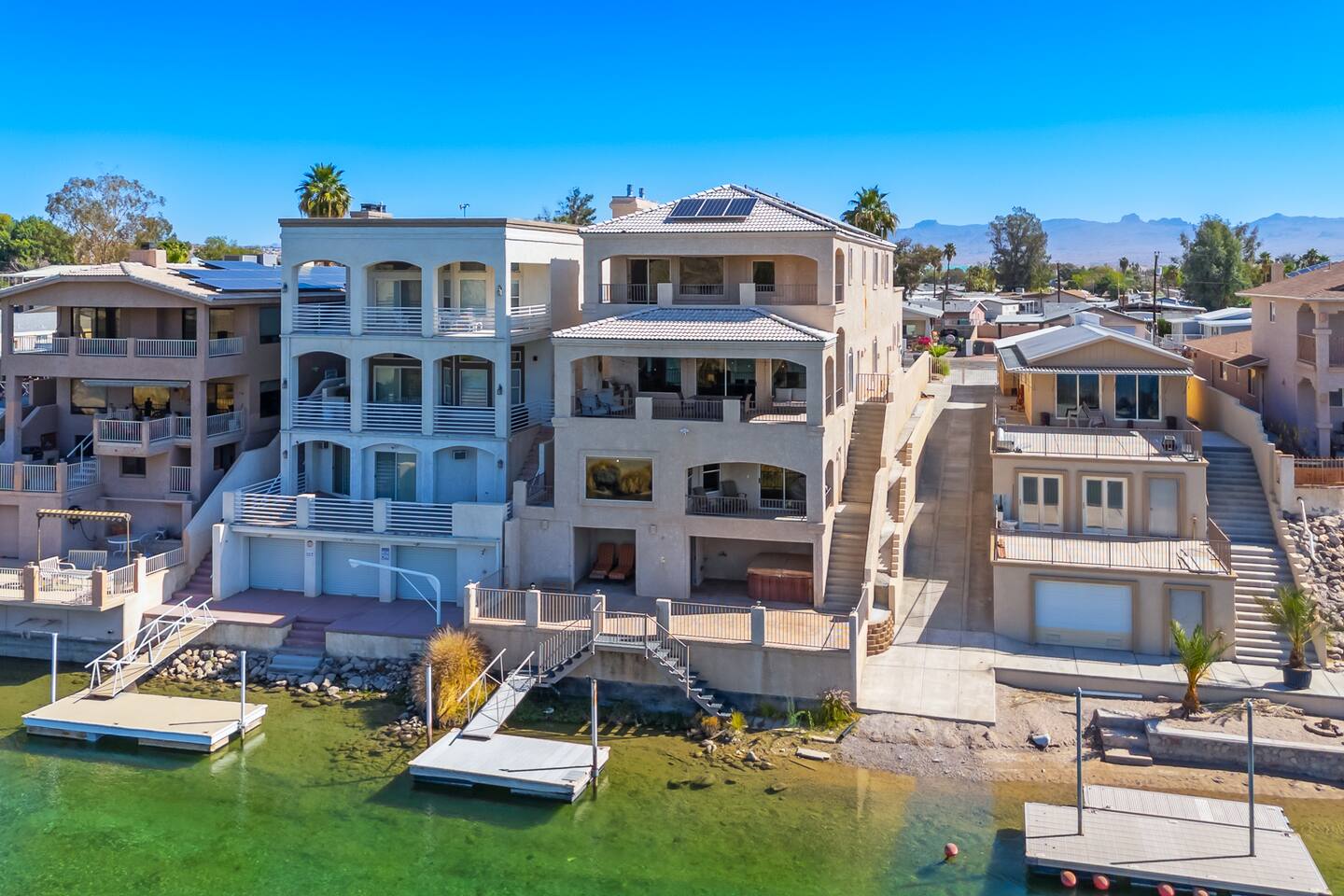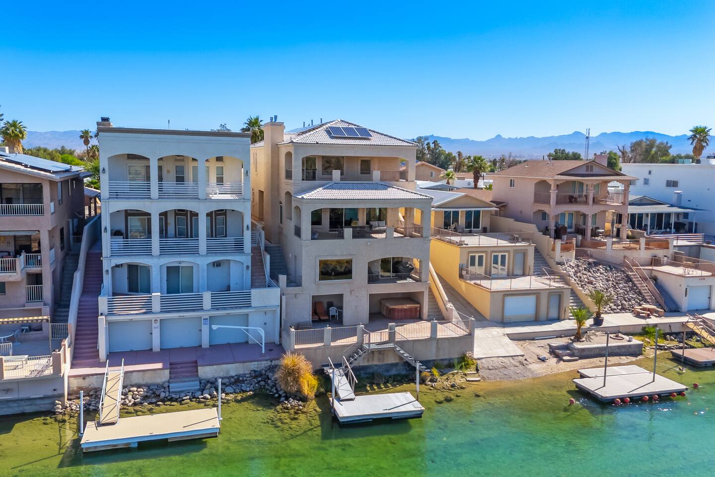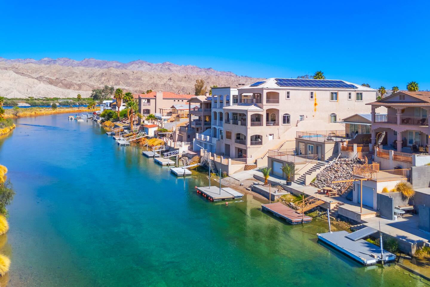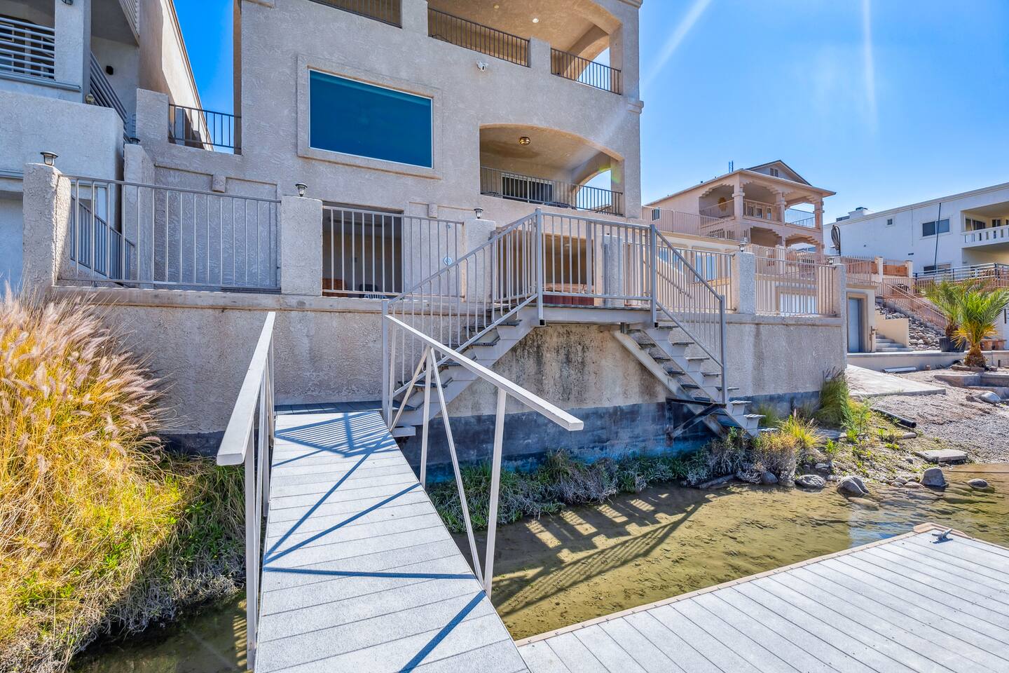 Welcome to the Desert Diamond-- a private riverfront retreat designed for elevated escapes. Our stunning 6BR/6BA estate sleeps 16 and features a private dock, expansive balconies, and breathtaking sunset views over the Colorado River. Wake to shimmering water, spend the day boating or lounging, and unwind in refined comfort each evening in the spa. Perfect for unforgettable gatherings, upscale family vacations, and stylish group getaways just minutes from Laughlin.