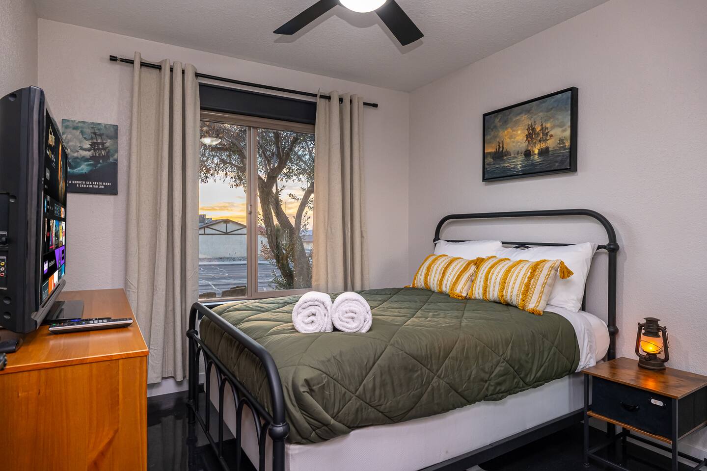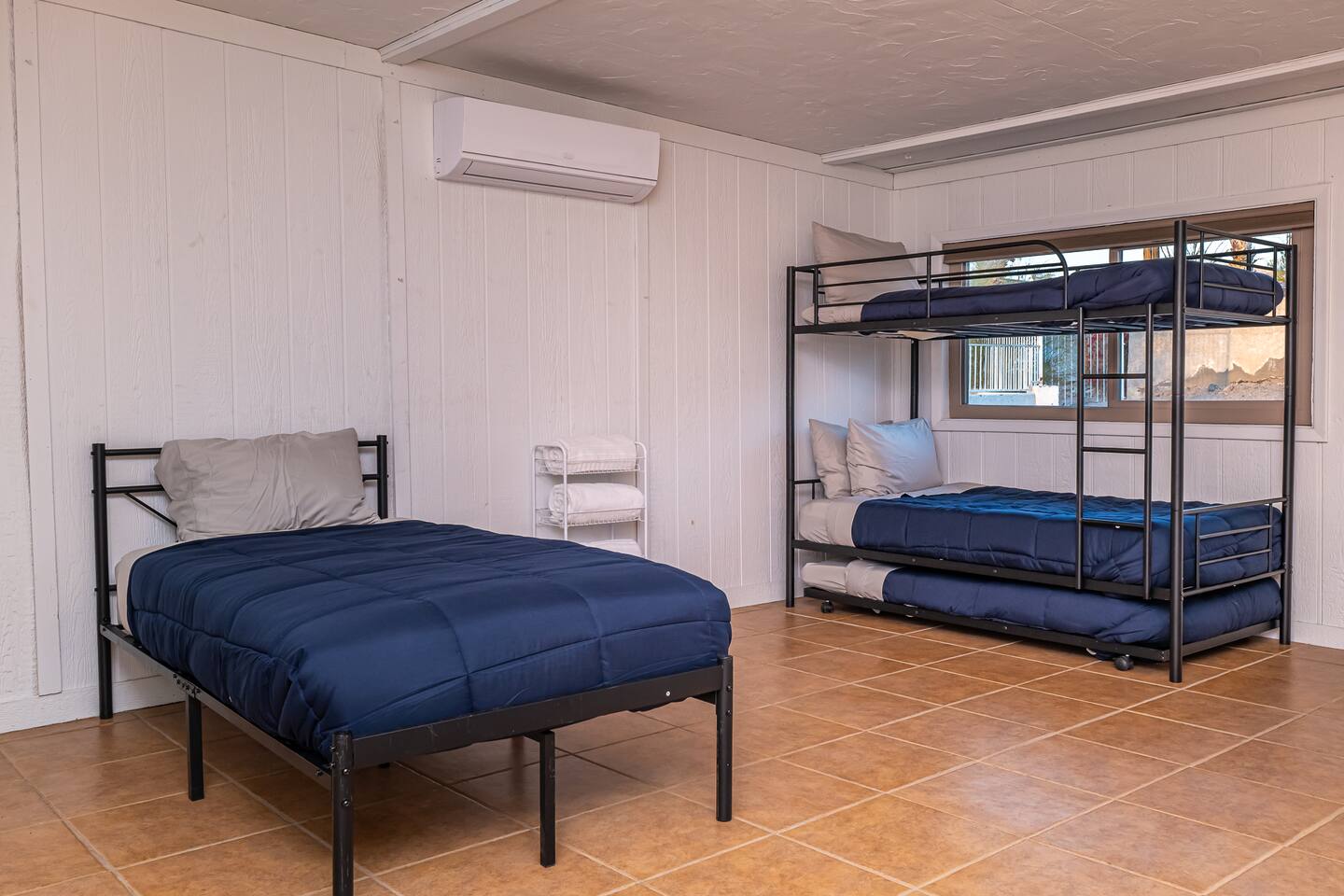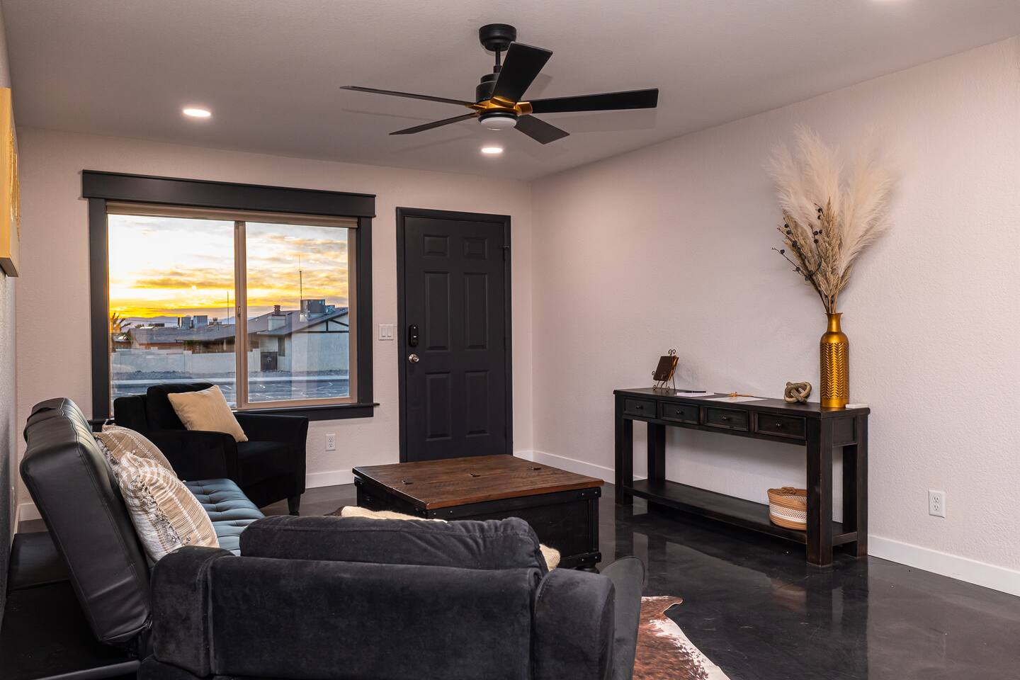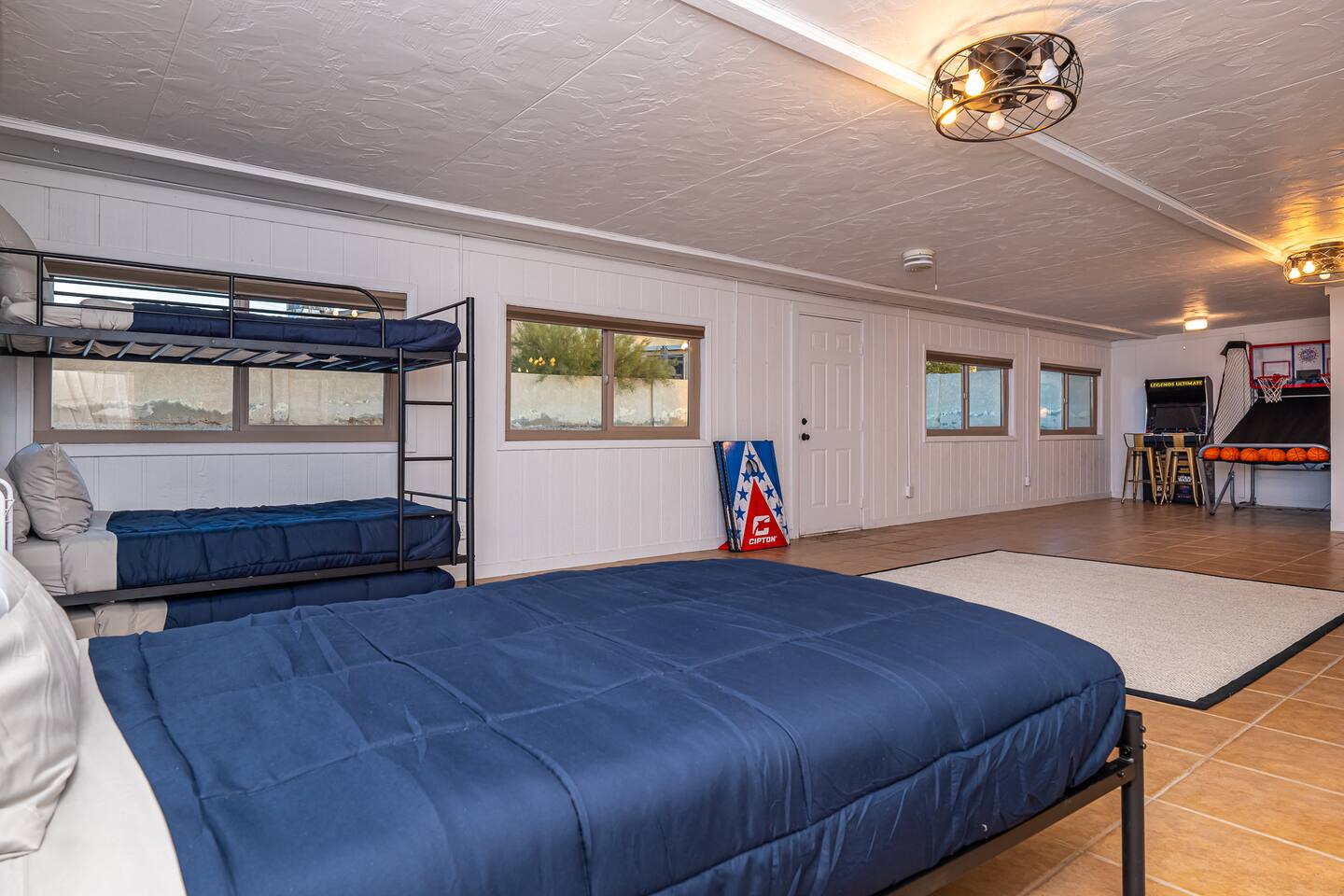 Crisp, clean and spacious! Once you enter you'll notice the gorgeous epoxy floors and updated design! The three bedrooms have all the hallmarks of a restful vacation, most importantly-- comfy beds! Master bedroom: Queen bed (Sleeps 2) Bedroom 2: Full bed (sleeps 2) Bedroom 3: Full bed (Sleeps 2) Game room: (3) twin beds (Sleeps 3) Living room: Futon (Sleeps 1) Total: 10 guests PARKING: You may utilize the driveway or the boat parking on the side.