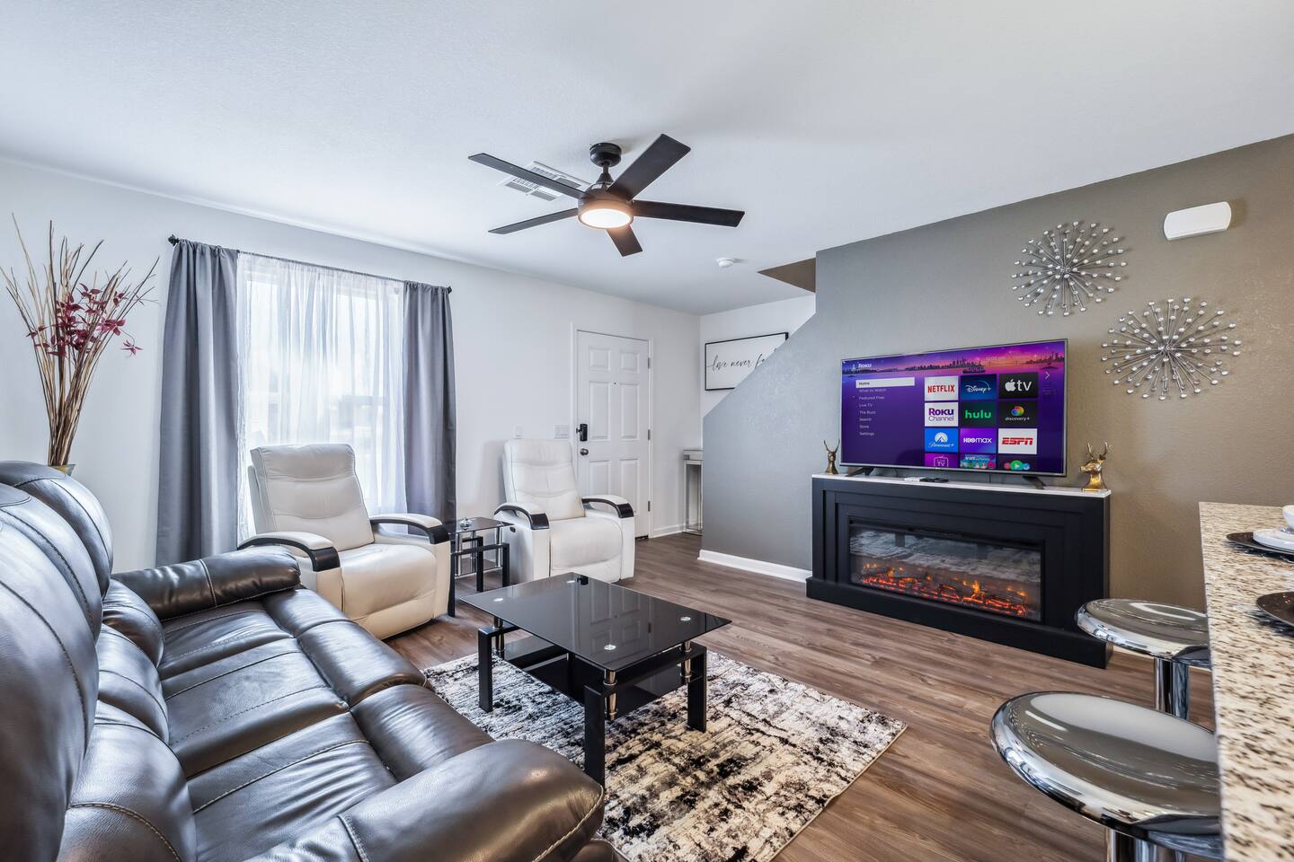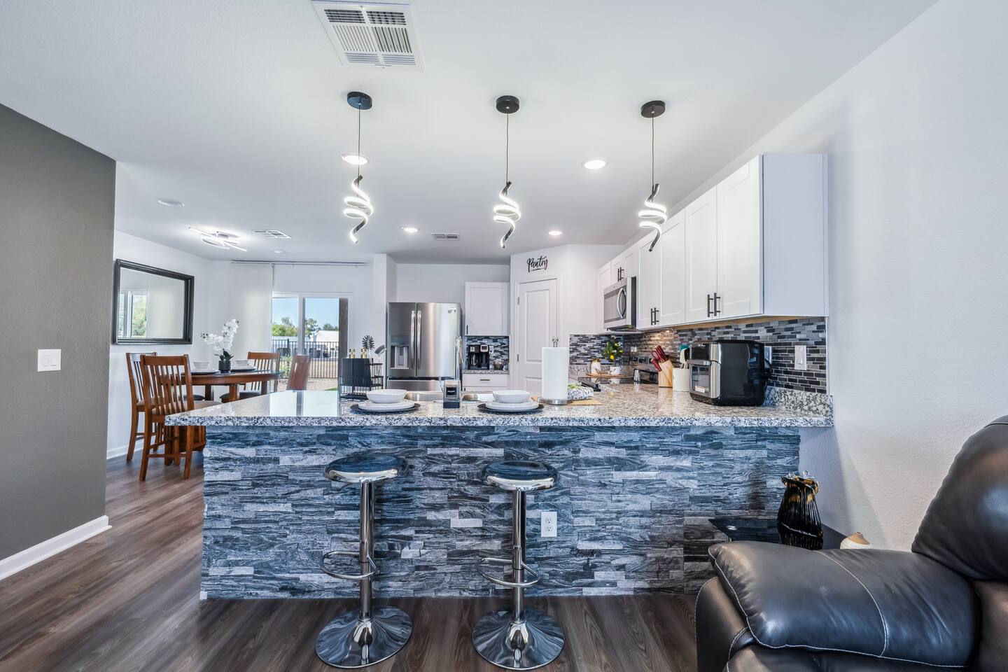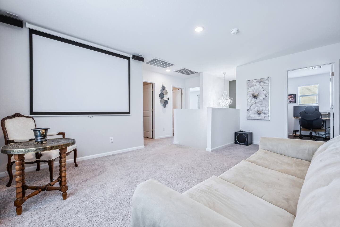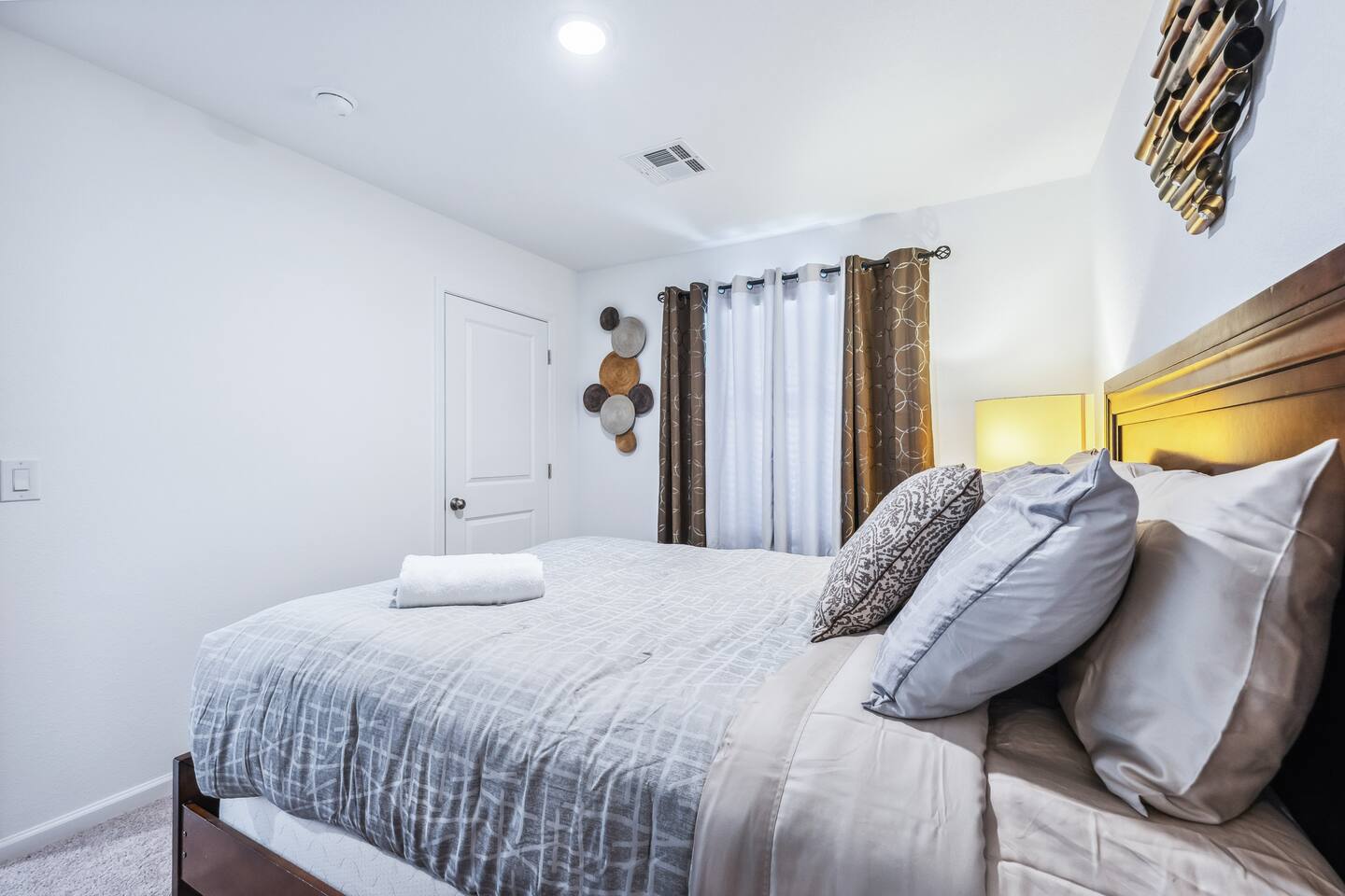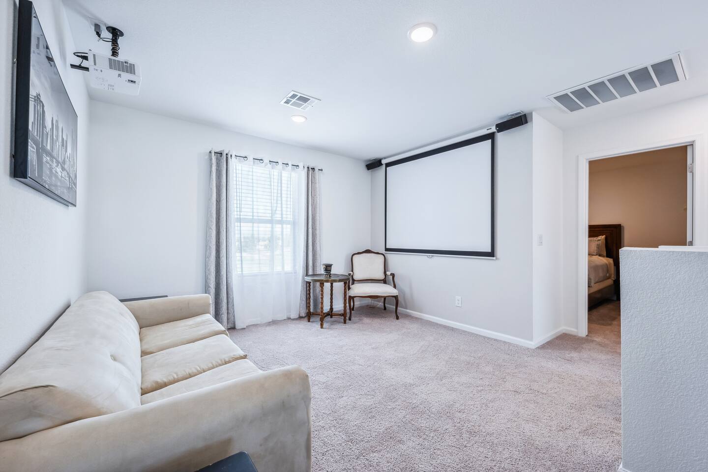 🏠Interior Features: ✅ Living Area: Spacious open-concept living room with modern décor, plush seating, and a large flat-screen Smart TV. ✅ Kitchen & Dining: Fully equipped kitchen with stainless steel appliances, granite countertops, a large island with bar seating, and all essential cookware. Dining area seats 6–8 guests comfortably. Bedrooms: ✅Master bedroom: King-size bed, walk-in closet, and ensuite bathroom with dual sinks, soaking tub, and walk-in shower. ✅Bedrooms 2–4: Each features a comfortable queen-size bed with fresh linens and tasteful furnishings. Bathrooms: ✅3 total bathrooms – including the luxurious master bath, a shared full bath, and a half bath for guest convenience. Private Theater Room: ✅Enjoy cinematic experiences with tiered seating, a large screen, surround sound, and ambient lighting. Home Gym: ✅Stay fit with cardio equipment, free weights, resistance bands, and yoga mats—all in a designated fitness space. Laundry Room: ✅Full-size washer and dryer with laundry essentials provided. Climate Control: ✅Central air conditioning and heating to keep you comfortable year-round.