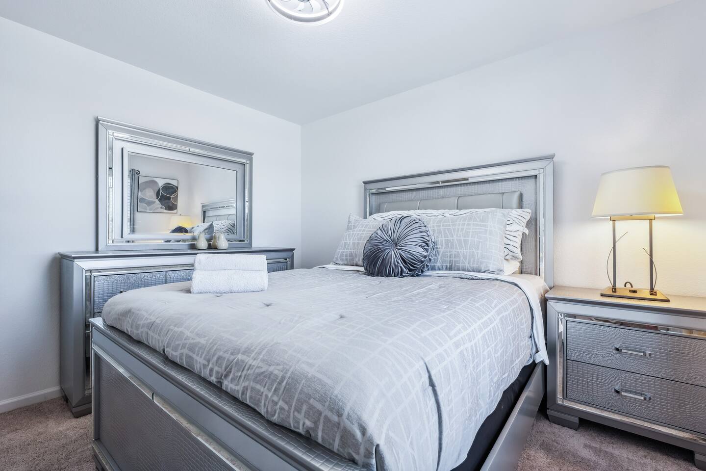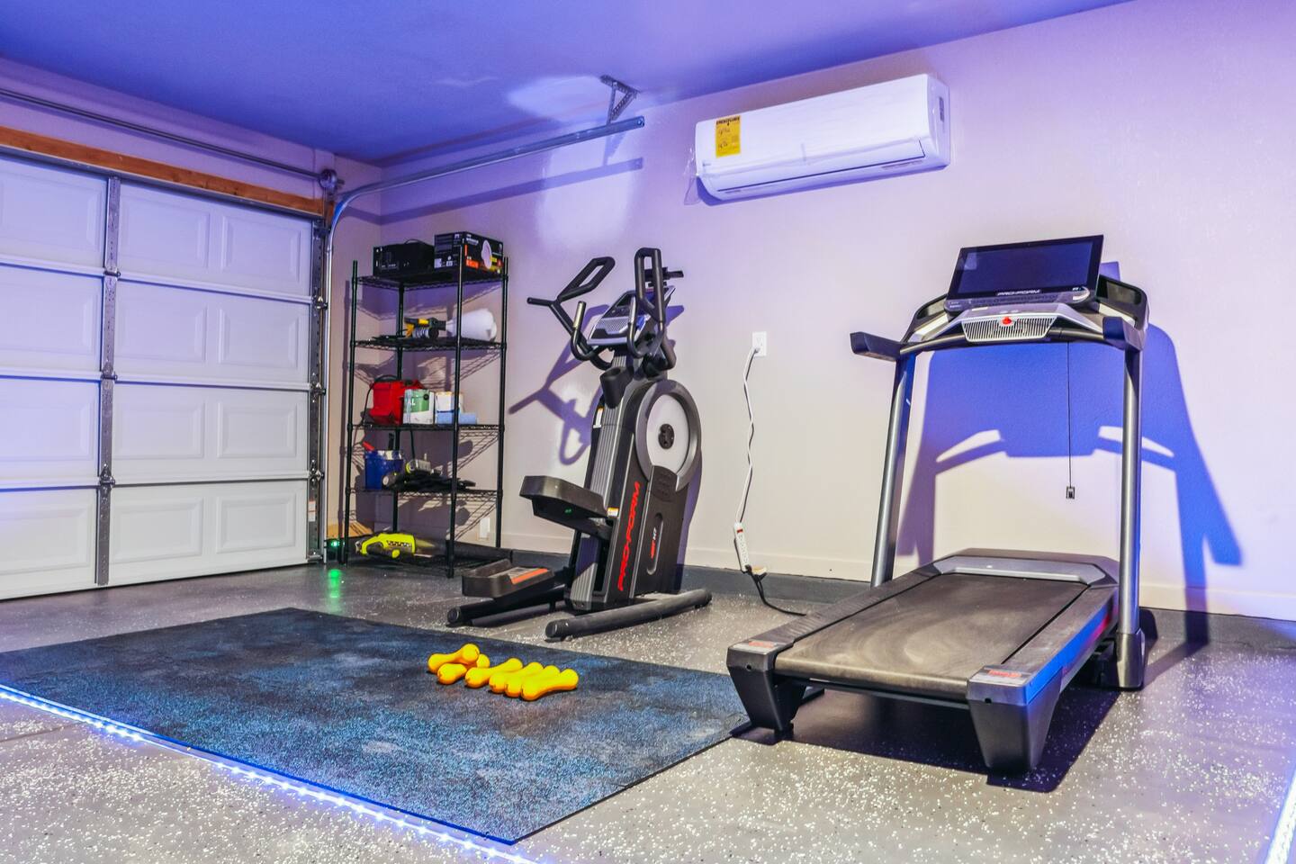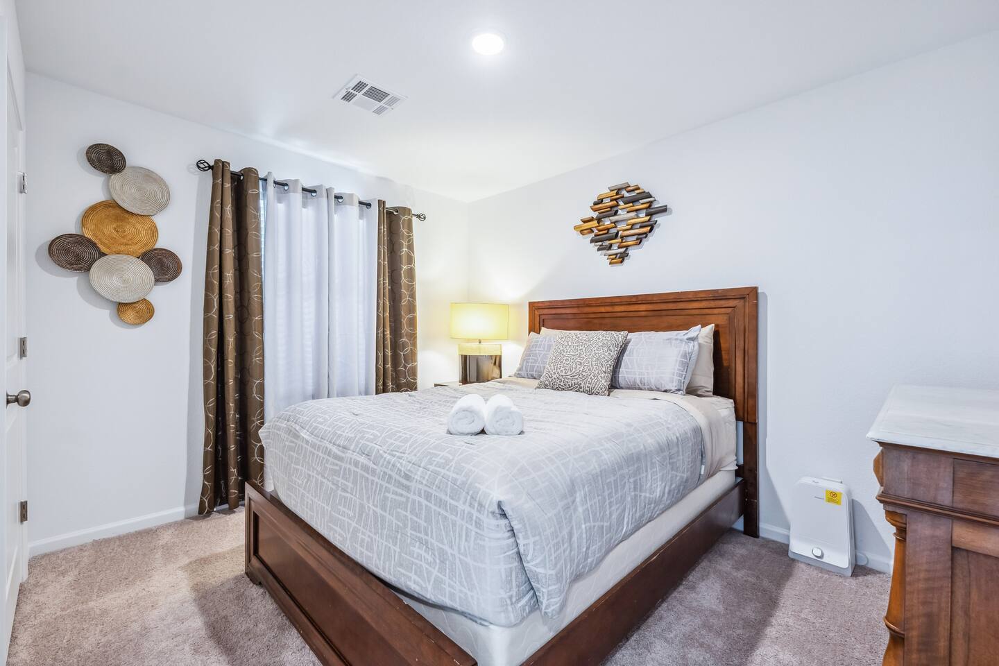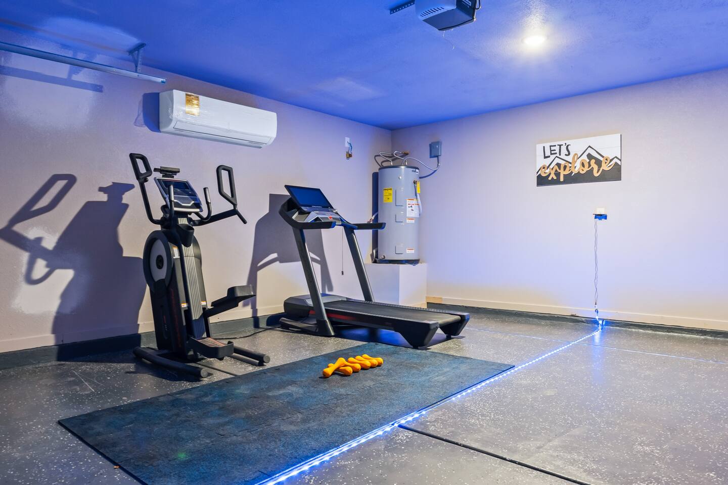 🏠Interior Features: ✅ Living Area: Spacious open-concept living room with modern décor, plush seating, and a large flat-screen Smart TV. ✅ Kitchen & Dining: Fully equipped kitchen with stainless steel appliances, granite countertops, a large island with bar seating, and all essential cookware. Dining area seats 6–8 guests comfortably. Bedrooms: ✅Master bedroom: King-size bed, walk-in closet, and ensuite bathroom with dual sinks, soaking tub, and walk-in shower. ✅Bedrooms 2–4: Each features a comfortable queen-size bed with fresh linens and tasteful furnishings. Bathrooms: ✅3 total bathrooms – including the luxurious master bath, a shared full bath, and a half bath for guest convenience. Private Theater Room: ✅Enjoy cinematic experiences with tiered seating, a large screen, surround sound, and ambient lighting. Home Gym: ✅Stay fit with cardio equipment, free weights, resistance bands, and yoga mats—all in a designated fitness space. Laundry Room: ✅Full-size washer and dryer with laundry essentials provided. Climate Control: ✅Central air conditioning and heating to keep you comfortable year-round.