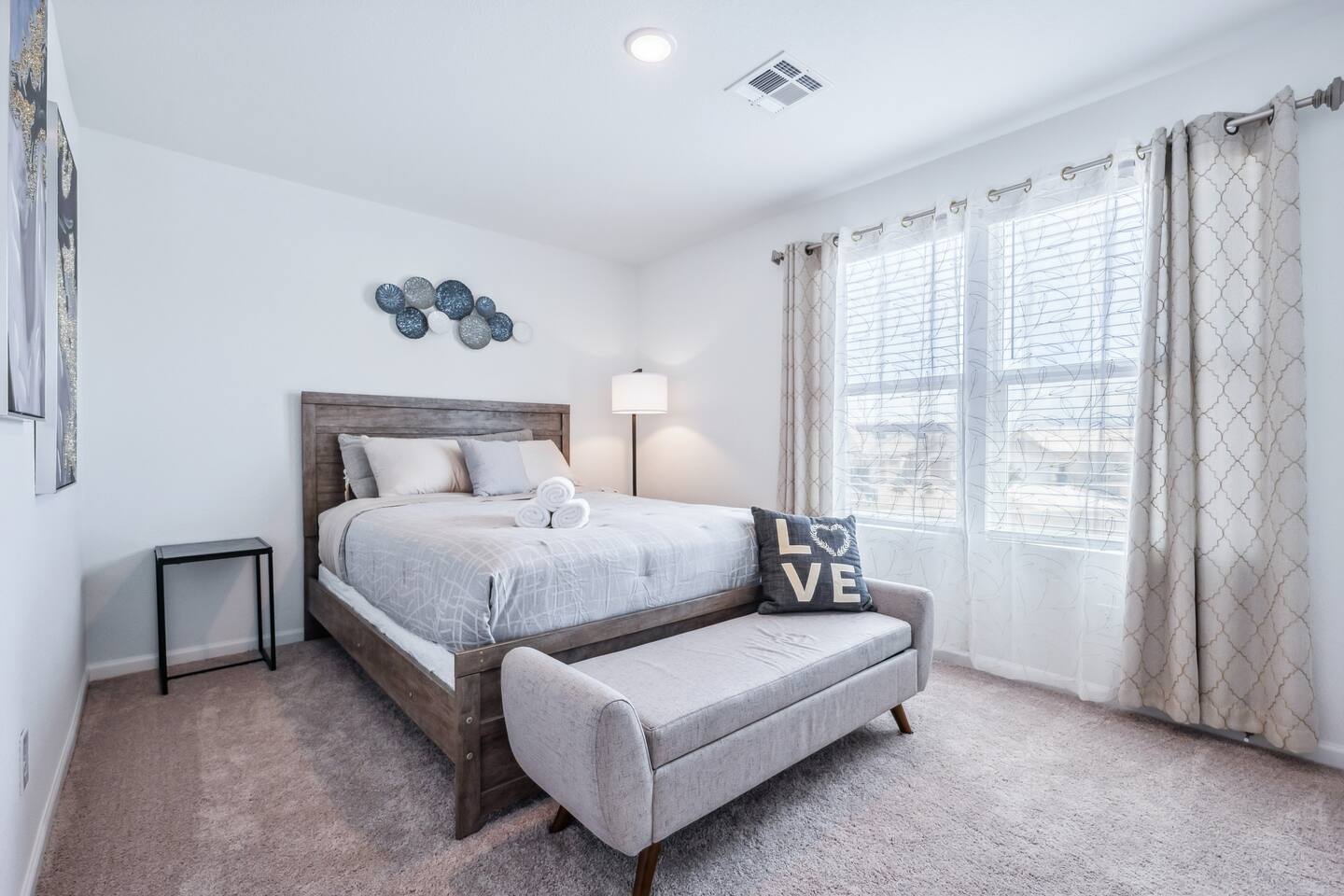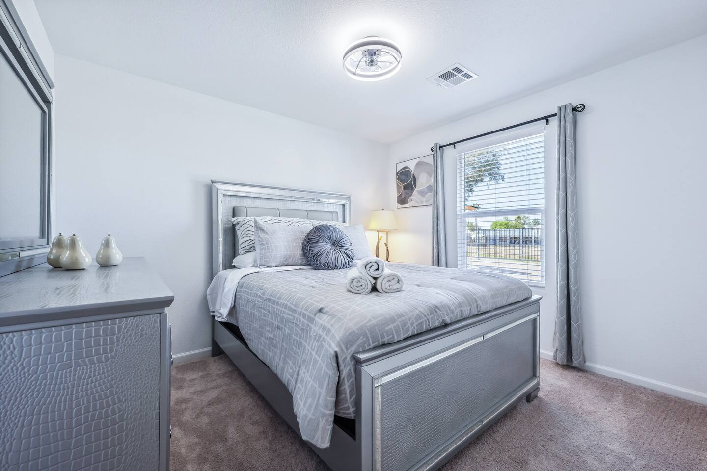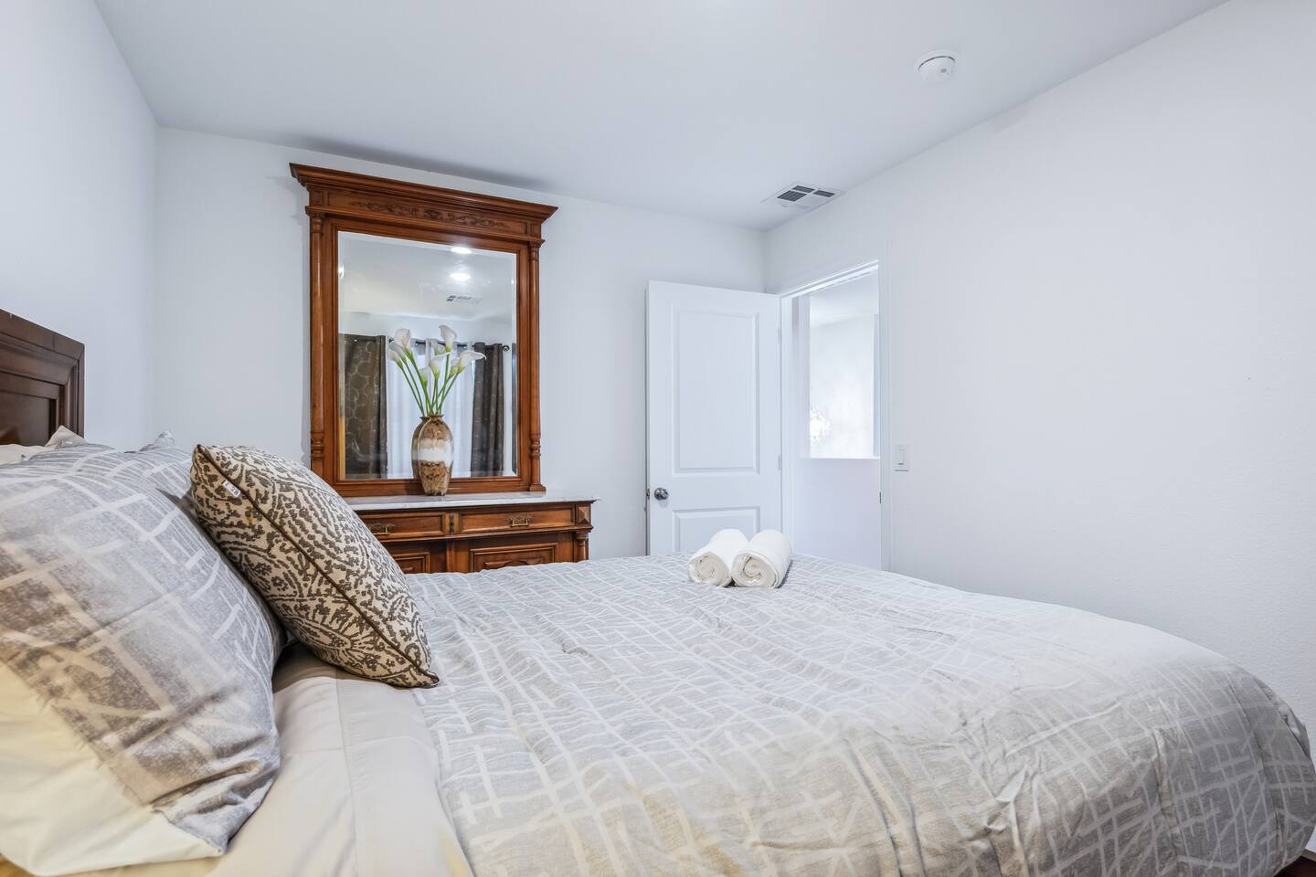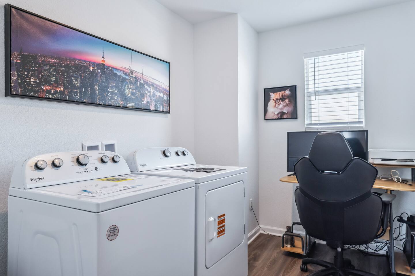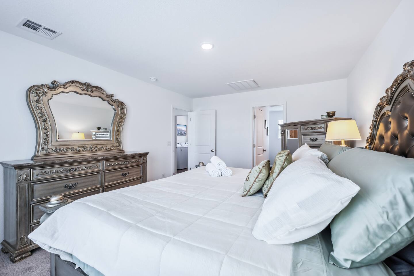 🏠Interior Features: ✅ Living Area: Spacious open-concept living room with modern décor, plush seating, and a large flat-screen Smart TV. ✅ Kitchen & Dining: Fully equipped kitchen with stainless steel appliances, granite countertops, a large island with bar seating, and all essential cookware. Dining area seats 6–8 guests comfortably. Bedrooms: ✅Master bedroom: King-size bed, walk-in closet, and ensuite bathroom with dual sinks, soaking tub, and walk-in shower. ✅Bedrooms 2–4: Each features a comfortable queen-size bed with fresh linens and tasteful furnishings. Bathrooms: ✅3 total bathrooms – including the luxurious master bath, a shared full bath, and a half bath for guest convenience. Private Theater Room: ✅Enjoy cinematic experiences with tiered seating, a large screen, surround sound, and ambient lighting. Home Gym: ✅Stay fit with cardio equipment, free weights, resistance bands, and yoga mats—all in a designated fitness space. Laundry Room: ✅Full-size washer and dryer with laundry essentials provided. Climate Control: ✅Central air conditioning and heating to keep you comfortable year-round.
