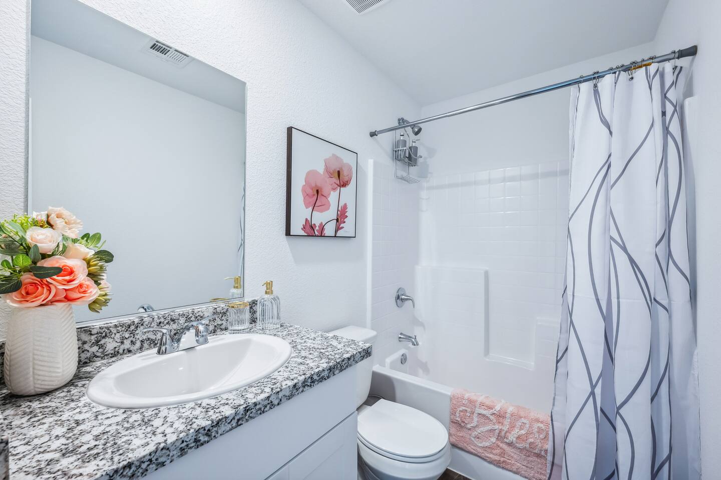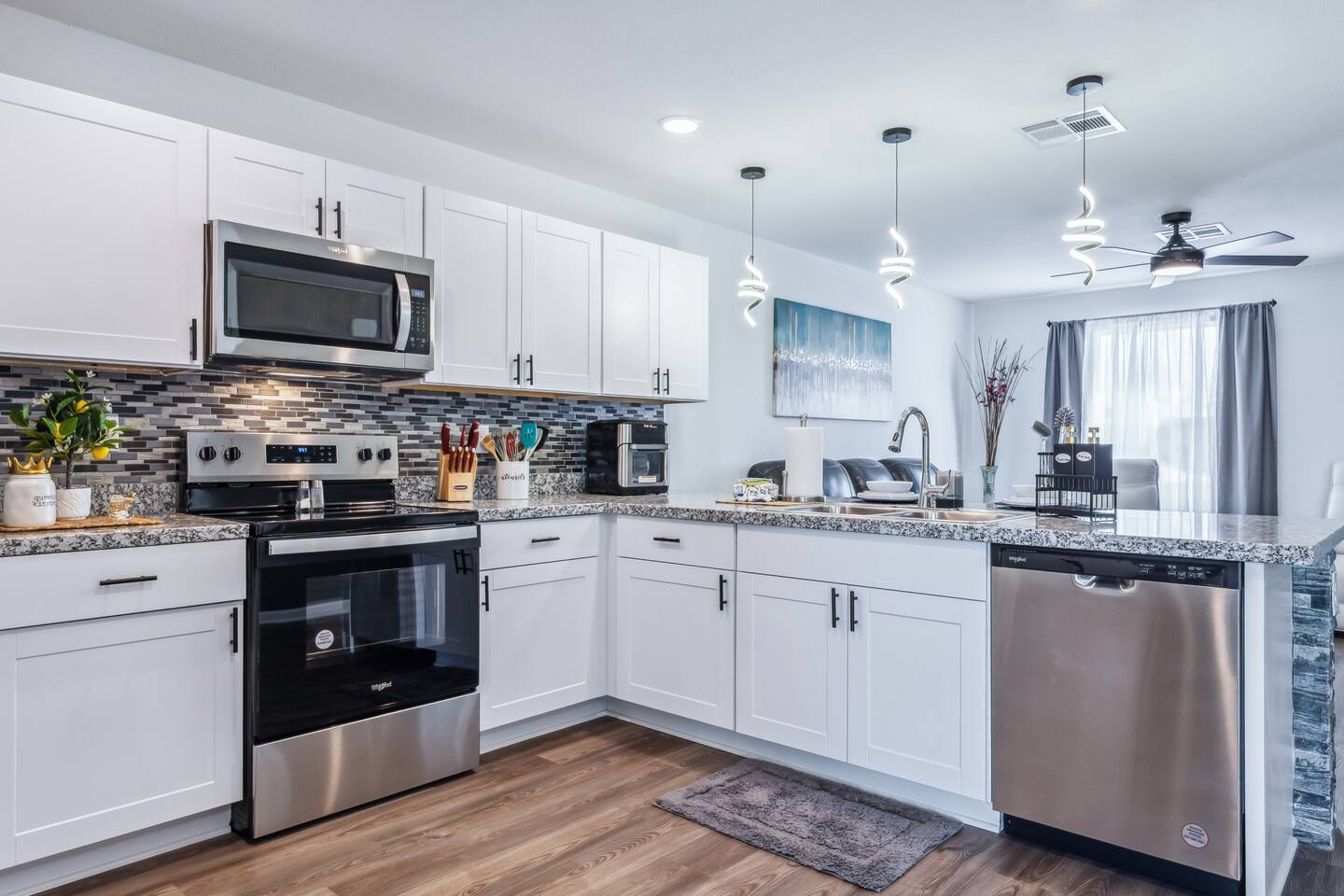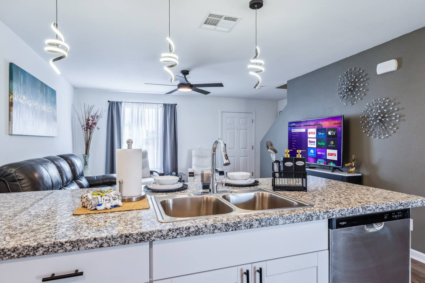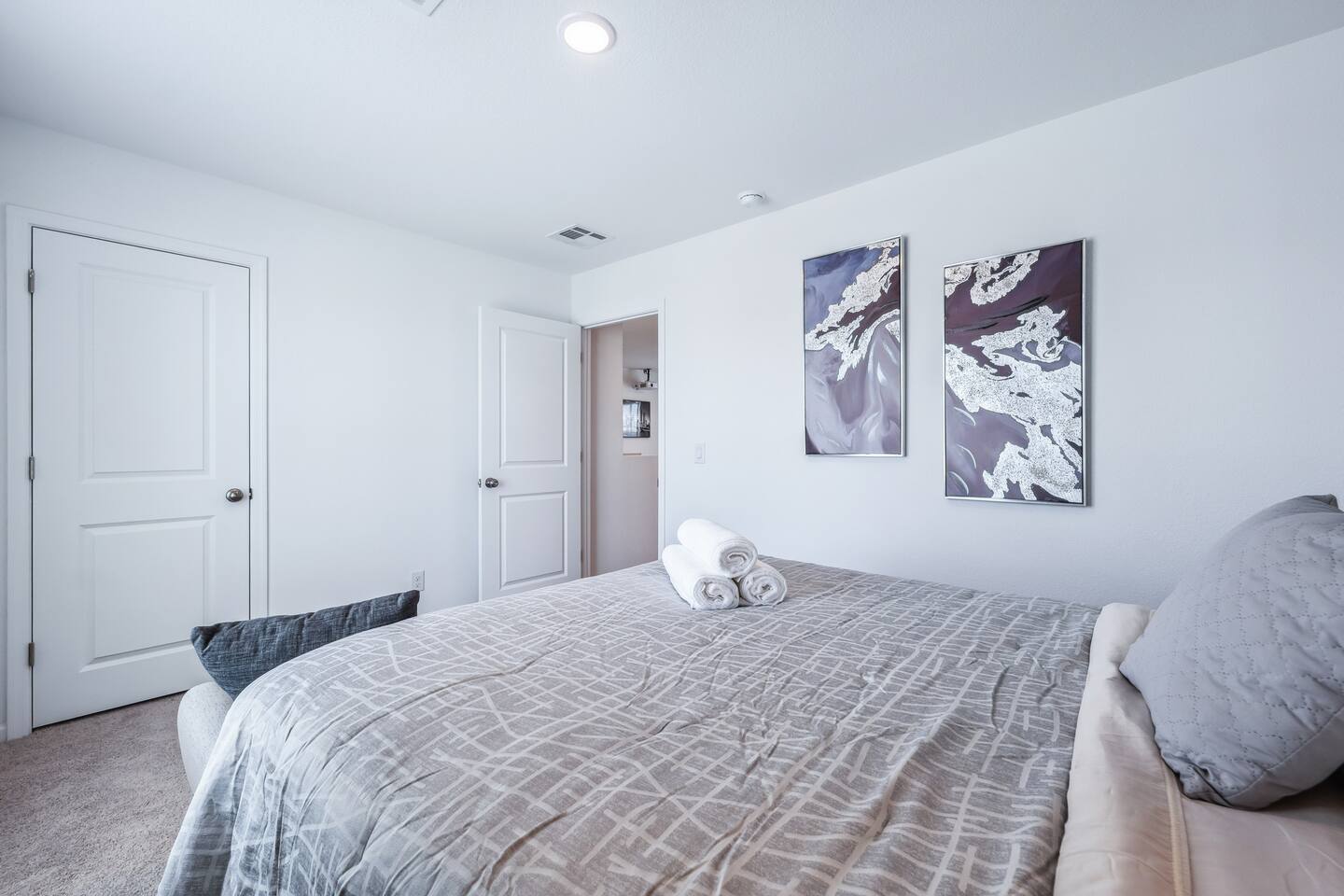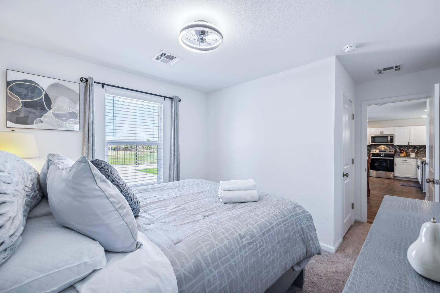 🏠Interior Features: ✅ Living Area: Spacious open-concept living room with modern décor, plush seating, and a large flat-screen Smart TV. ✅ Kitchen & Dining: Fully equipped kitchen with stainless steel appliances, granite countertops, a large island with bar seating, and all essential cookware. Dining area seats 6–8 guests comfortably. Bedrooms: ✅Master bedroom: King-size bed, walk-in closet, and ensuite bathroom with dual sinks, soaking tub, and walk-in shower. ✅Bedrooms 2–4: Each features a comfortable queen-size bed with fresh linens and tasteful furnishings. Bathrooms: ✅3 total bathrooms – including the luxurious master bath, a shared full bath, and a half bath for guest convenience. Private Theater Room: ✅Enjoy cinematic experiences with tiered seating, a large screen, surround sound, and ambient lighting. Home Gym: ✅Stay fit with cardio equipment, free weights, resistance bands, and yoga mats—all in a designated fitness space. Laundry Room: ✅Full-size washer and dryer with laundry essentials provided. Climate Control: ✅Central air conditioning and heating to keep you comfortable year-round.