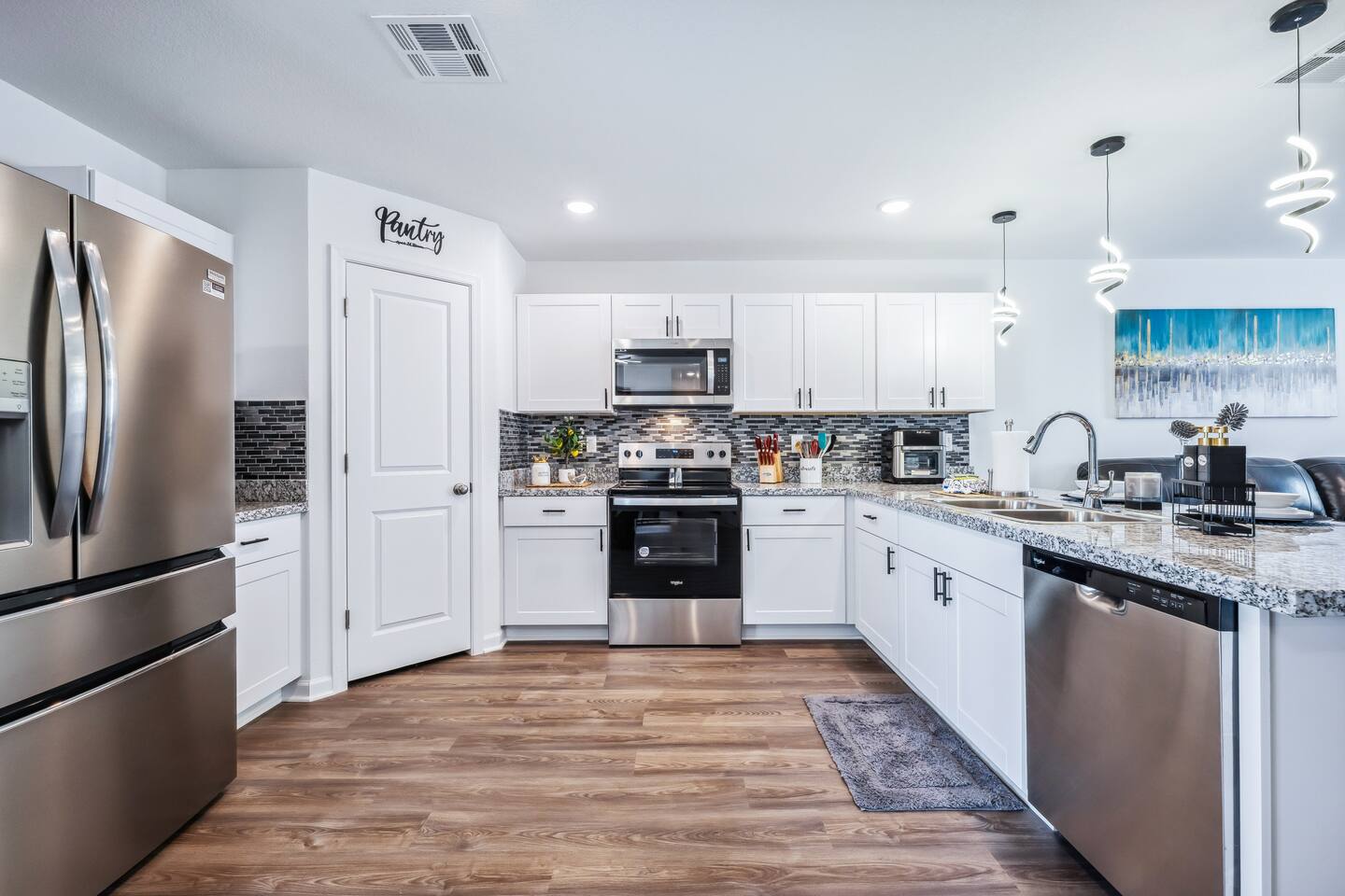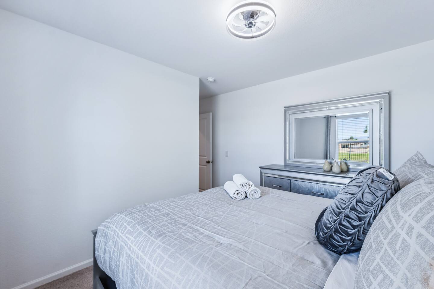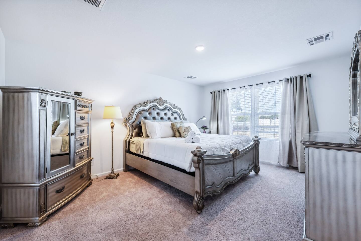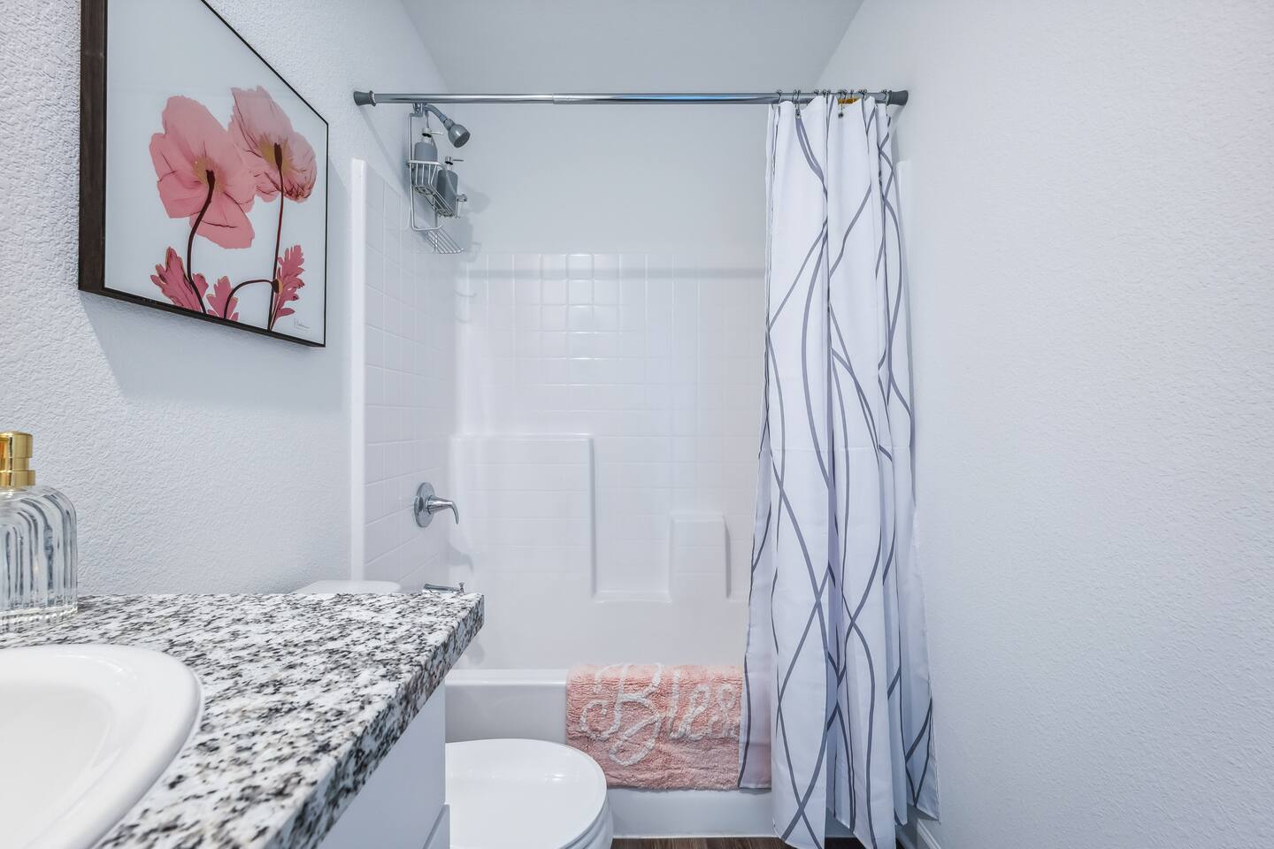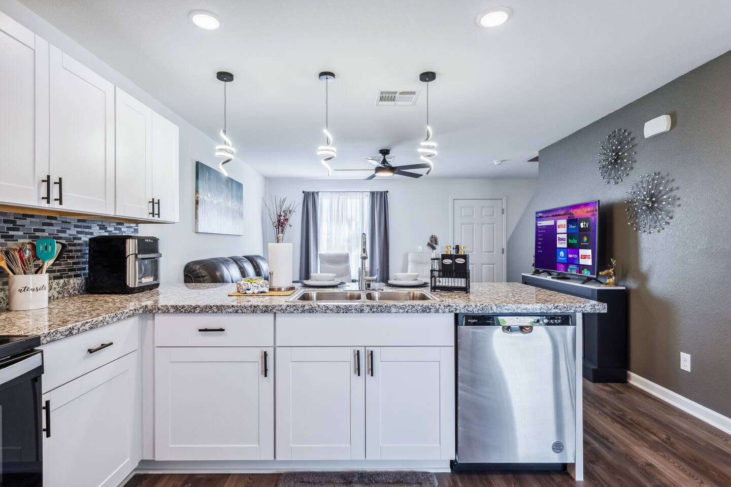 🏠Interior Features: ✅ Living Area: Spacious open-concept living room with modern décor, plush seating, and a large flat-screen Smart TV. ✅ Kitchen & Dining: Fully equipped kitchen with stainless steel appliances, granite countertops, a large island with bar seating, and all essential cookware. Dining area seats 6–8 guests comfortably. Bedrooms: ✅Master bedroom: King-size bed, walk-in closet, and ensuite bathroom with dual sinks, soaking tub, and walk-in shower. ✅Bedrooms 2–4: Each features a comfortable queen-size bed with fresh linens and tasteful furnishings. Bathrooms: ✅3 total bathrooms – including the luxurious master bath, a shared full bath, and a half bath for guest convenience. Private Theater Room: ✅Enjoy cinematic experiences with tiered seating, a large screen, surround sound, and ambient lighting. Home Gym: ✅Stay fit with cardio equipment, free weights, resistance bands, and yoga mats—all in a designated fitness space. Laundry Room: ✅Full-size washer and dryer with laundry essentials provided. Climate Control: ✅Central air conditioning and heating to keep you comfortable year-round.