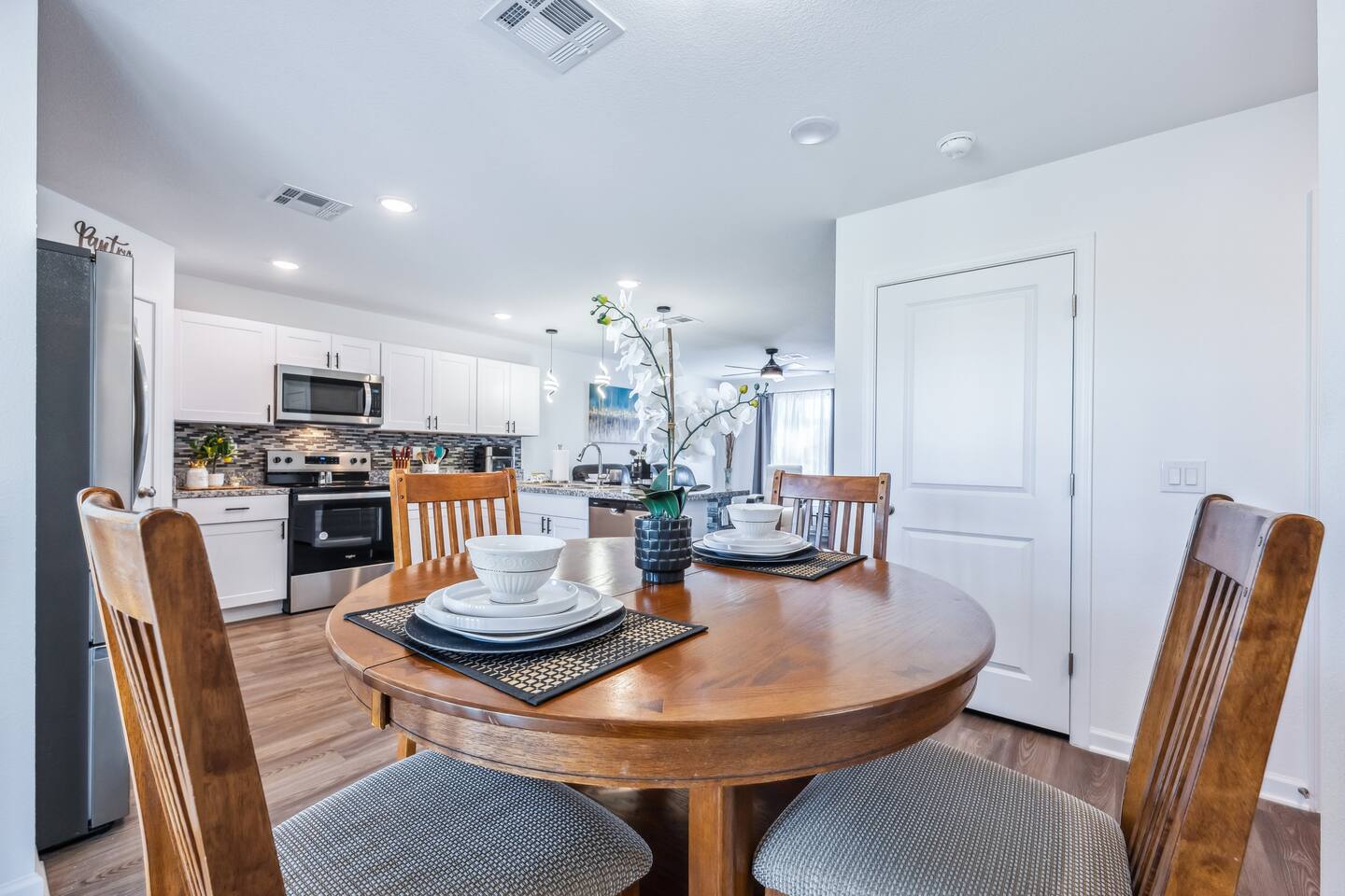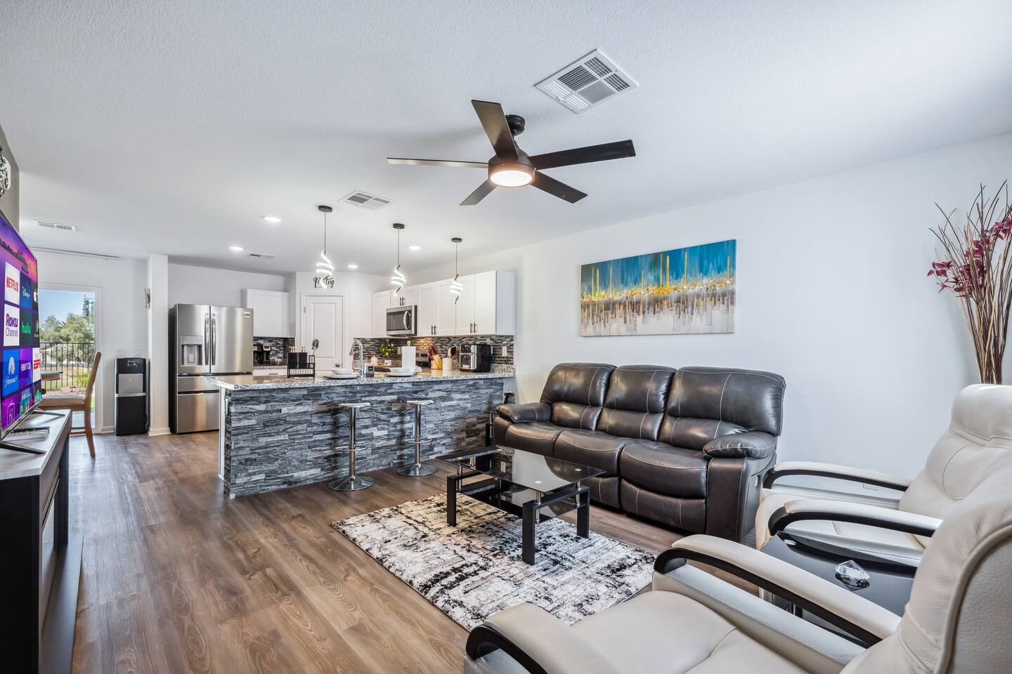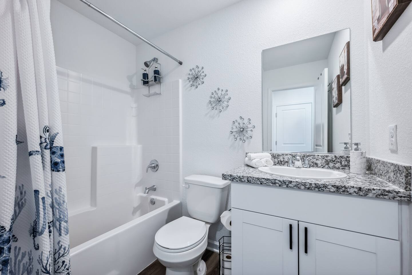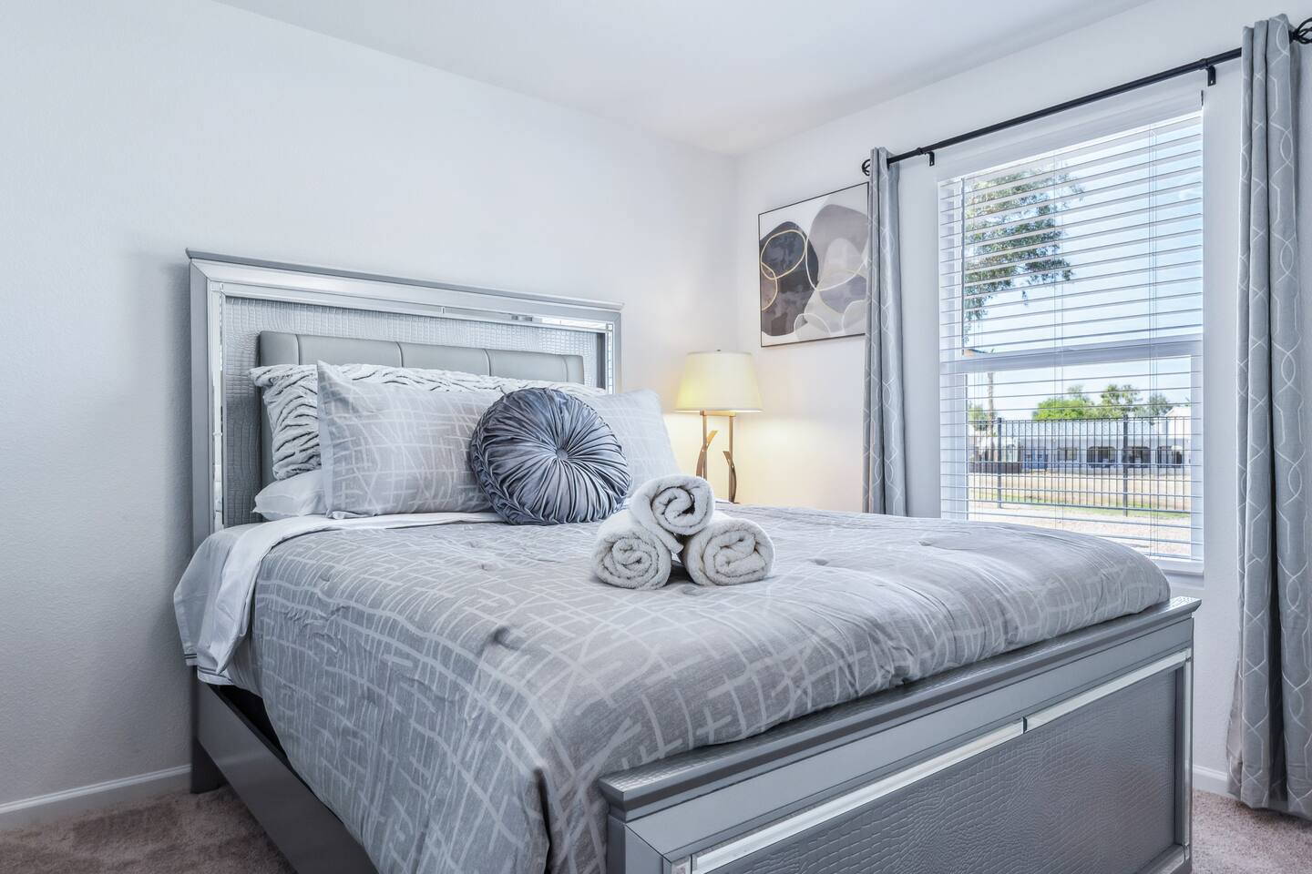 🏠Interior Features: ✅ Living Area: Spacious open-concept living room with modern décor, plush seating, and a large flat-screen Smart TV. ✅ Kitchen & Dining: Fully equipped kitchen with stainless steel appliances, granite countertops, a large island with bar seating, and all essential cookware. Dining area seats 6–8 guests comfortably. Bedrooms: ✅Master bedroom: King-size bed, walk-in closet, and ensuite bathroom with dual sinks, soaking tub, and walk-in shower. ✅Bedrooms 2–4: Each features a comfortable queen-size bed with fresh linens and tasteful furnishings. Bathrooms: ✅3 total bathrooms – including the luxurious master bath, a shared full bath, and a half bath for guest convenience. Private Theater Room: ✅Enjoy cinematic experiences with tiered seating, a large screen, surround sound, and ambient lighting. Home Gym: ✅Stay fit with cardio equipment, free weights, resistance bands, and yoga mats—all in a designated fitness space. Laundry Room: ✅Full-size washer and dryer with laundry essentials provided. Climate Control: ✅Central air conditioning and heating to keep you comfortable year-round.