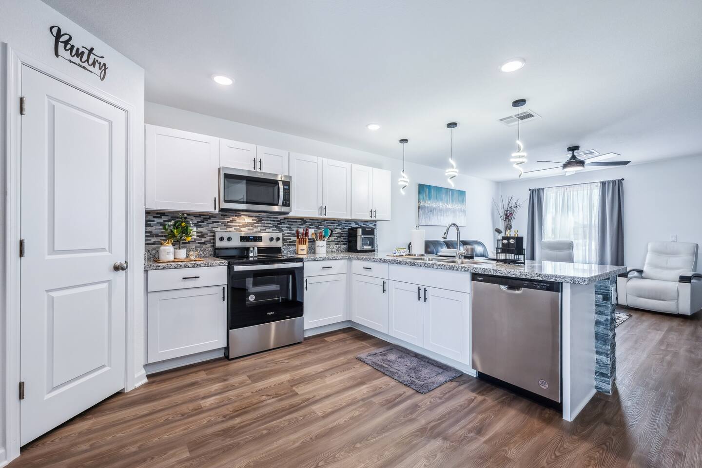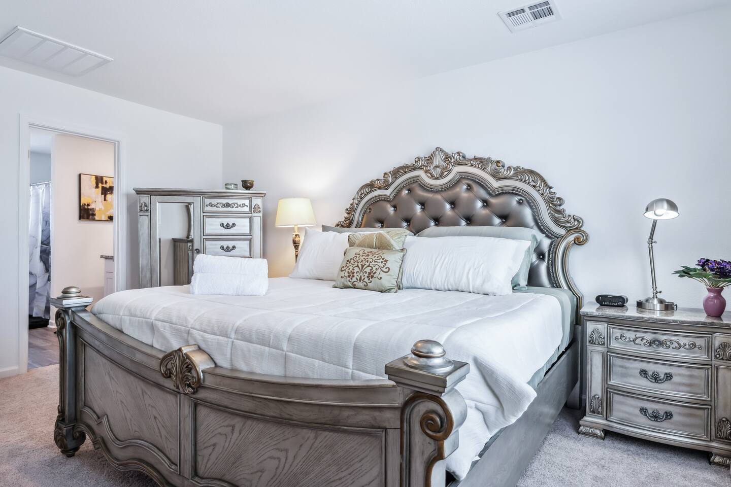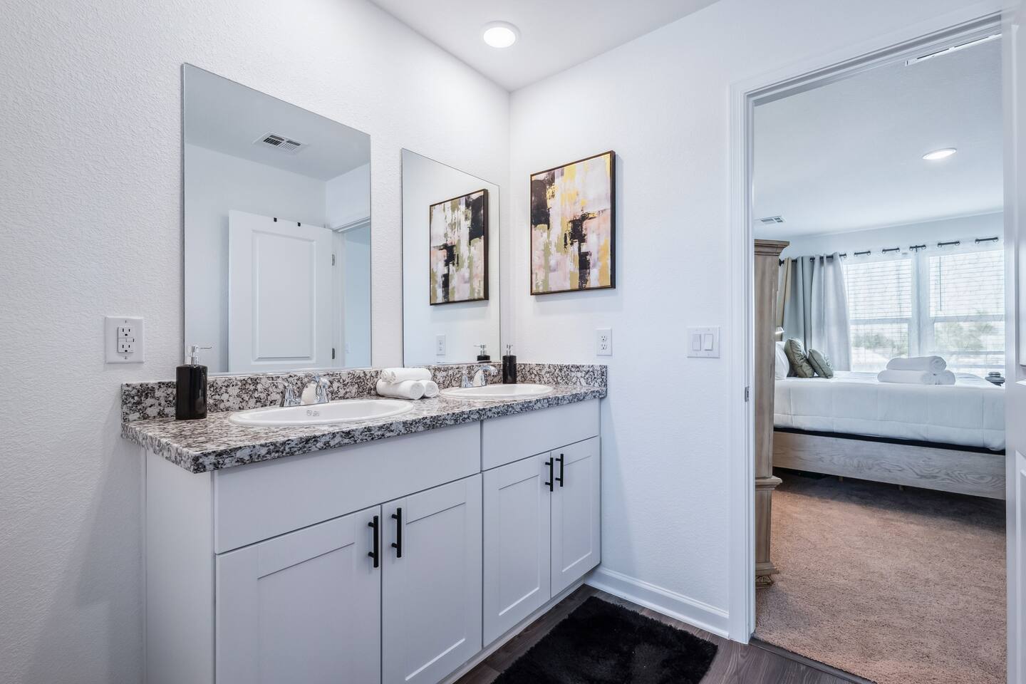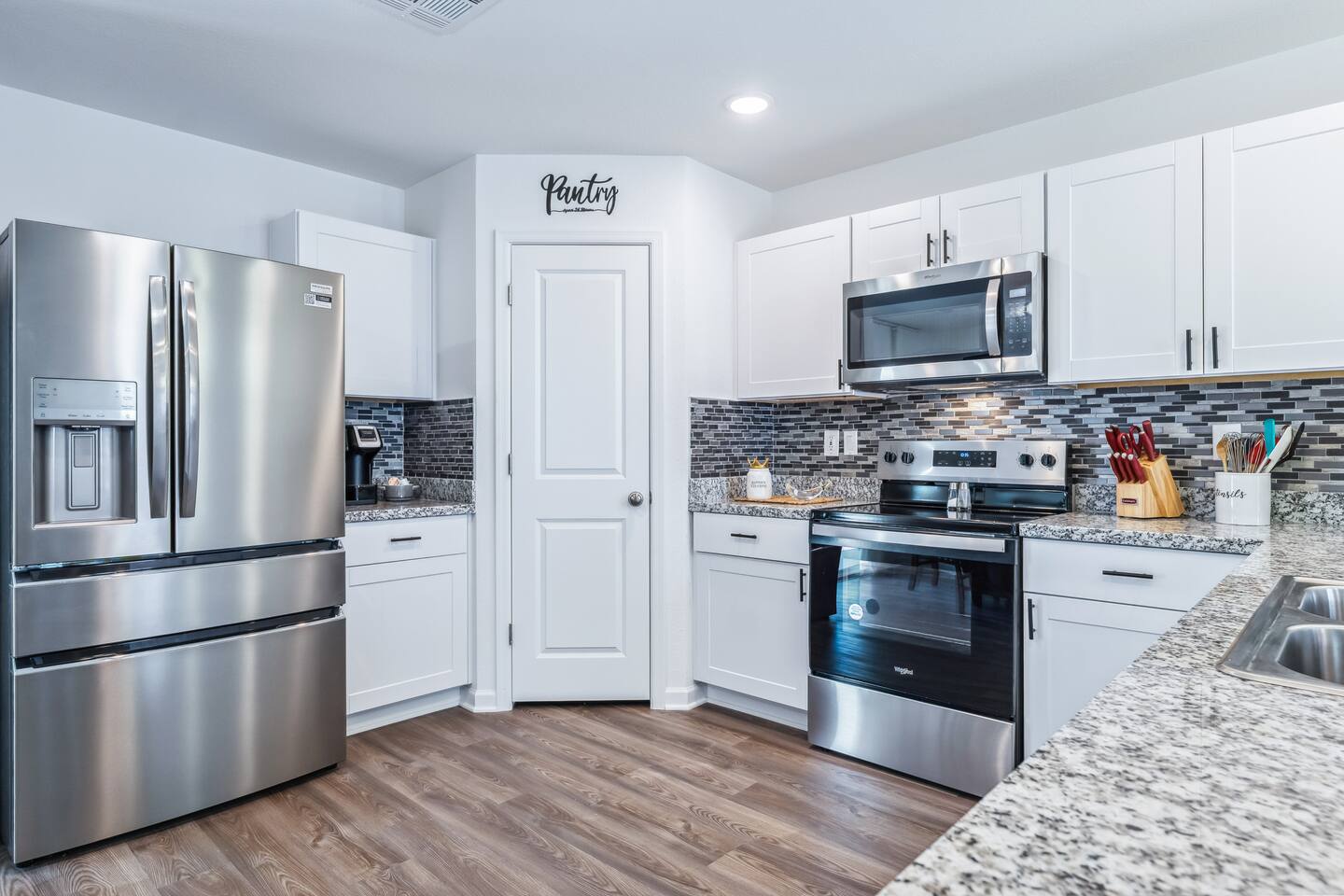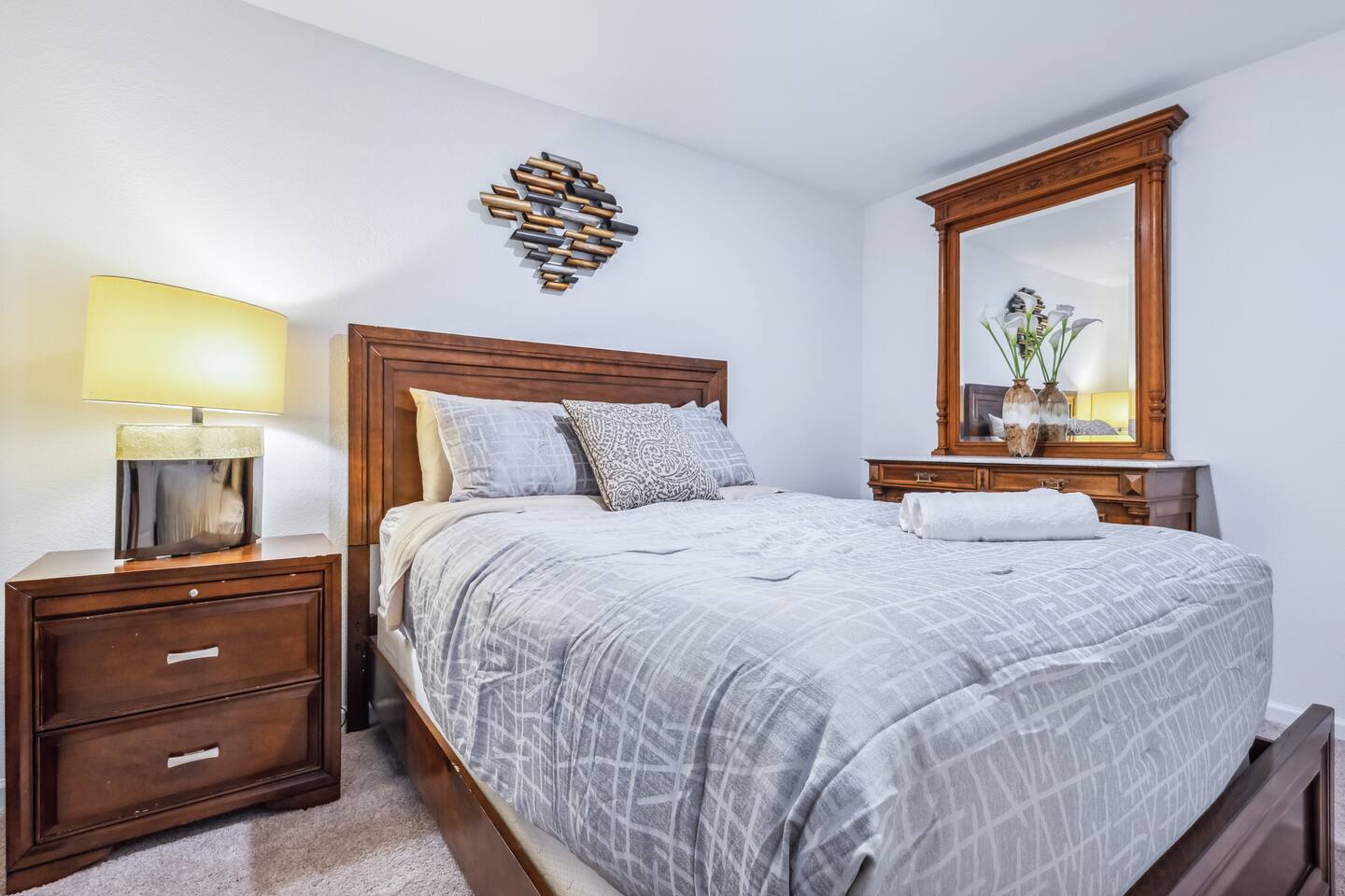 🏠Interior Features: ✅ Living Area: Spacious open-concept living room with modern décor, plush seating, and a large flat-screen Smart TV. ✅ Kitchen & Dining: Fully equipped kitchen with stainless steel appliances, granite countertops, a large island with bar seating, and all essential cookware. Dining area seats 6–8 guests comfortably. Bedrooms: ✅Master bedroom: King-size bed, walk-in closet, and ensuite bathroom with dual sinks, soaking tub, and walk-in shower. ✅Bedrooms 2–4: Each features a comfortable queen-size bed with fresh linens and tasteful furnishings. Bathrooms: ✅3 total bathrooms – including the luxurious master bath, a shared full bath, and a half bath for guest convenience. Private Theater Room: ✅Enjoy cinematic experiences with tiered seating, a large screen, surround sound, and ambient lighting. Home Gym: ✅Stay fit with cardio equipment, free weights, resistance bands, and yoga mats—all in a designated fitness space. Laundry Room: ✅Full-size washer and dryer with laundry essentials provided. Climate Control: ✅Central air conditioning and heating to keep you comfortable year-round.