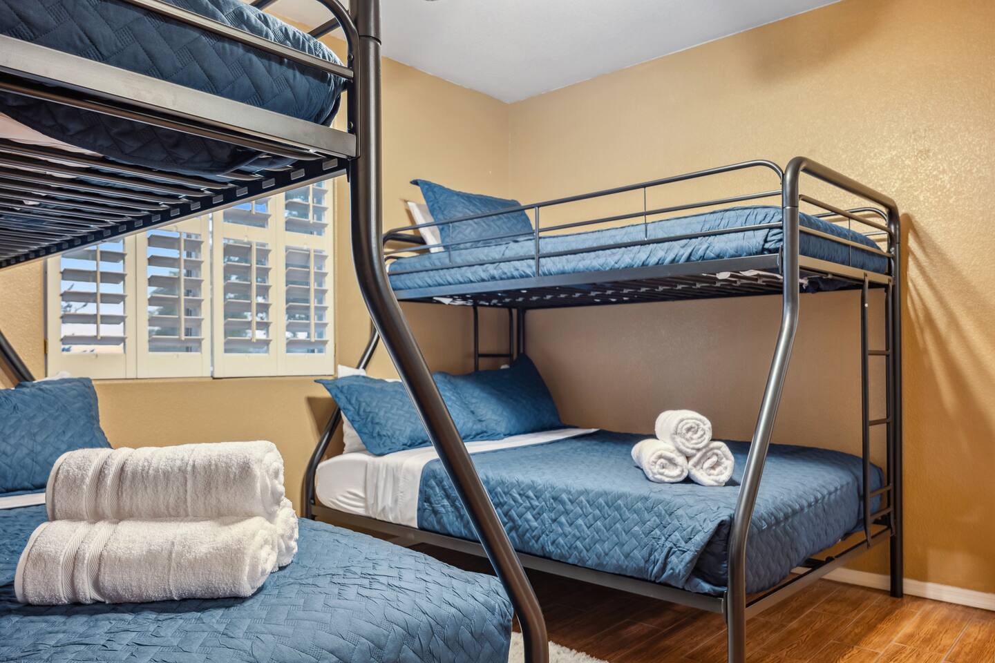 Master bedroom: King bed (sleeps 2) Bedroom 2: (2) twin over full bunk beds (sleeps 6) Bedroom 3: Queen bed (sleeps 2) Total: 6 beds, sleeps 10