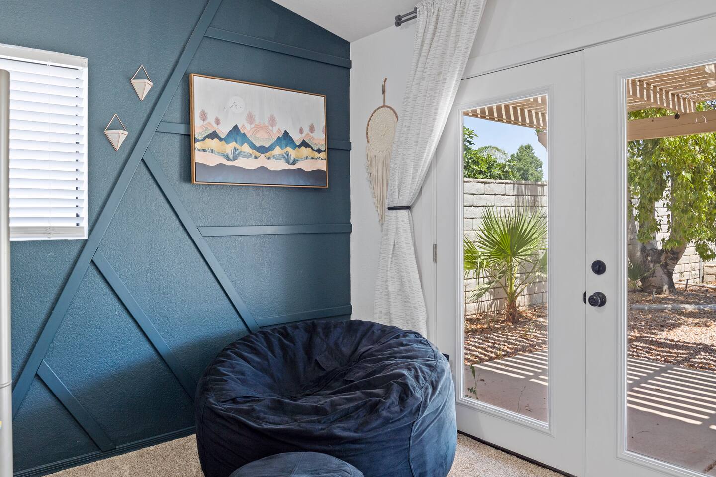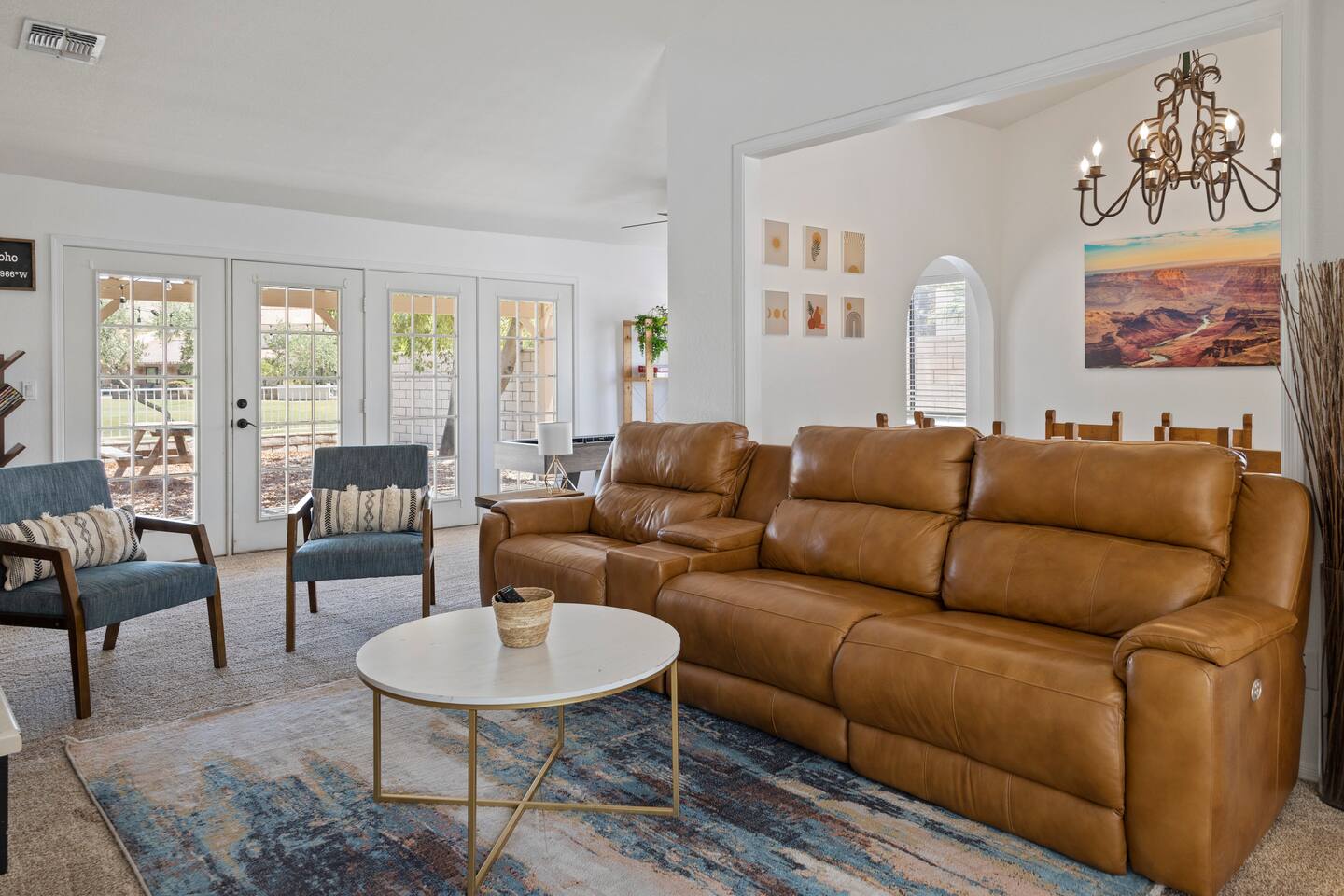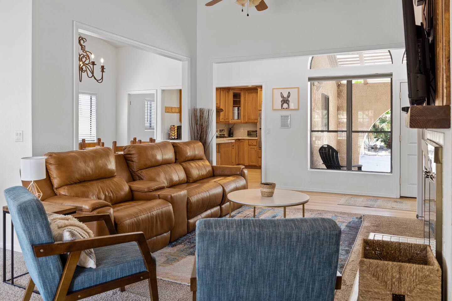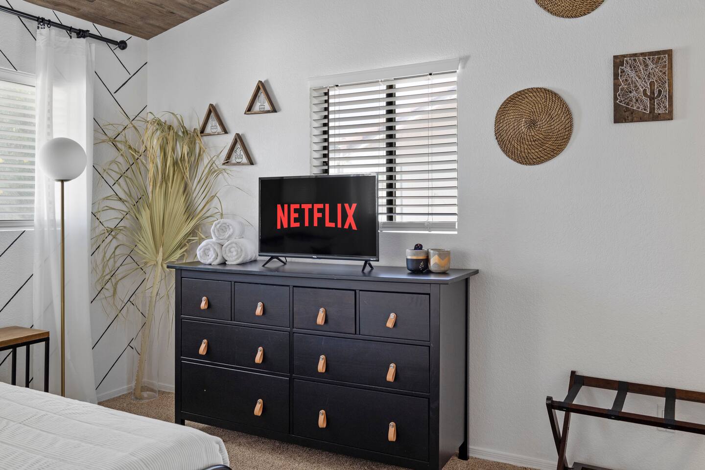 Welcome to The Bullhead Boho! A unique three bedroom home backed up to a tranquil green belt with lakes for fishing less than a quarter mile to the main highway or our private launch and beach. Nestled in Palo Verde Meadows, our home sleeps 8 completely comfortably with space for hanging out in the backyard, or playing shuffleboard or family dinner on the oversized vintage dining table. *Currently decorated for the holidays*