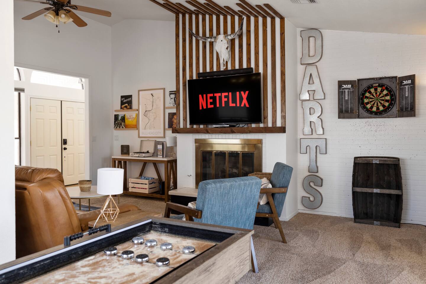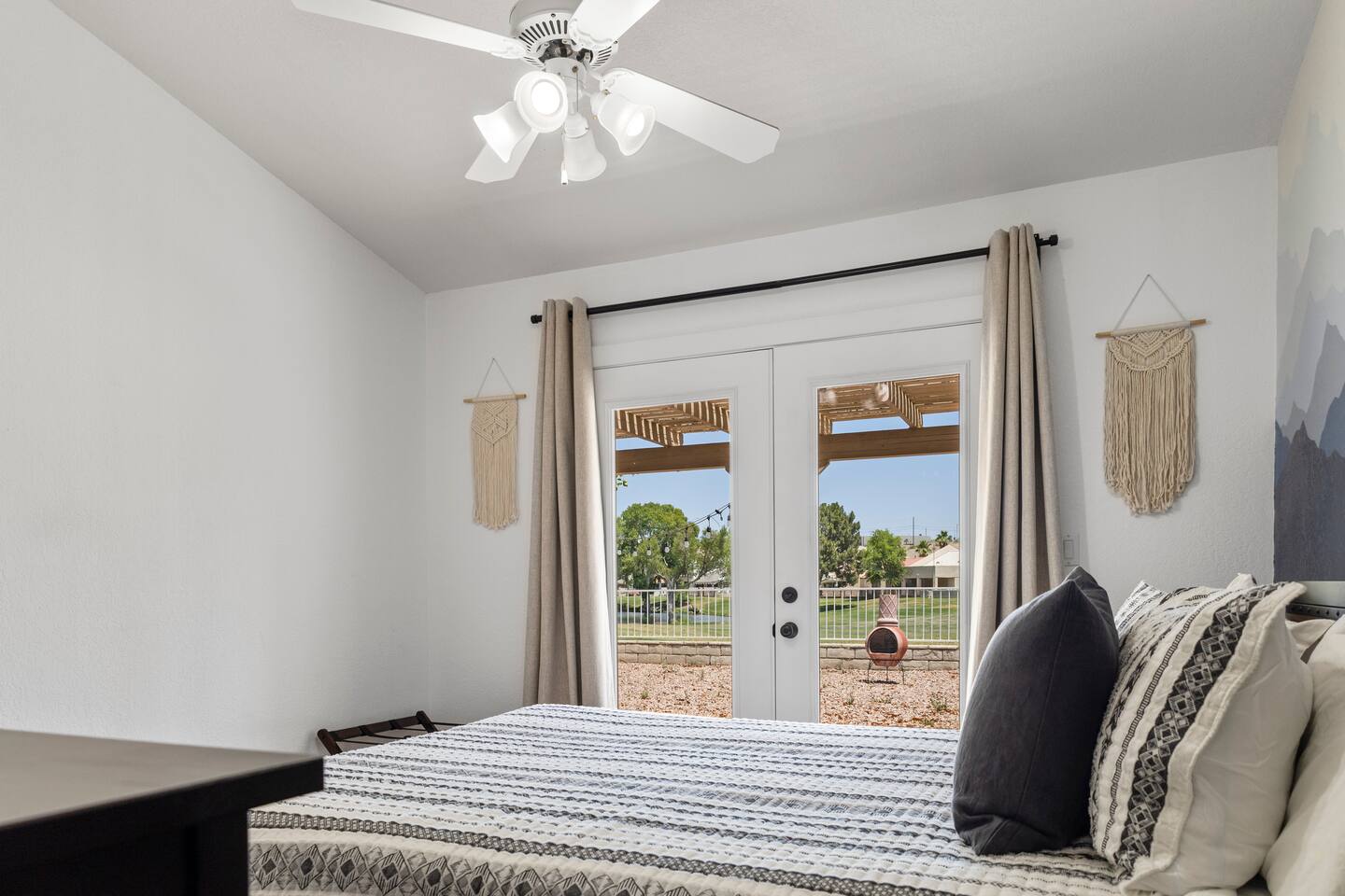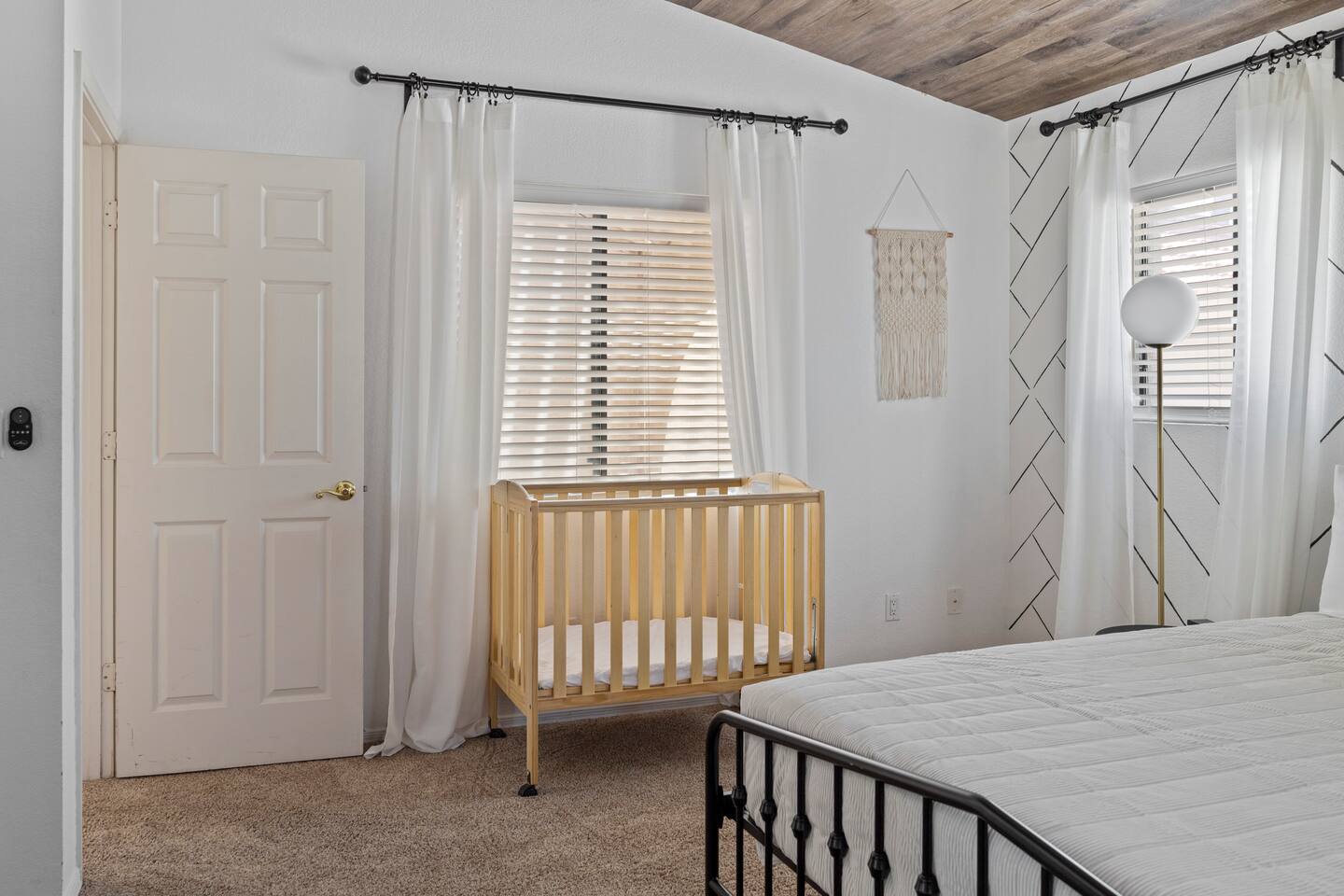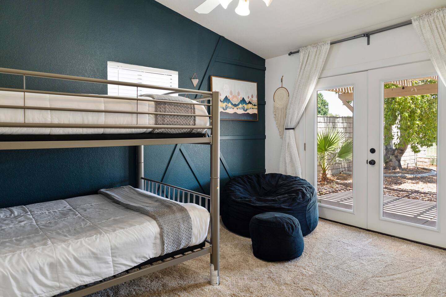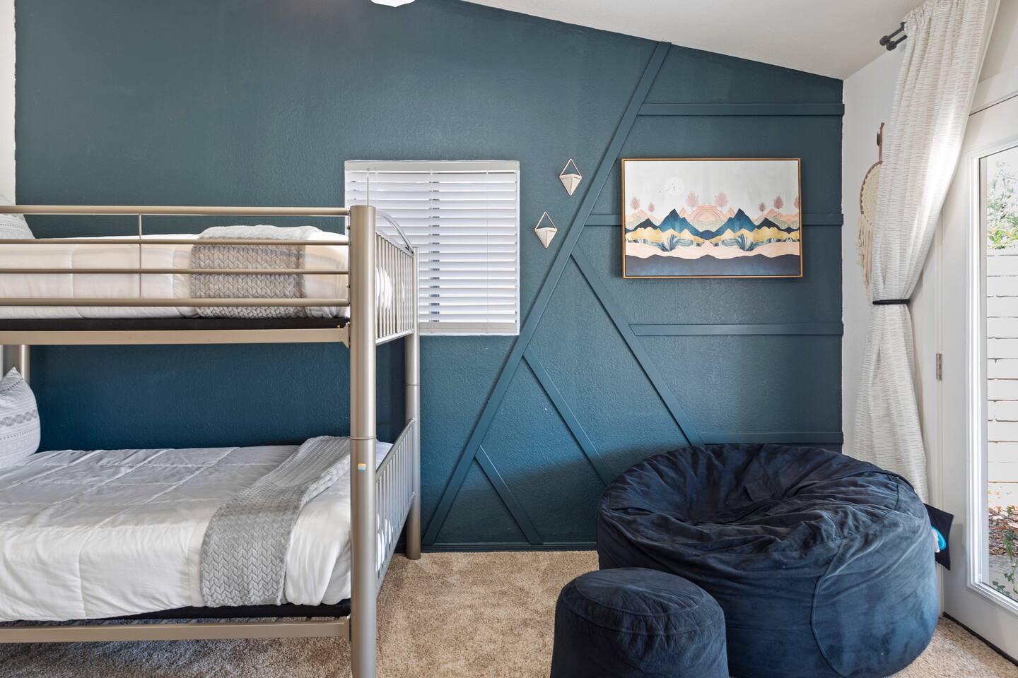 Three bedrooms all complete with a warm, modern Boho theme feature memory foam beds with two of the bedrooms having French doors out to the backyard that overlooks the green belt to walk you pet or stroll to the nearby lake. The long driveway allows you to bring your water toys. A shuffleboard table, dartboard, smartTV, board games can keep you or the kids occupied. Master bedroom: Cal King bed, attached bath, smartTV, baby crib, pet crate Bedroom 2: Full-over-full bunk beds Bedroom 3: Queen bed Pets are welcome, we charge a $100 pet fee for the extra cleaning (two dogs max, no cats)