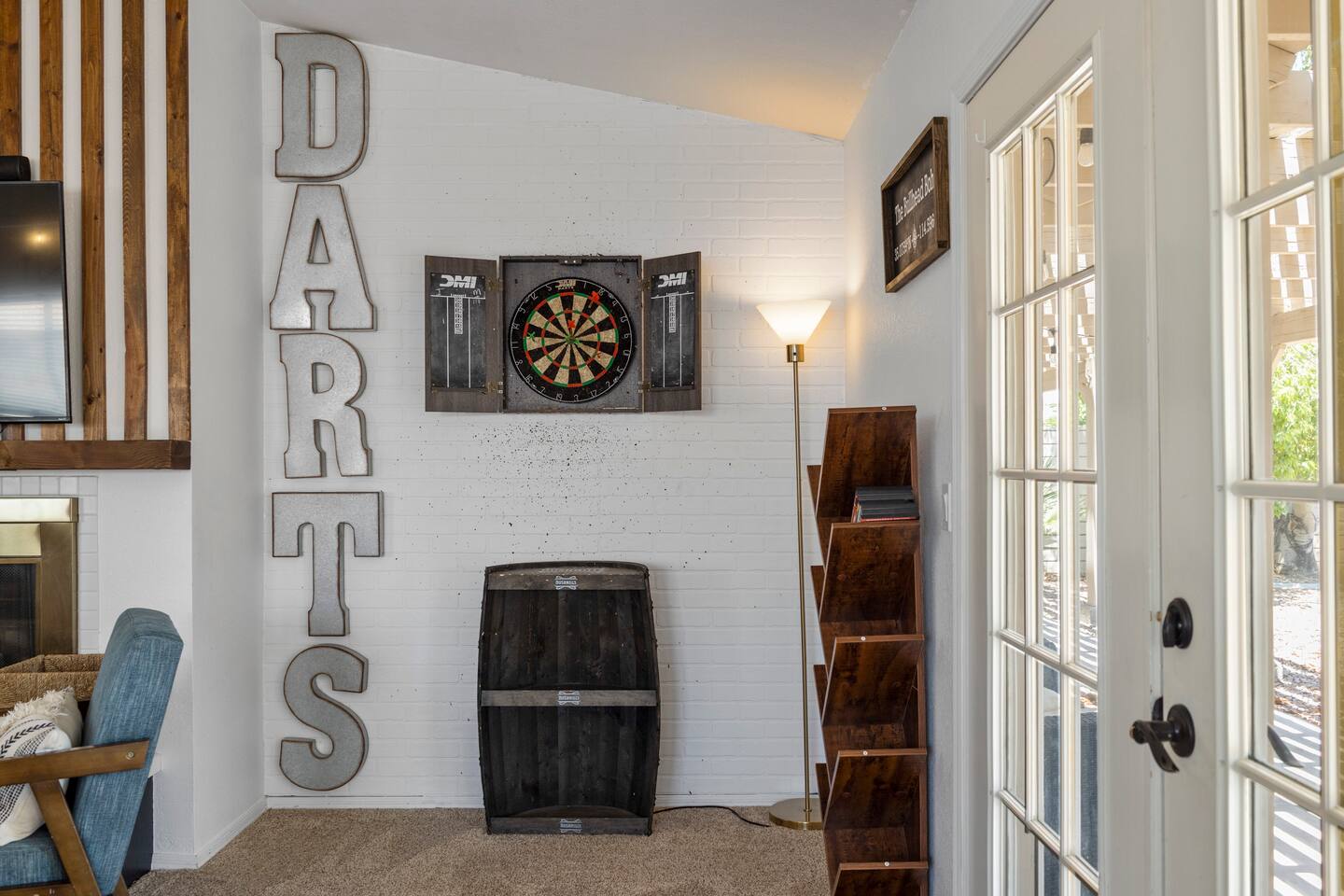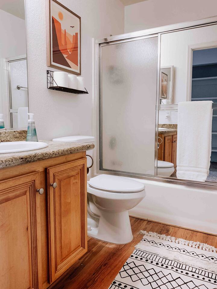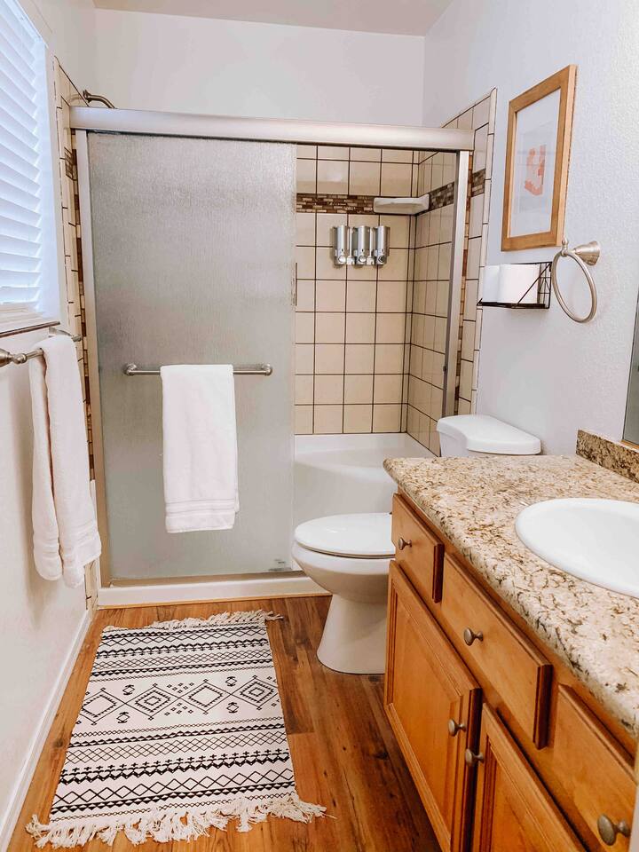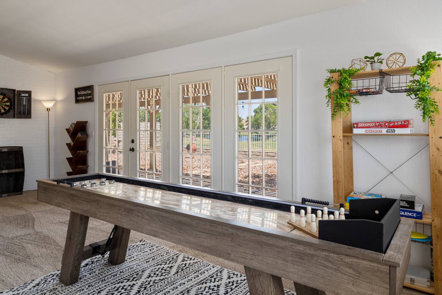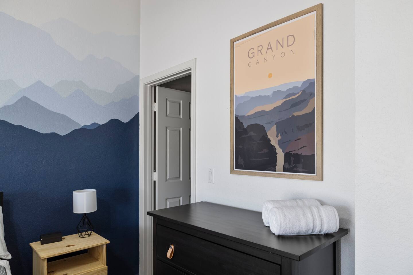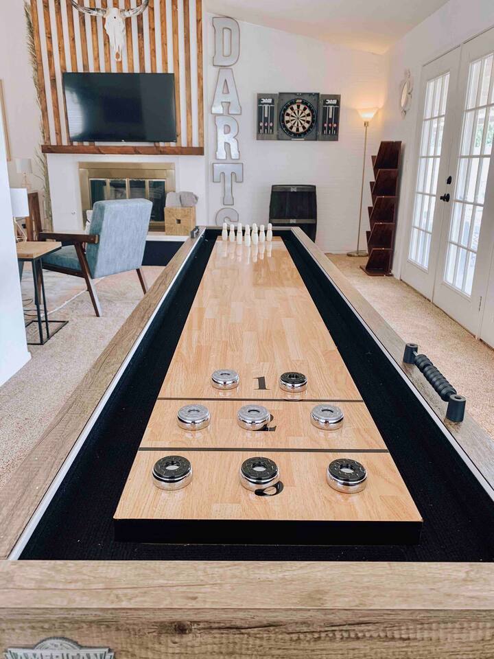 Three bedrooms all complete with a warm, modern Boho theme feature memory foam beds with two of the bedrooms having French doors out to the backyard that overlooks the green belt to walk you pet or stroll to the nearby lake. The long driveway allows you to bring your water toys. A shuffleboard table, dartboard, smartTV, board games can keep you or the kids occupied. Master bedroom: Cal King bed, attached bath, smartTV, baby crib, pet crate Bedroom 2: Full-over-full bunk beds Bedroom 3: Queen bed Pets are welcome, we charge a $100 pet fee for the extra cleaning (two dogs max, no cats)