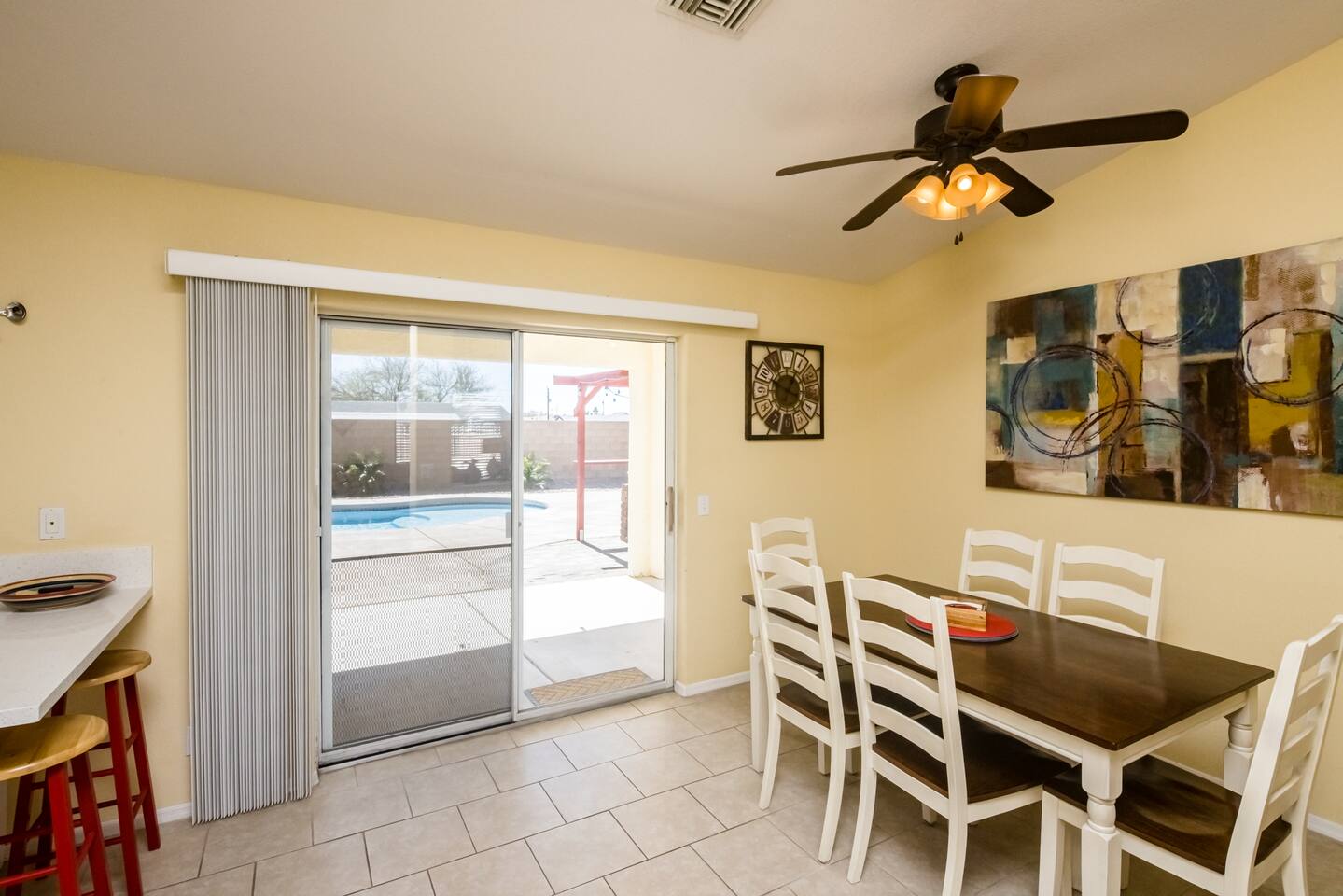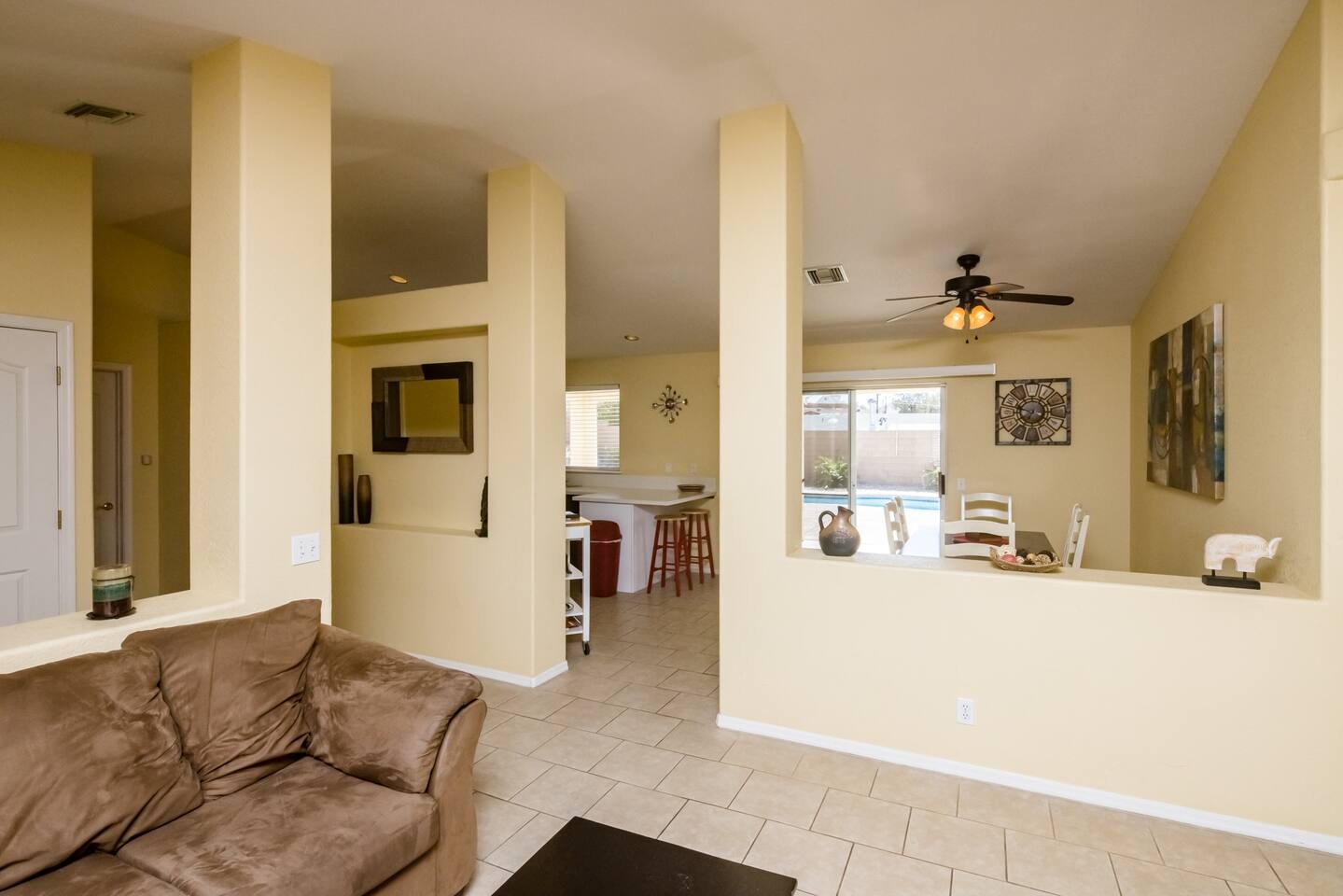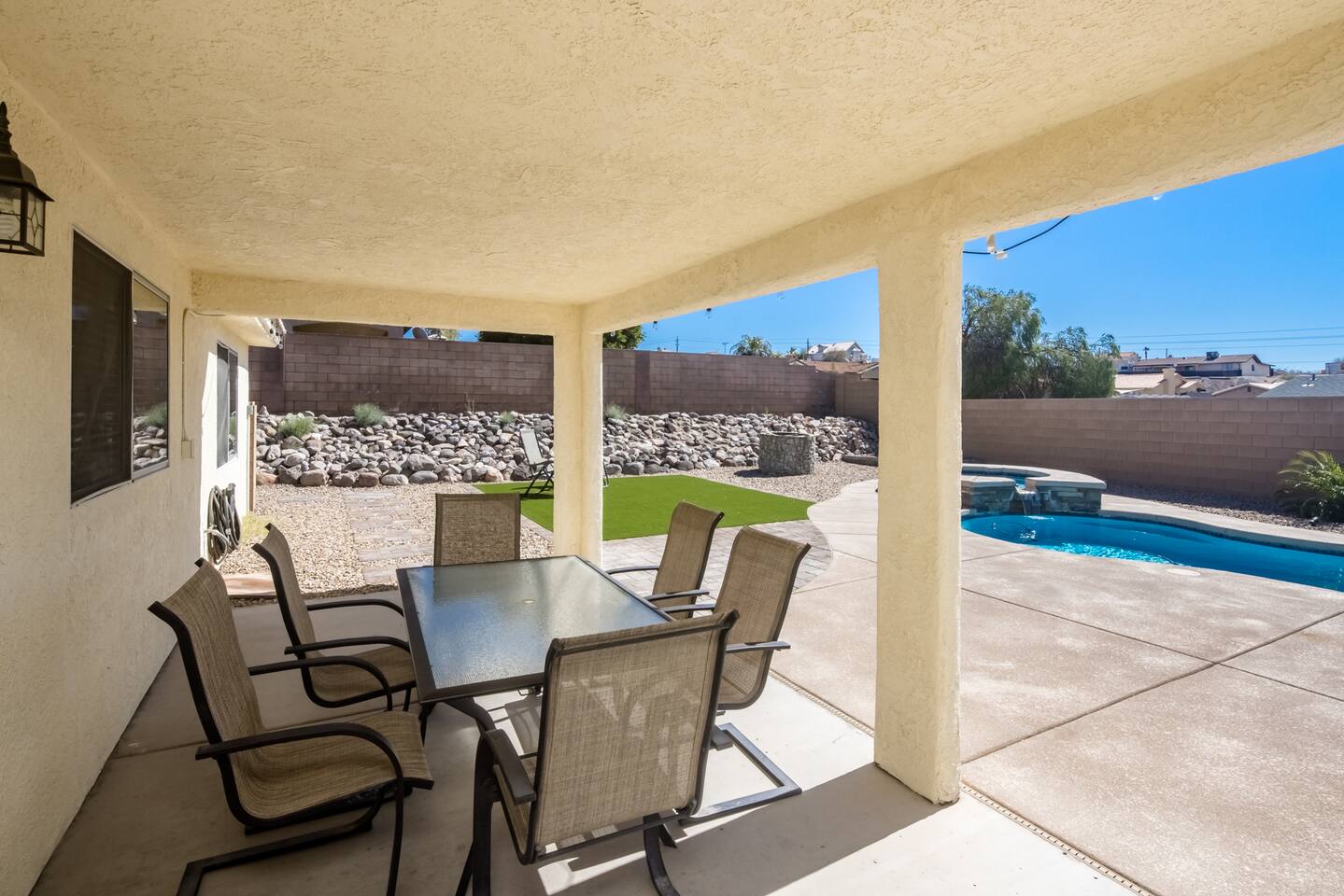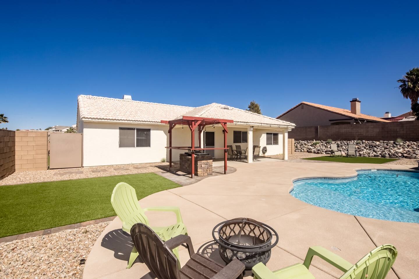 You'll enter the three bedroom, two bath house and immediately notice the clean and bright vibes of the living room. To the right you'll find the bedrooms and a bathroom. The master has a large, queen bed, second bedroom has a queen bed and the third has twin bunk beds. Back to the kitchen which is fully stocked, you'll instantly be drawn to the backyard through the slider with the pool, spa and a few areas of grass to lay out a towel and get some vitamin D. There's also a BBQ for you to use just off the slider as well. The pool is not available for heating at this time but you’re welcome to use the jacuzzi.