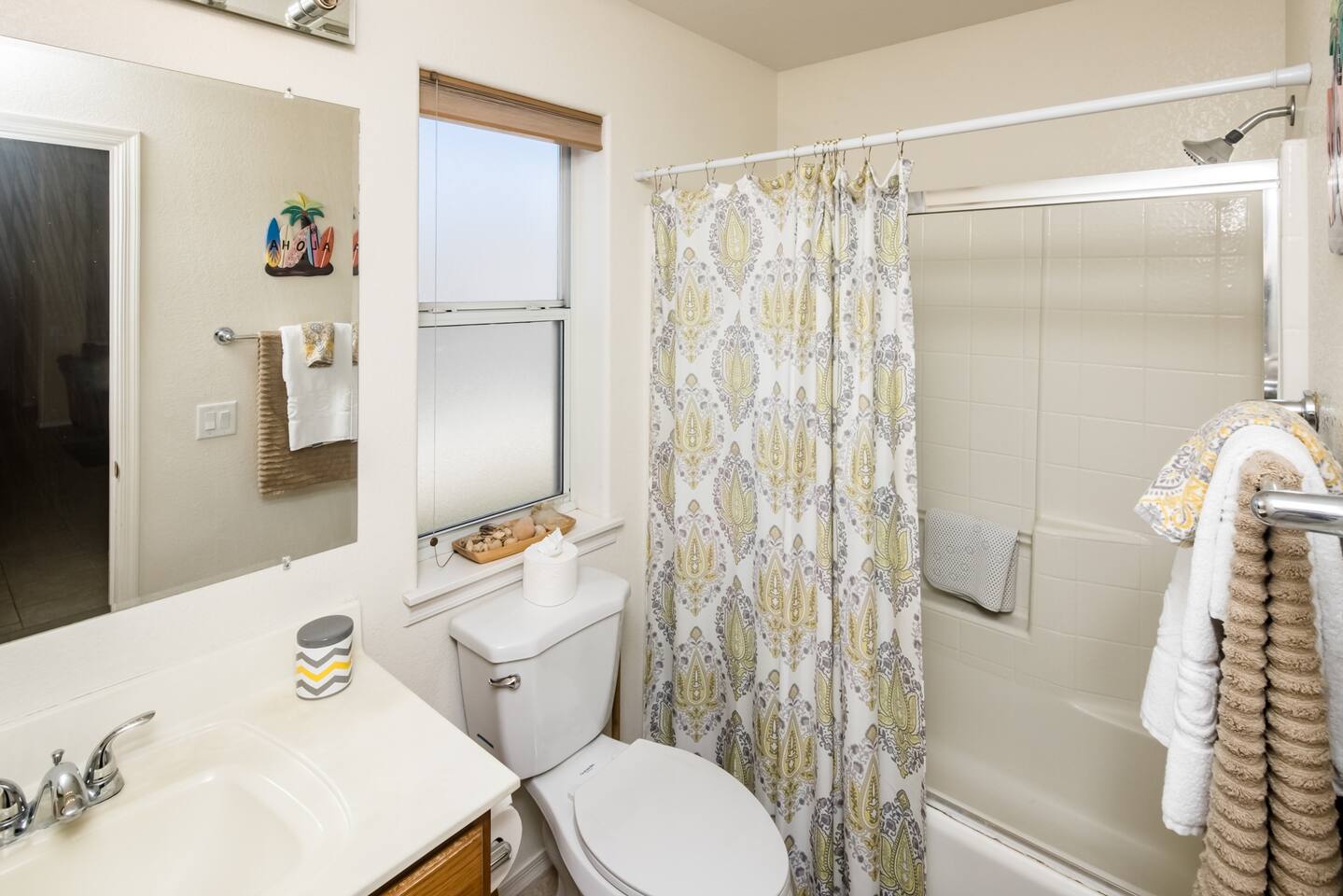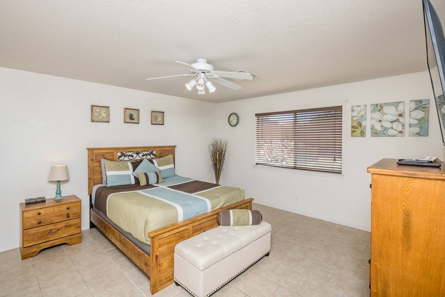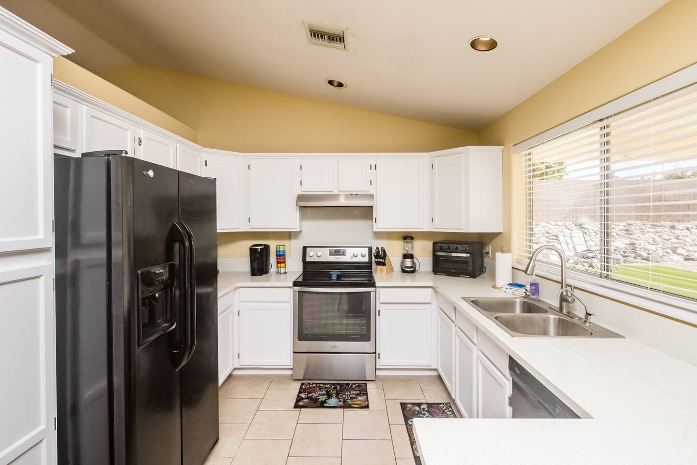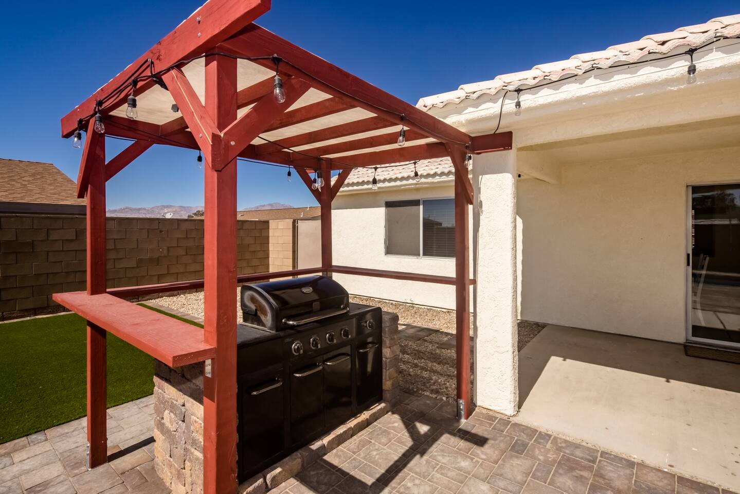 You'll enter the three bedroom, two bath house and immediately notice the clean and bright vibes of the living room. To the right you'll find the bedrooms and a bathroom. The master has a large, queen bed, second bedroom has a queen bed and the third has twin bunk beds. Back to the kitchen which is fully stocked, you'll instantly be drawn to the backyard through the slider with the pool, spa and a few areas of grass to lay out a towel and get some vitamin D. There's also a BBQ for you to use just off the slider as well. The pool is not available for heating at this time but you’re welcome to use the jacuzzi.
