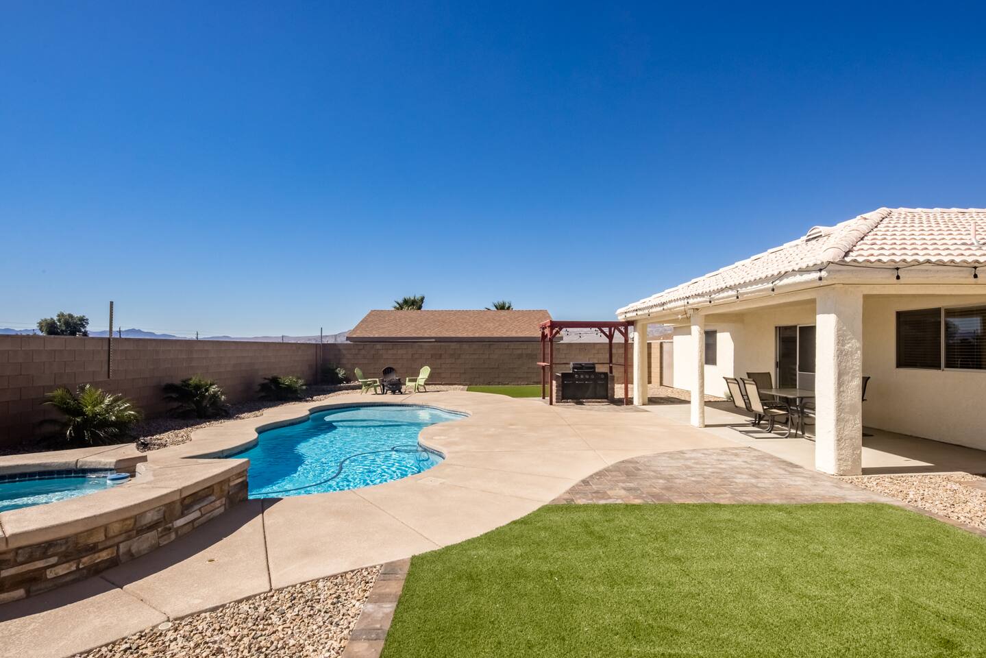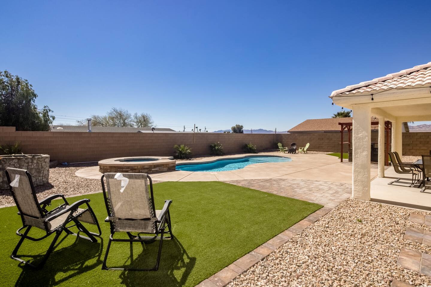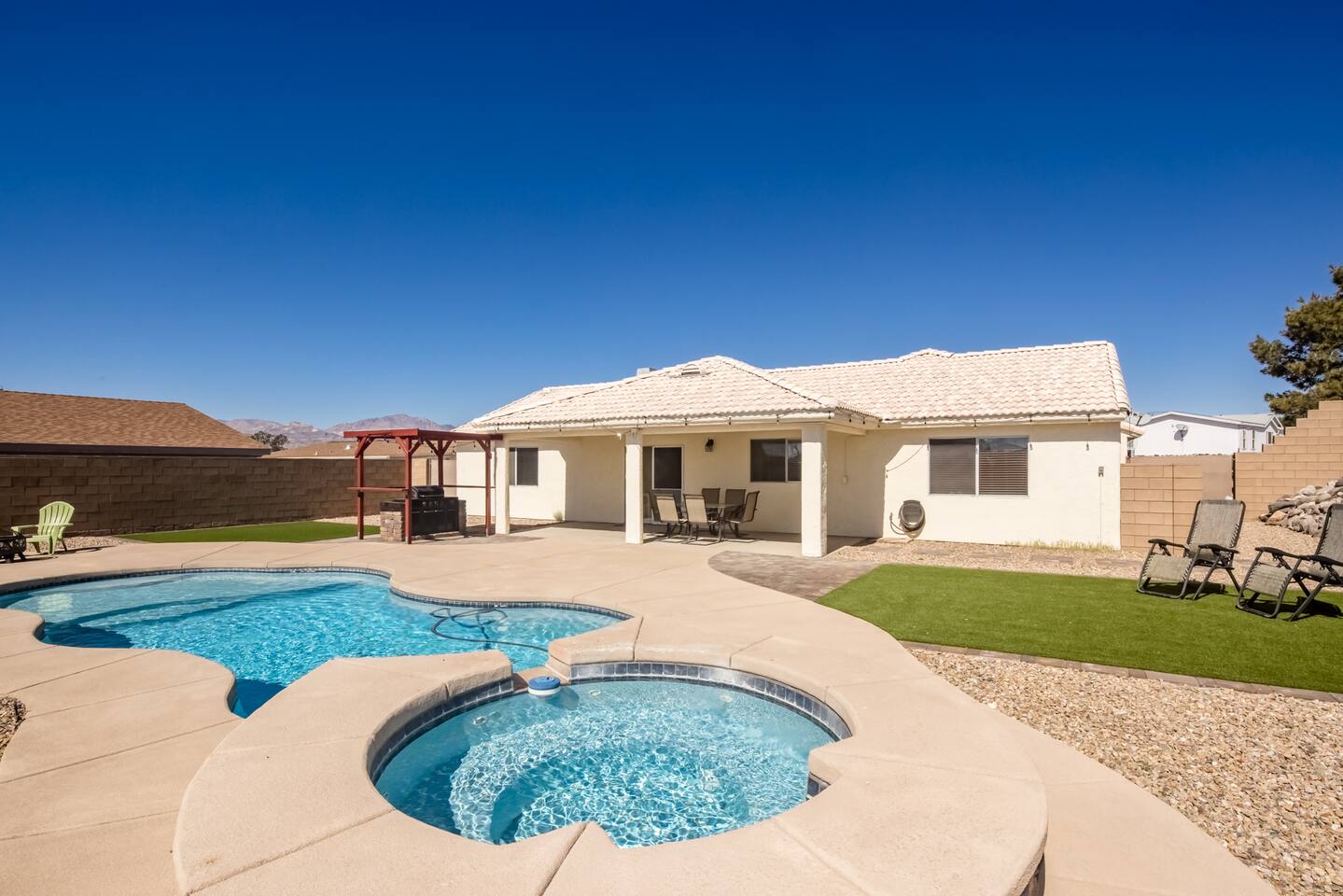 Check in, relax and unwind at "The Tropics in Bullhead"! Our three-bedroom, two bath home sits on an over 10,000 square foot lot with an in-ground pool with Baja shelf as well as a jacuzzi for those nights after a day on the river or lake. Inside you'll find all the comforts of home with comfy beds, full kitchen and TV's in almost every bedroom. We love to unwind here whenever we can and hope you and your family make treasured memories as well!
