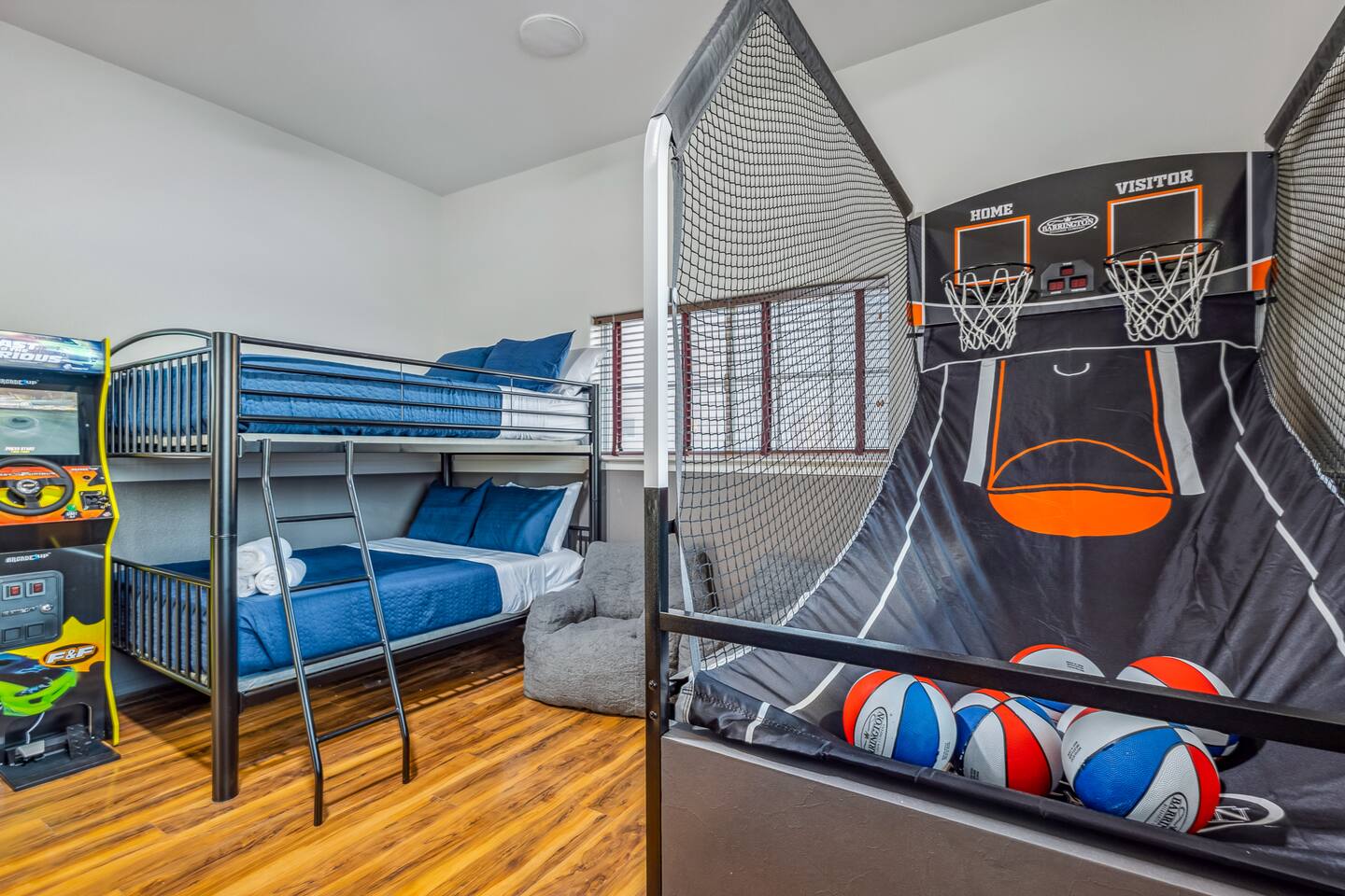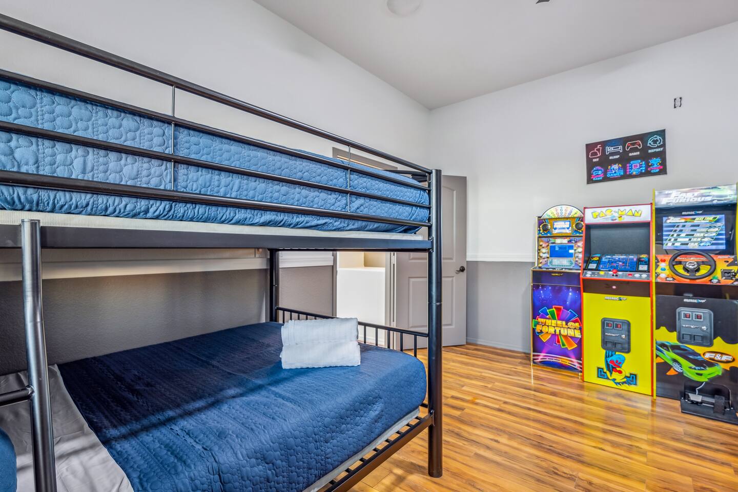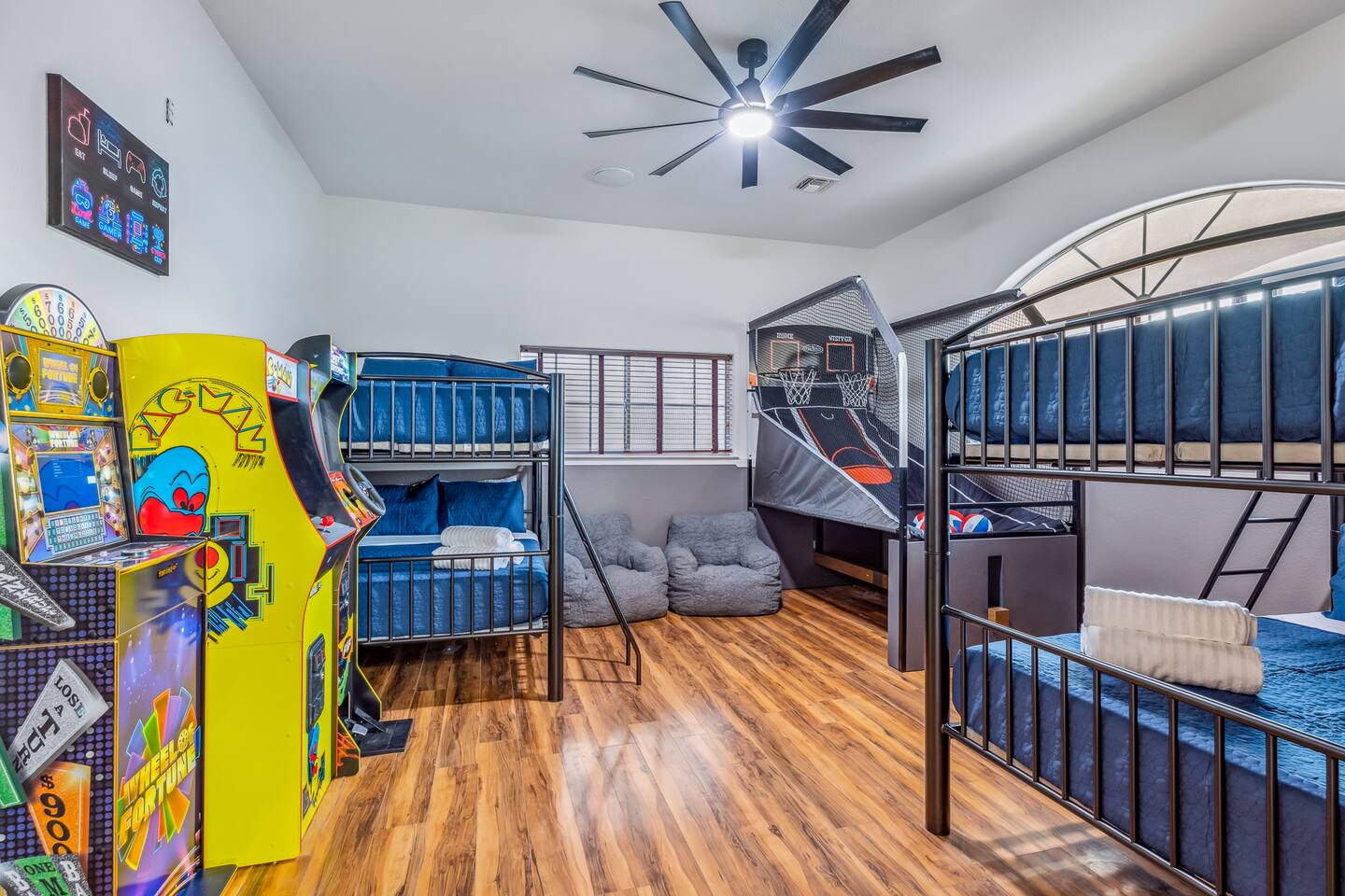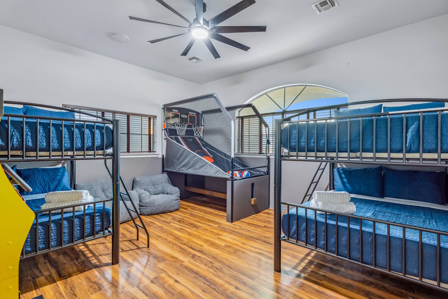 You'll enter the home and immediately to the right find the large game room with full-over-full bunk beds and arcade games such as Wheel of Fortune, Pac-Man, Fast and the Furious, and basketball hoops. The large living room sectional allows the family to stretch out and enjoy their favorite streaming apps on the smart TV. On the west side of the house are two of the bedrooms with one of them having two full beds and the other one having a king bed. The bedroom with the king bed has direct access to the patio as well. On the other side of the property is the master bedroom with king bed, smart TV patio doors out to the patio and large, open walk-in shower. Bedroom Layout: Bedroom 1 (game room): (2) Full over full bunk beds (Sleeps 8) Bedroom 2: with smart TV (2) Full beds (Sleeps 4) Bedroom 3: with smart TV (1) King bed (Sleeps 2) Master bedroom: with smart TV (1) King bed (Sleeps 2) Total: Sleeps 16