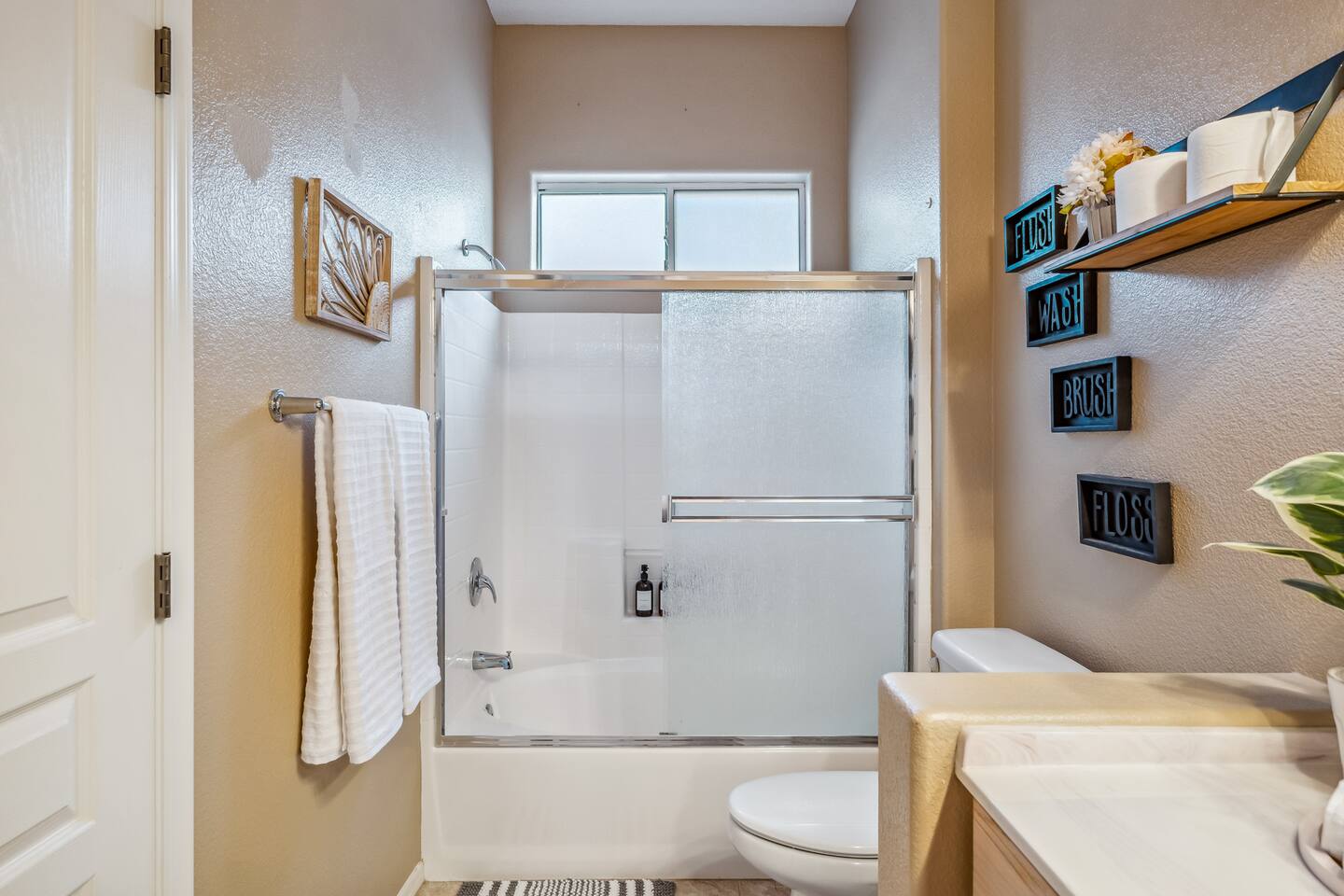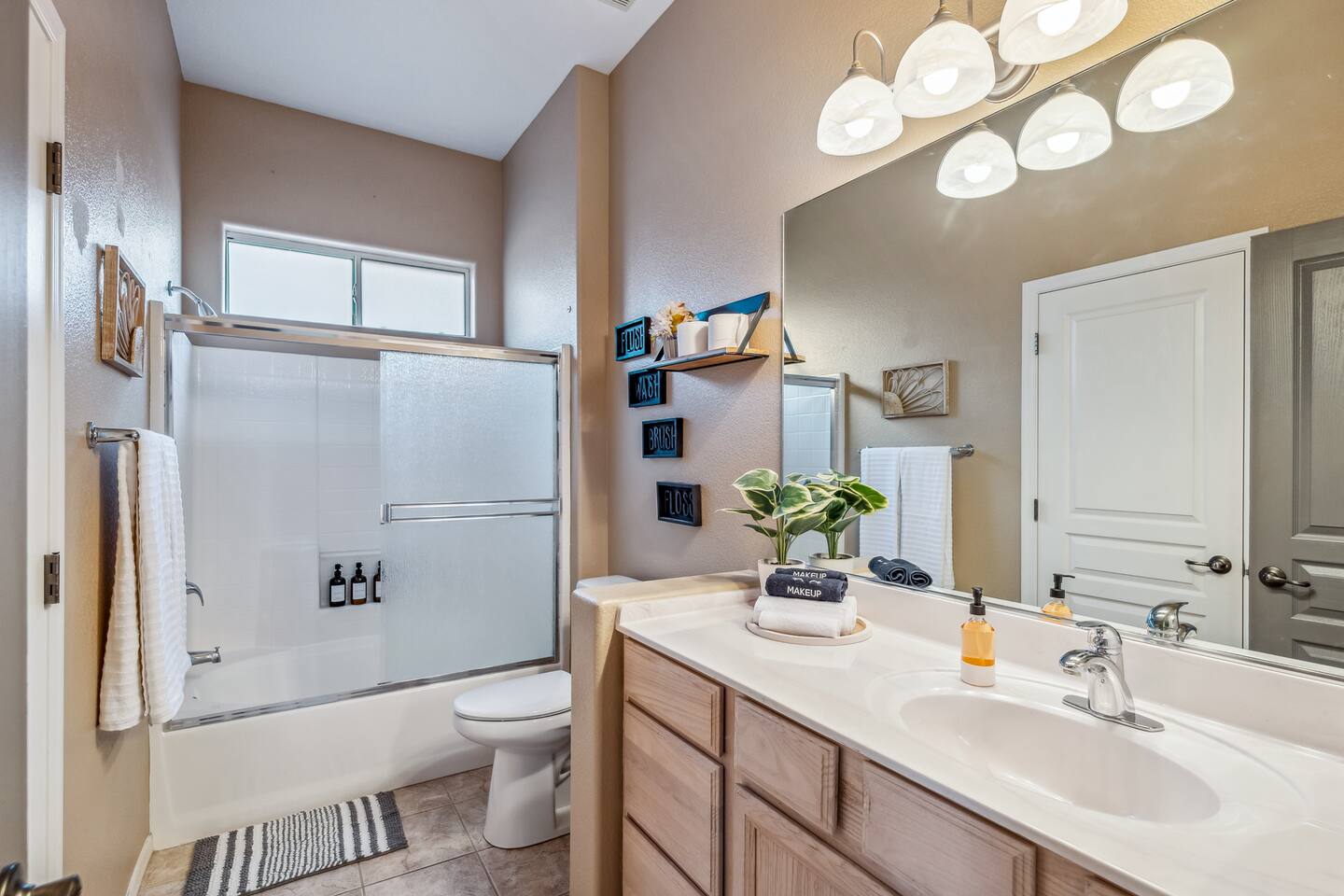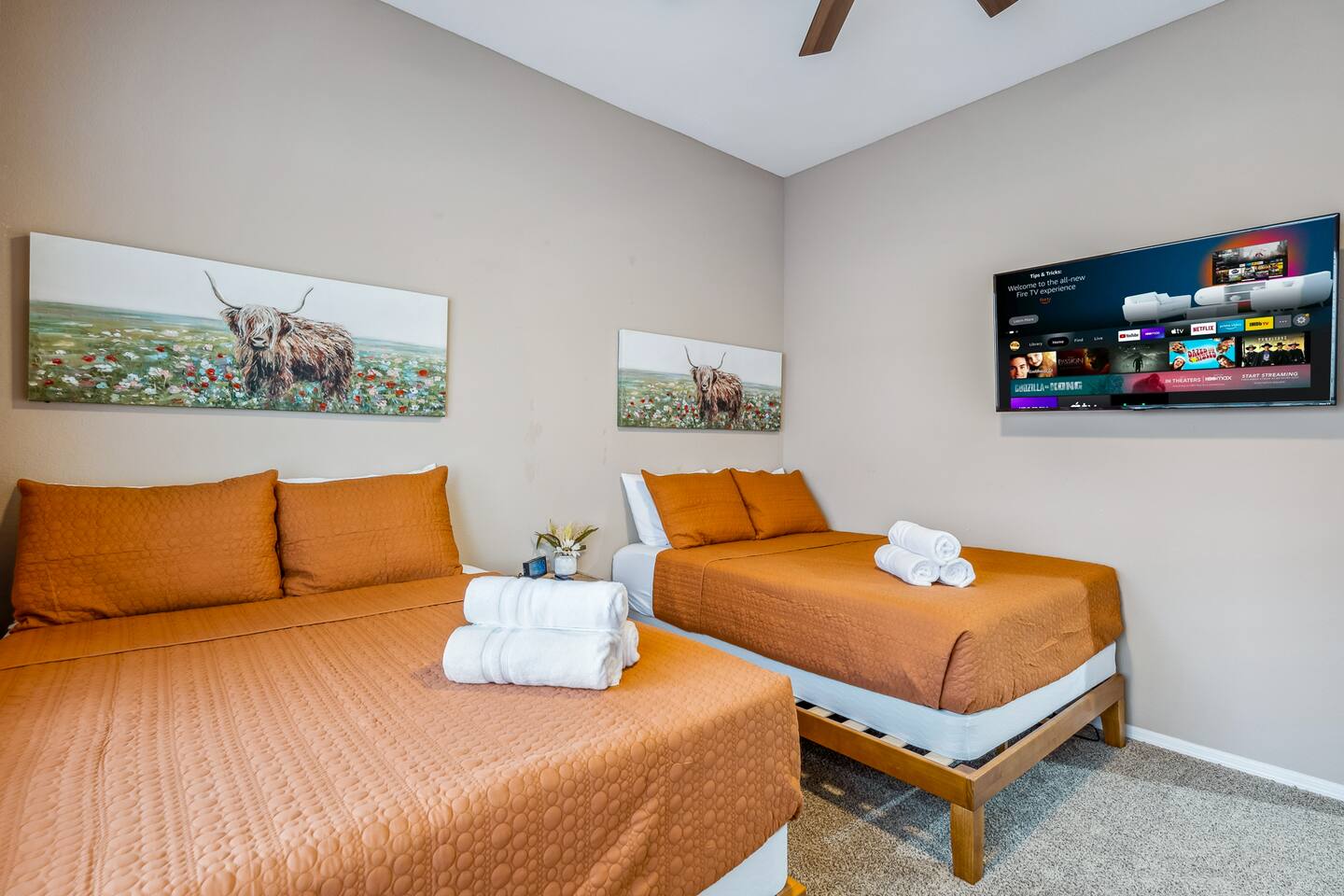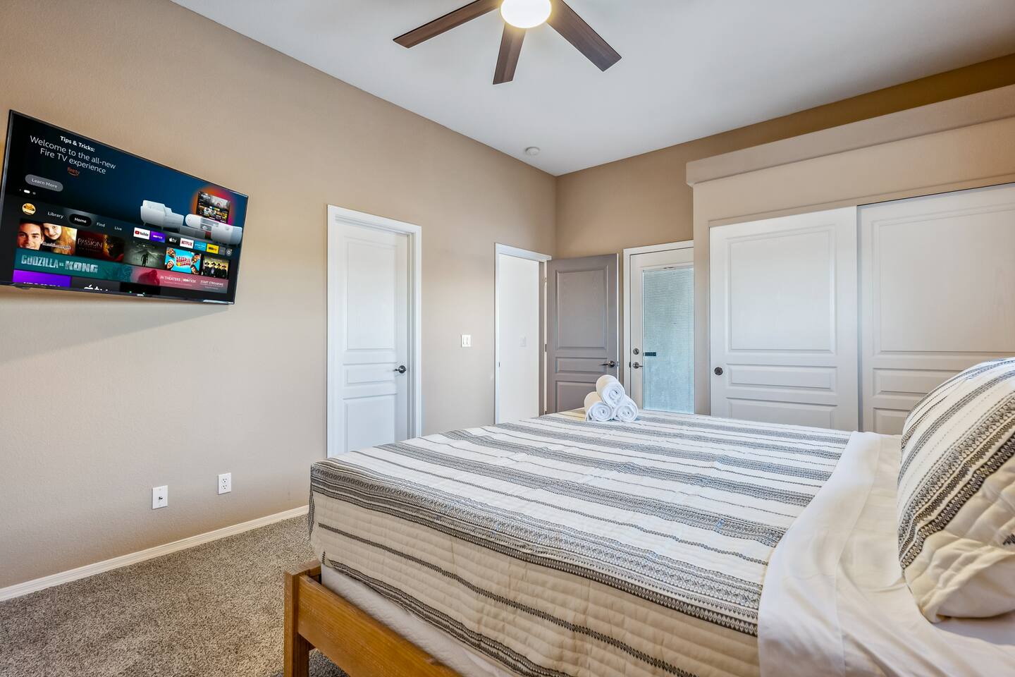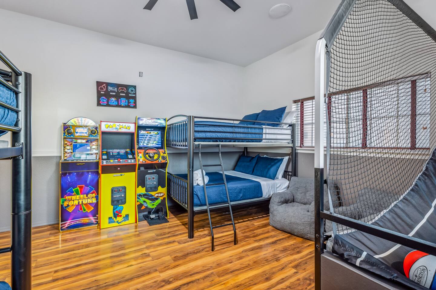 You'll enter the home and immediately to the right find the large game room with full-over-full bunk beds and arcade games such as Wheel of Fortune, Pac-Man, Fast and the Furious, and basketball hoops. The large living room sectional allows the family to stretch out and enjoy their favorite streaming apps on the smart TV. On the west side of the house are two of the bedrooms with one of them having two full beds and the other one having a king bed. The bedroom with the king bed has direct access to the patio as well. On the other side of the property is the master bedroom with king bed, smart TV patio doors out to the patio and large, open walk-in shower. Bedroom Layout: Bedroom 1 (game room): (2) Full over full bunk beds (Sleeps 8) Bedroom 2: with smart TV (2) Full beds (Sleeps 4) Bedroom 3: with smart TV (1) King bed (Sleeps 2) Master bedroom: with smart TV (1) King bed (Sleeps 2) Total: Sleeps 16