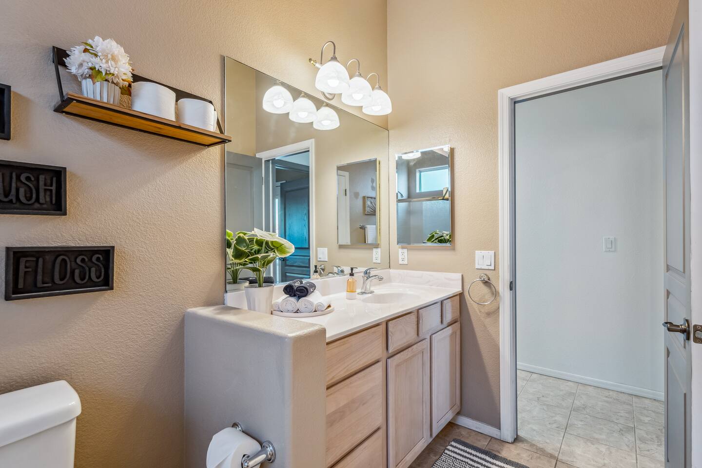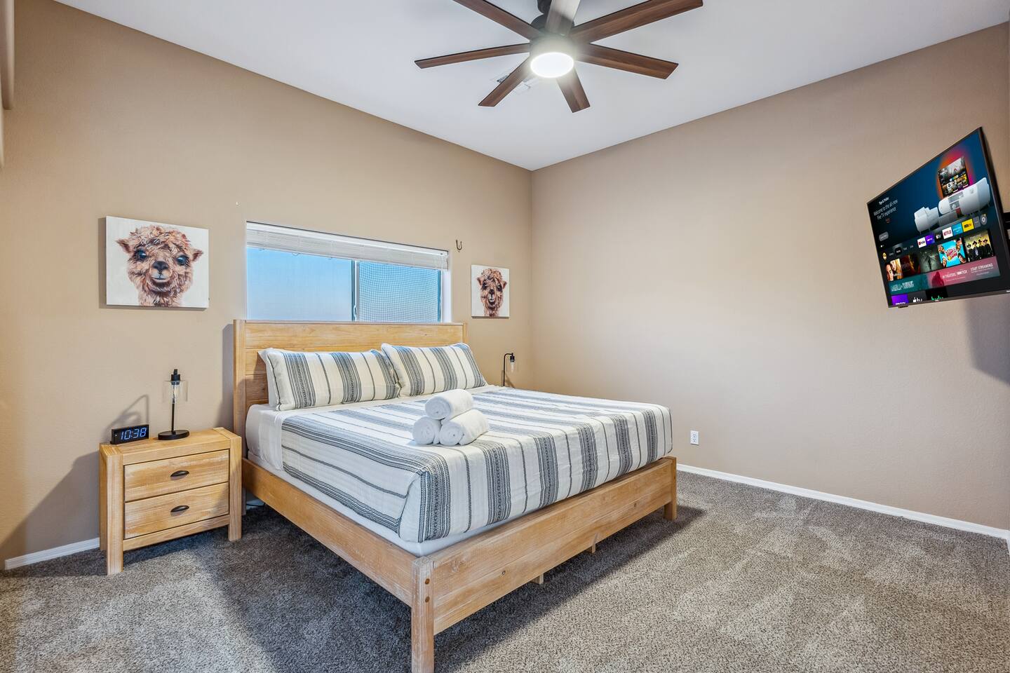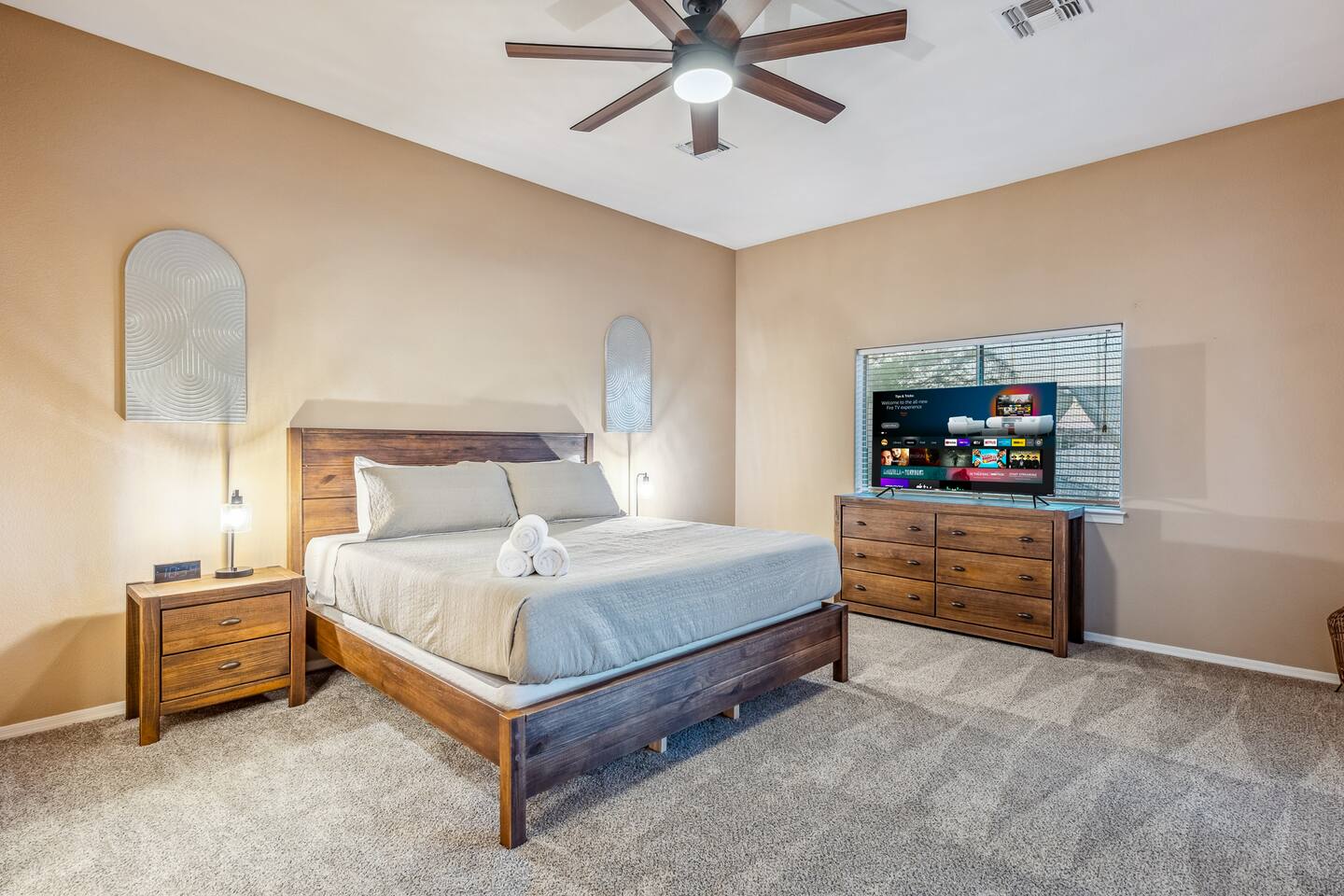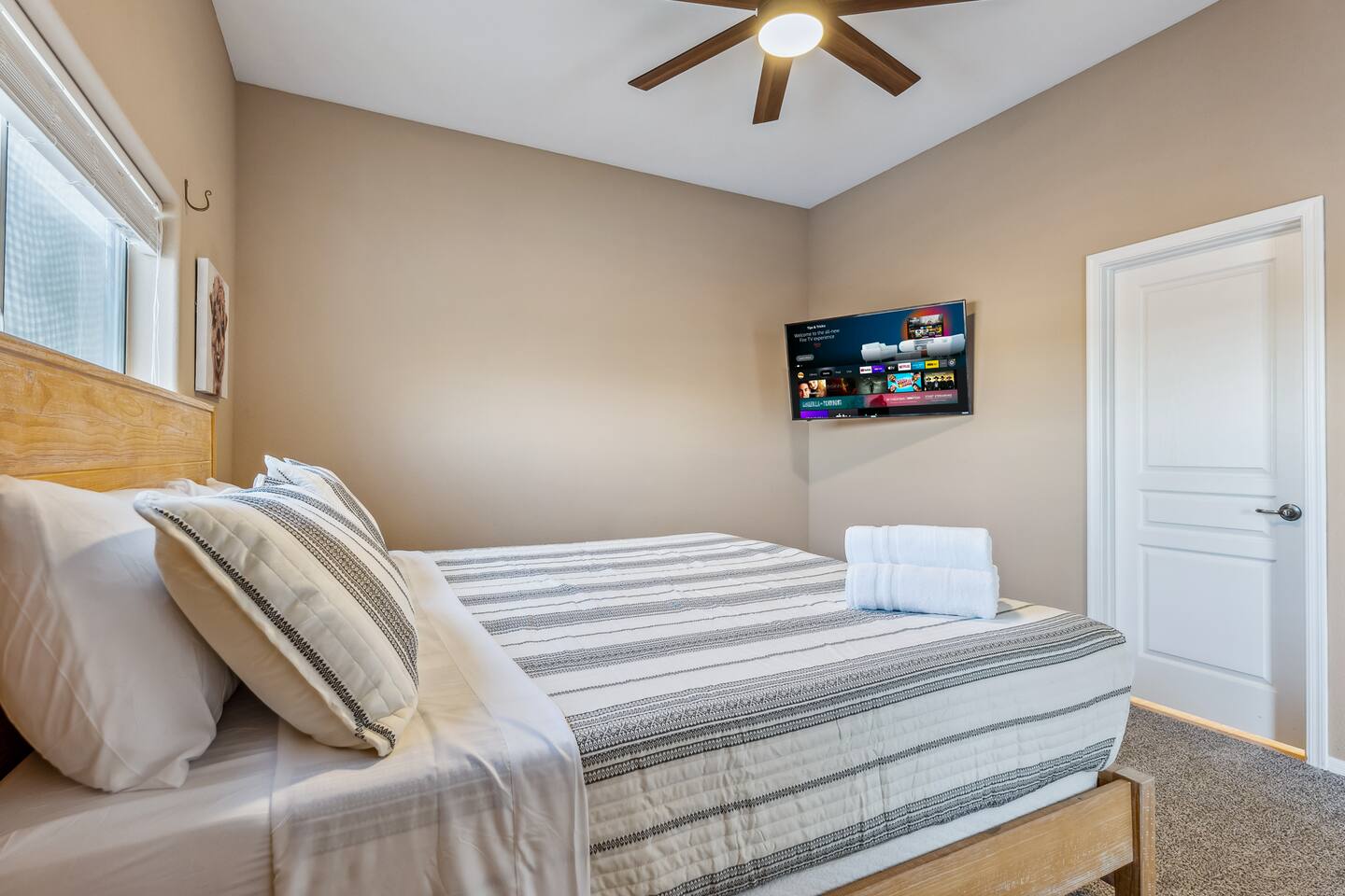 You'll enter the home and immediately to the right find the large game room with full-over-full bunk beds and arcade games such as Wheel of Fortune, Pac-Man, Fast and the Furious, and basketball hoops. The large living room sectional allows the family to stretch out and enjoy their favorite streaming apps on the smart TV. On the west side of the house are two of the bedrooms with one of them having two full beds and the other one having a king bed. The bedroom with the king bed has direct access to the patio as well. On the other side of the property is the master bedroom with king bed, smart TV patio doors out to the patio and large, open walk-in shower. Bedroom Layout: Bedroom 1 (game room): (2) Full over full bunk beds (Sleeps 8) Bedroom 2: with smart TV (2) Full beds (Sleeps 4) Bedroom 3: with smart TV (1) King bed (Sleeps 2) Master bedroom: with smart TV (1) King bed (Sleeps 2) Total: Sleeps 16